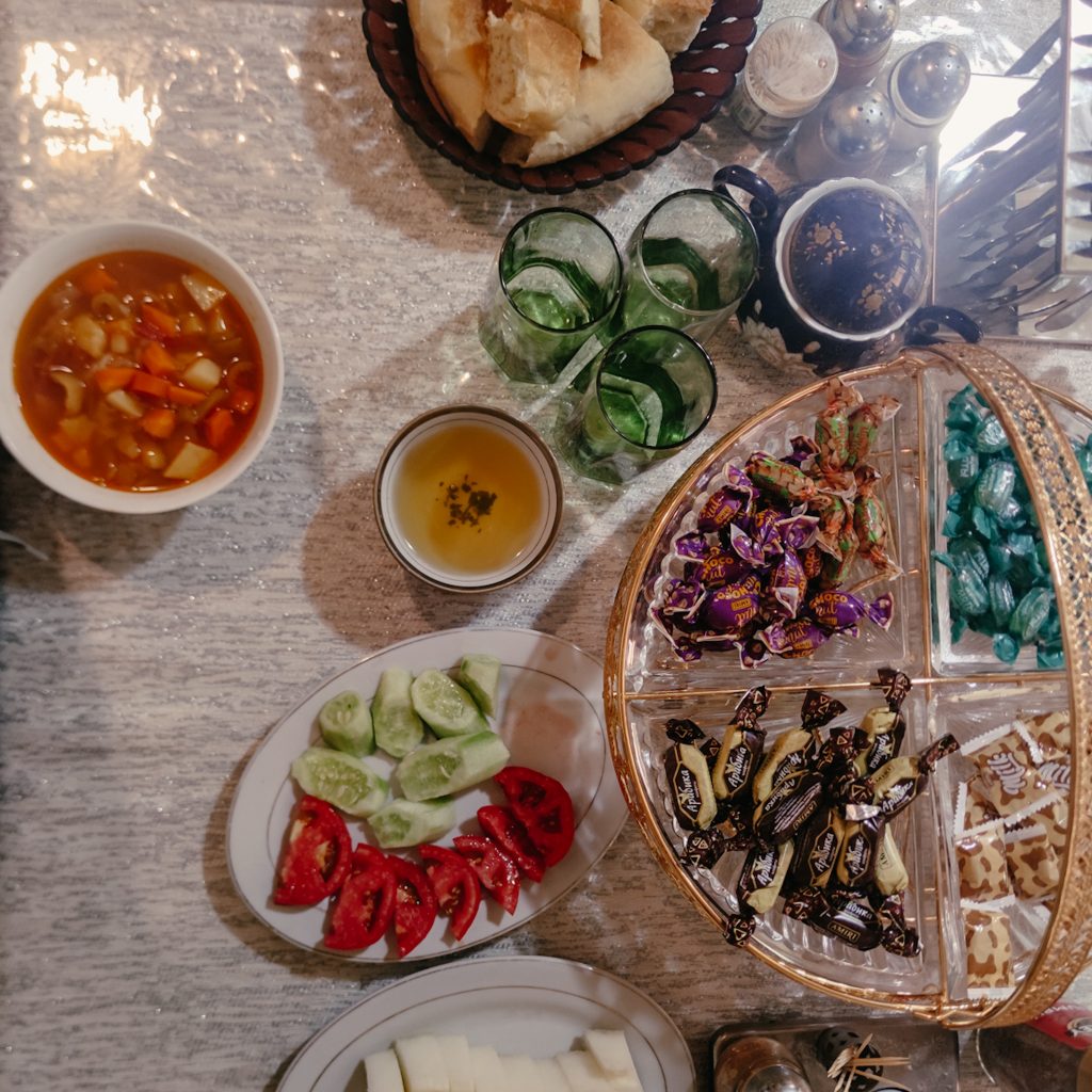Außerdem gibt’s noch etwas Melone zum Nachtisch, die von der Konsistenz etwas an Kohlrabi erinnert. Wir sind überrascht als die Hausdame dann noch mit einem Teller öligen Kartoffeln mit Koriandertopping rein kommt. Caro lässt den angebissenen Keks schnell unter dem Tisch verschwinden und lächelt mit vollem Keks-Mund. Upsi, es kommt noch mehr Essen? 🙈 Wenn wir das gewusst hätten, hätten wir vielleicht eine Scheibe Brot weniger verdrückt. Den Rest des Abends spielen wir Qwixx und Kniffel. Vom vielen grünen Tee sind wir noch wach und schauen noch den heruntergeladenen Film „The Alpinist“ bei Netflix (dringende Empfehlung!). Hier oben in Sarytag haben wir nämlich kein Internet mehr (das Haus des Präsidenten steht ja auch etwas weiter unten).