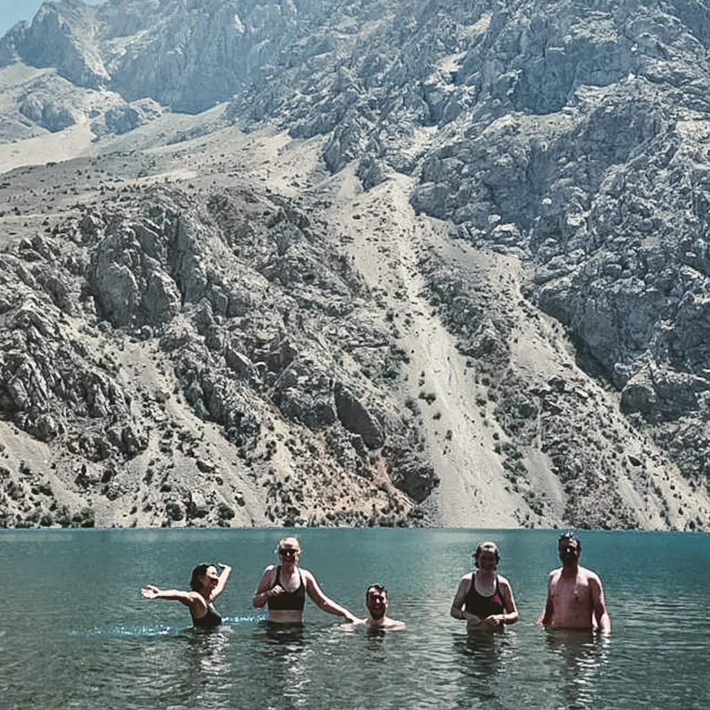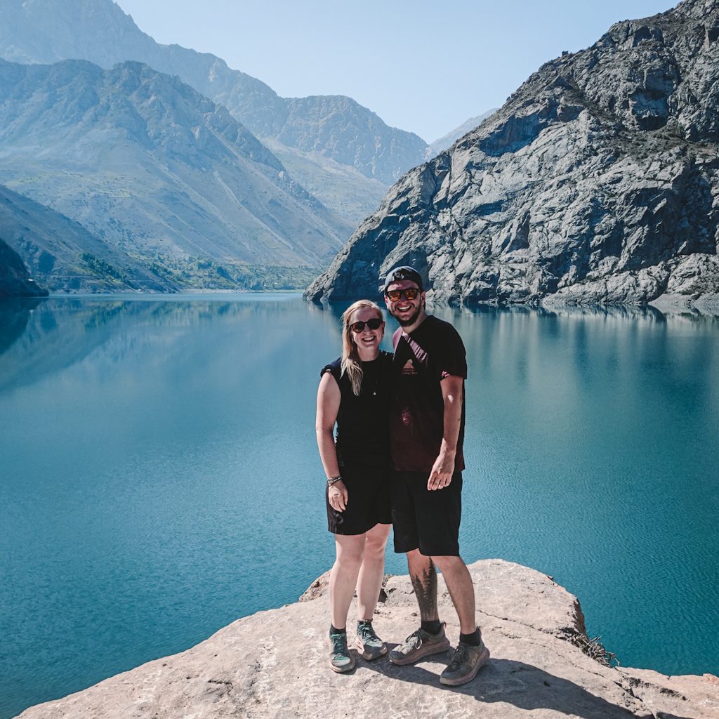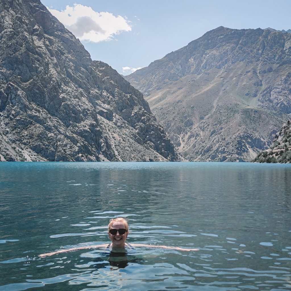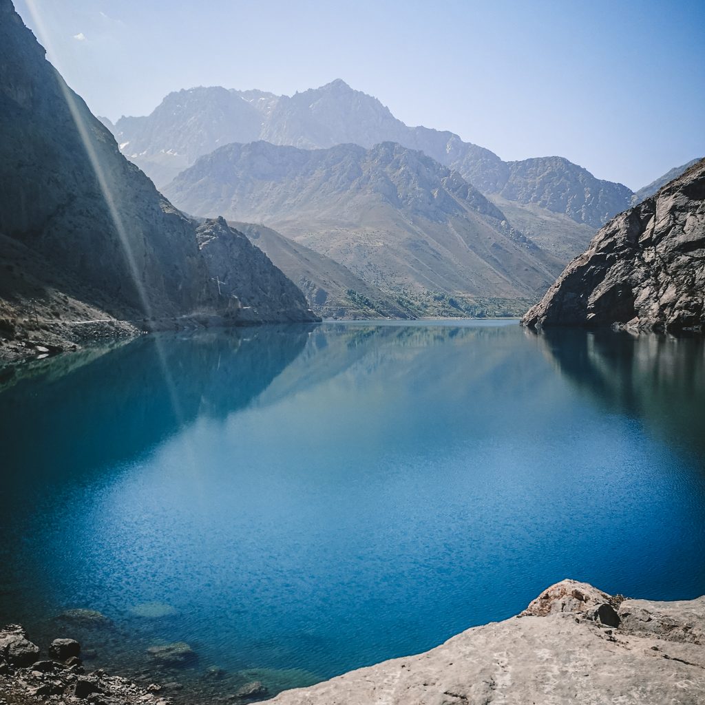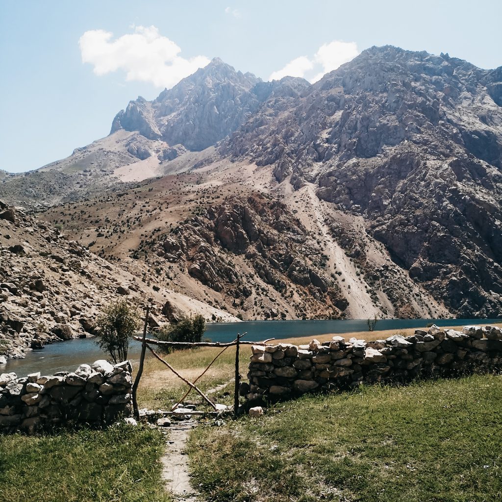 In Sarvoda, einem kleinen Dorf im nirgendwo angekommen, wartet schon unser Fahrer. Für den letzten Teil der Strecke haben wir das Angebot unserer Unterkunft angenommen, den Transport für uns zu organisieren. Den Preis von 250 So’m (20 Euro) haben wir wir noch etwas herunter gehandelt, aber da wir in ein Dorf noch hinter dem See müssen, kommen wir um eine Fahrt nicht drumherum. Der 4×4 Lada hat seine besten Tage schon hinter sich, aber das hat irgendwie auch seinen ganz besonderen Charme. Wir tanken, nehmen noch eine weitere Person mit (die btw 50 So’m für die Strecke bis zum See zahlt) und machen noch einen kurzen Zwischenstopp, man möchte dann doch gerne noch einen Tee trinken (an die kleinen Stopps für so etwas, muss man sich gewöhnen). Dann kann die wilde Fahrt in die Berge endlich losgehen. Nach ca. 1 Stunde Fahrt erblicken wir den Iskanderkulsee. Wir fahren einmal um den See herum und überqueren noch einen Berg.