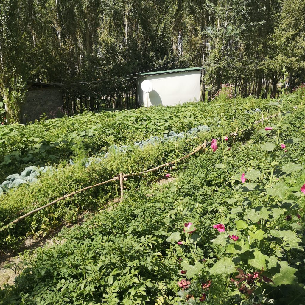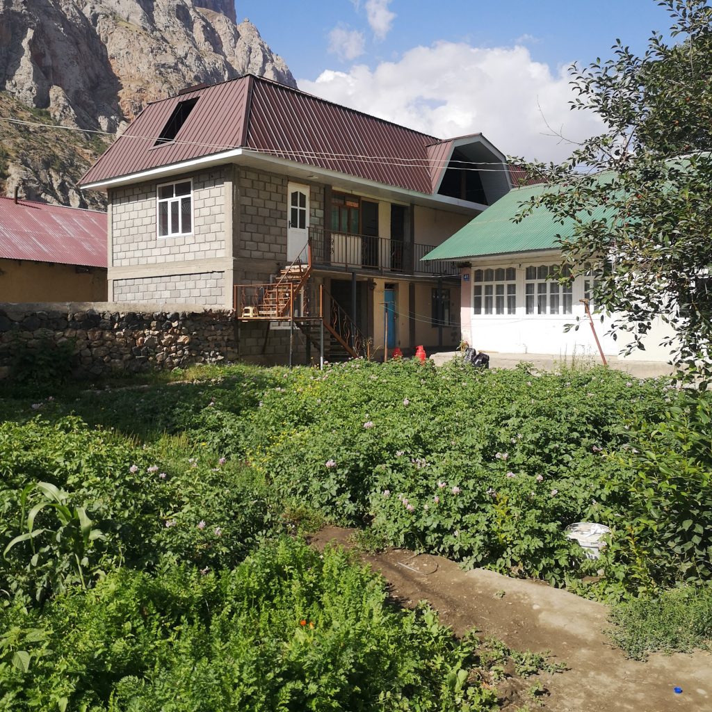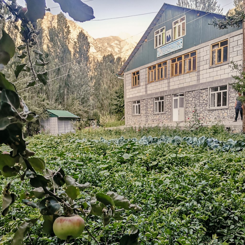 Wir laufen an vielen Kirsch- und Aprikosenbäumen vorbei, sie sind voll mit reifen Früchten. Von hinten ruft jemand. Wir bleiben stehen und ein kleines Mädchen kommt angerannt. Sie strahlt übers ganze Gesicht und drückt Caro eine Hand voller reifer Aprikosen in die Hand. Dann zieht sie Caro noch ein Stück weiter zu sich herunter, umarmt sie, drückt ihr einen Kuss auf die Wange und läuft dann wieder weg. So eine süße Begegnung und ohne Witz: Das waren die aromatischsten und besten Aprikosen, die wir je gegessen haben! Gegen Ende des vierten Sees laufen wir rechts den Berg hoch zu unserem Homestay. Schon die Einfahrt ist mit Aprikosen- und Apfelbäumen gesäumt. Wir werden mit einem strahlenden Lächeln vom Besitzer Jumaboy begrüßt, na klar können wir hier übernachten. Juma heißt auf tadschikisch übrigens Freitag und da er an einem Freitag geboren wurde, ist er eben Jumaboy. Vor dem Haus ist ein riesiger Garten, voll mit Tomaten-, Kartoffel-, Kohl-, Rote-Beete- und Zucchini-Pflanzen. Ein kleines Paradies, aber klar, hier oben versorgen sich die Menschen wahrscheinlich zum Großteil selbst mit vielen Nahrungsmitteln.
