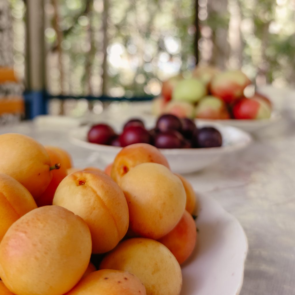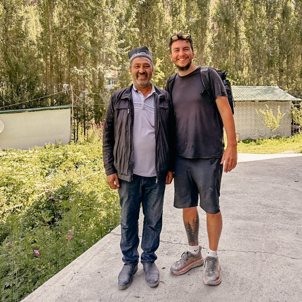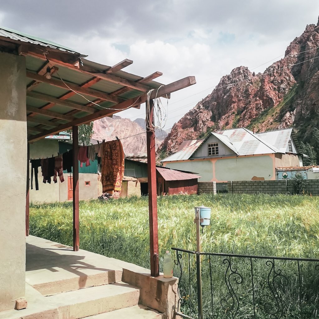 Wir laufen an vielen Kirsch- und Aprikosenbäumen vorbei, sie sind voll mit reifen Früchten. Von hinten ruft jemand. Wir bleiben stehen und ein kleines Mädchen kommt angerannt. Sie strahlt übers ganze Gesicht und drückt Caro eine Hand voller reifer Aprikosen in die Hand. Dann zieht sie Caro noch ein Stück weiter zu sich herunter, umarmt sie, drückt ihr einen Kuss auf die Wange und läuft dann wieder weg. So eine süße Begegnung und ohne Witz: Das waren die aromatischsten und besten Aprikosen, die wir je gegessen haben! Gegen Ende des vierten Sees laufen wir rechts den Berg hoch zu unserem Homestay. Schon die Einfahrt ist mit Aprikosen- und Apfelbäumen gesäumt. Wir werden mit einem strahlenden Lächeln vom Besitzer Jumaboy begrüßt, na klar können wir hier übernachten. Juma heißt auf tadschikisch übrigens Freitag und da er an einem Freitag geboren wurde, ist er eben Jumaboy. Vor dem Haus ist ein riesiger Garten, voll mit Tomaten-, Kartoffel-, Kohl-, Rote-Beete- und Zucchini-Pflanzen. Ein kleines Paradies, aber klar, hier oben versorgen sich die Menschen wahrscheinlich zum Großteil selbst mit vielen Nahrungsmitteln.