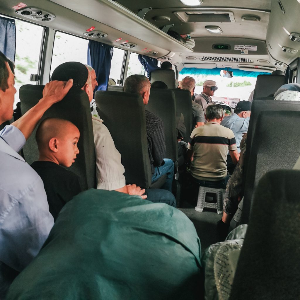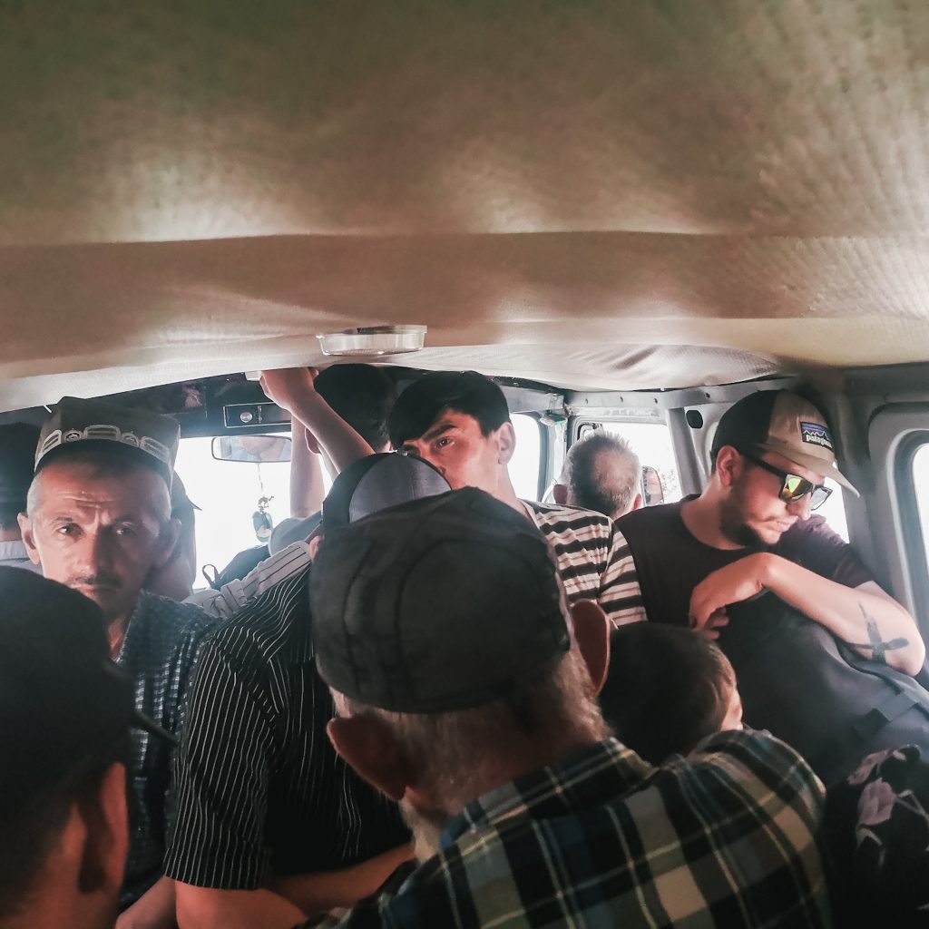 An der Chorbogh Terminal Taxi and Minibus Station angekommen, sehen wir schon aus dem Fenster, dass das kein Spaß wird. Hier tummeln sich Privatfahrer, die Fahrten nach Chudschand, Pandschakent und zum Iskanderkulsee anbieten. Als wir aussteigen, kommen die ersten Männer schon angerannt (und das ist wortwörtlich zu verstehen). Sie tummeln sich um Konsti und es kommen immer mehr dazu. Konsti erfragt den Preis: 700 So’m (ca. 58 Euro) zum Iskanderkulsee (für 2 Personen) und ein anderer offeriert 300 So’m (ca. 25 Euro) bis Sarvoda pro Person. Wir wollen erst bis Sarvoda mit einem Shared Taxi, danach müssen wir wieder einen neuen Fahrer finden. Wir erspähen einen kleinen AsianExpress Bus, der Bus, mit dem wir auch nach Duschanbe gefahren sind. Wir zahlen 50 So’m pro Person (4 Euro), aber das ist immer noch günstiger als die anderen Angebote. Wir quetschen uns mit unseren Rucksäcken in den Bus und finden noch zwei Plätze ganz hinten.