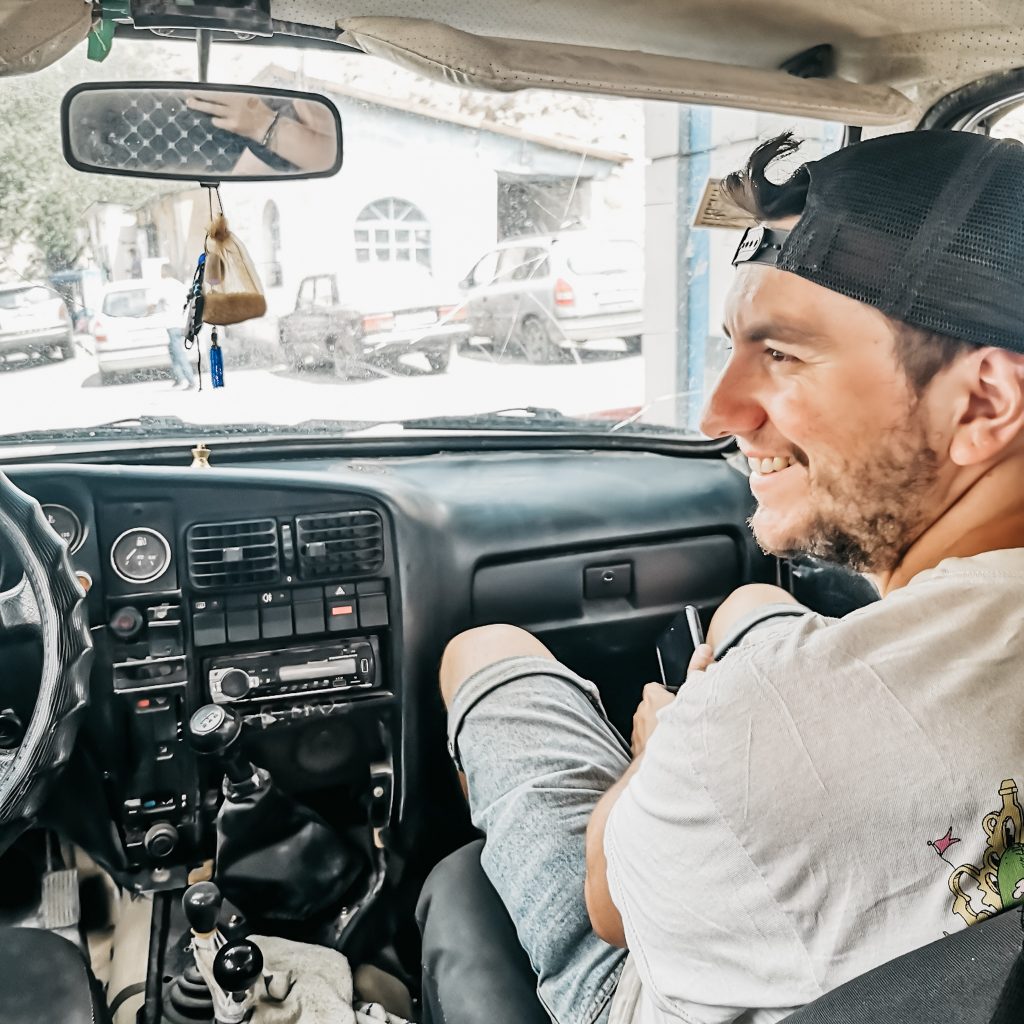 Ein Mann kommt auf uns zu und bietet uns an, uns ein Stück mitzunehmen. Er fährt zwar nicht nach Pandschakent, allerdings nach Chudschand, also zunächst in dieselbe Richtung. Er könne uns mitnehmen, bis die Straße sich erneut kreuzt. Natürlich ist diese Fahrt nicht kostenfrei, da es sich, wie wir feststellen um ein Shared Taxi handelt, aber Konsti verhandelt noch etwas den Preis und wir füllen die übrigen zwei Plätze auf der Rückbank aus. Wie immer geht es nicht sofort los. Erstmal wird noch getankt und ein Zwischenstopp eingelegt. Wofür oder warum? Keine Ahnung, vielleicht für einen kleinen Plausch, eine Zigarette und/oder einen Energydrink. Auf jeden Fall machen wir diese Erfahrung zu Beginn jeder Fahrt. Bei der Kreuzung angekommen, springt der Fahrer aus dem Auto und hält direkt den nächsten PKW an. Er und sein Beifahrer organisieren uns direkt die nächste Mitfahrgelegenheit während der weitere Mitfahrer von der Rückbank uns noch auf die Schnelle ein Brot schenkt. Weiter geht die Fahrt mit dem nächsten Fahrzeug, bei dem dringend der Kühlmittelstand geprüft werden sollte (da hier gefühlt jedes dritte Auto ein alter, aus Deutschland importierter Opel ist, sehen wir diese Anzeigen auf deutsch recht häufig).