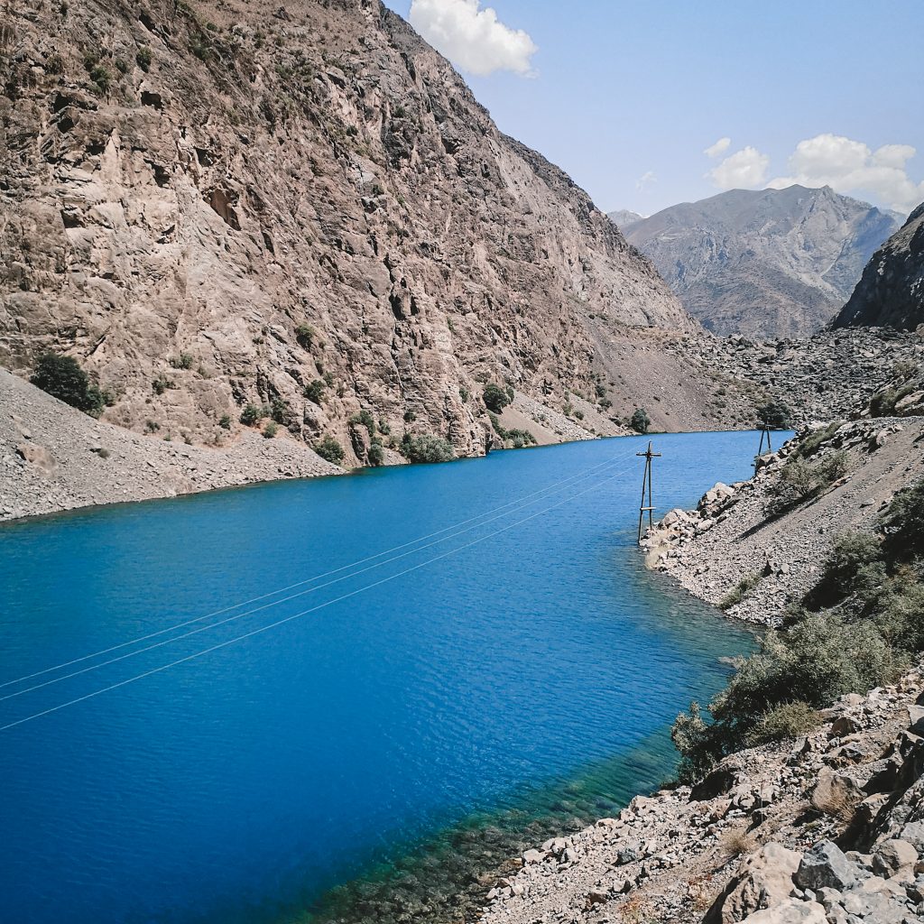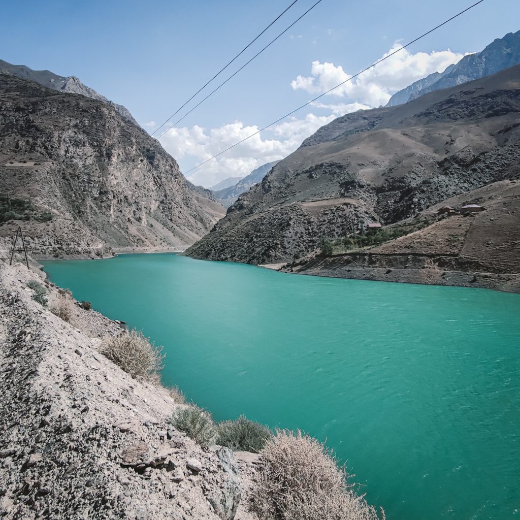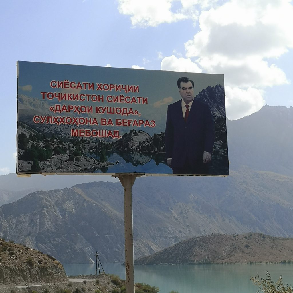 In den Sommermonaten komme viele einheimische Tourist:innen aus Duschanbe zum See, um hier am Wochenende oder in Ihrem Urlaub zu entspannen. Auch der Präsident ist hier nicht nur mehrfach auf überdimensionalen Werbetafeln zu sehen. Er hat ein eigenes Ferienhaus am anderen Ende des Sees, das entweder mit einem Hubschrauber oder mit einem Boot zu erreichen ist. Ob es deshalb auch Stromtrassen bis oben an den See und vergleichsweise gutes Internet gibt?!