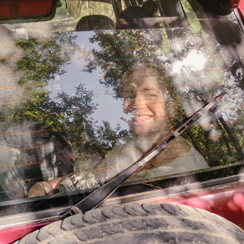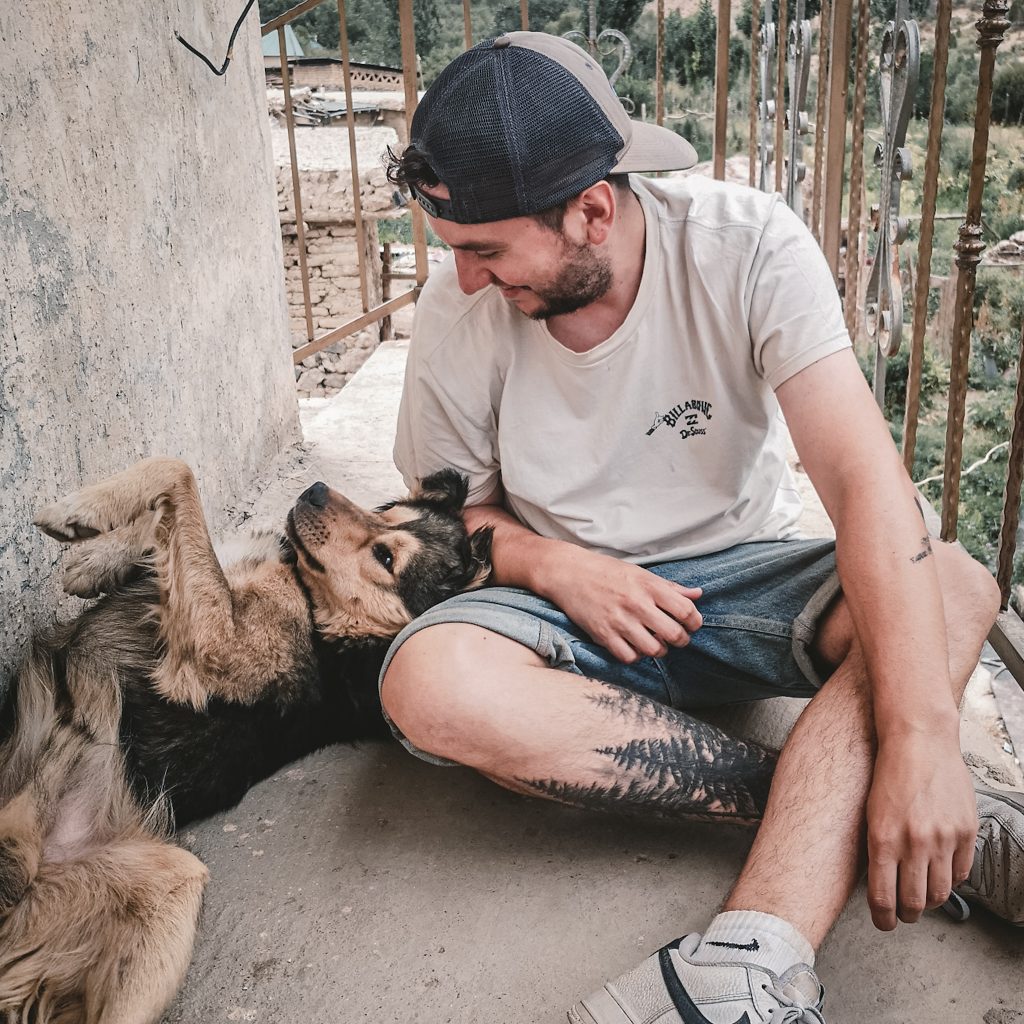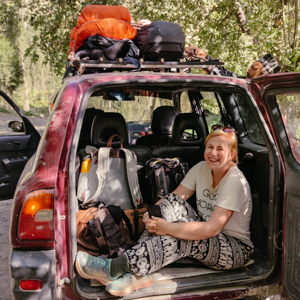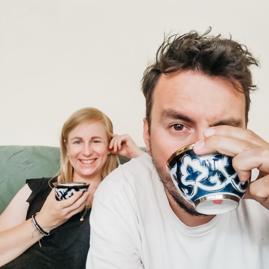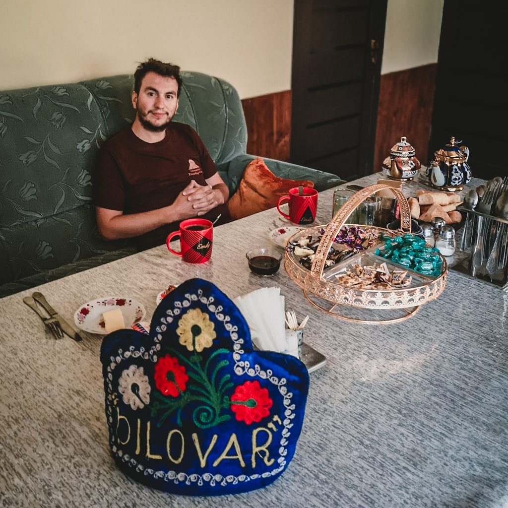 Am Abend bekommen wir Plov serviert (für uns die vegetarische Version), der kleine Hund springt wieder munter um uns herum und zum Abschluss lernen wir noch ein neues Spiel von Maxim. Er ist nämlich in einer Art „Brettspiel-Verein“. Nach dem gemeinsamen Frühstück am nächsten Morgen, werden wir von Jumaboy mit seinem Jeep zurückgefahren. Dieses Mal sind wir „nur“ zu siebt inkl. Gepäck in einem Auto mit fünf Sitzplätzen. Caro teilt sich den Kofferraum mit den Rucksäcken, während Konsti sich mit den Mädels die Rückbank teilt.