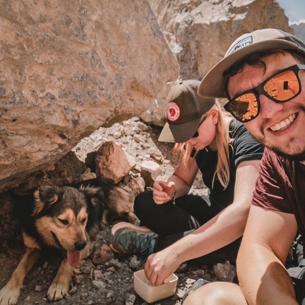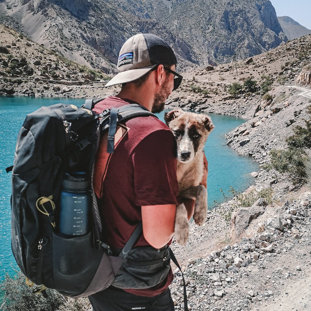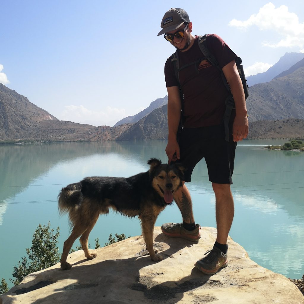 Nach einem stärkenden Frühstück wollen wir uns heute zu Fuß auf den Weg zum Iskanderkul See machen. Von der anderen Seeseite wollen wir dann zum Snake Lake und vielleicht auch noch zu einem nahegelegenem Wasserfall. So ist zumindest der Plan. Wir haben heute unerwartete Begleitung. Der Hund der Unterkunft, den wir mittlerweile Ray getauft haben, läuft mit uns durch das Dorf und auch als wir das Dorf verlassen, weicht er nicht von unserer Seite. Wir laufen über den nächsten Hügel und von dort aus geht es in Serpentinen runter zum See. Etwas entfernt sehen wir einen Wasserfall. Ganz in der Nähe ist die Goldmine. Als wir unten ankommen lassen wir Ray eine Runde in einem kleinen Zulauf schwimmen und trinken. Er scheint schon etwas erschöpft zu sein. Wir laufen weiter am See entlang.