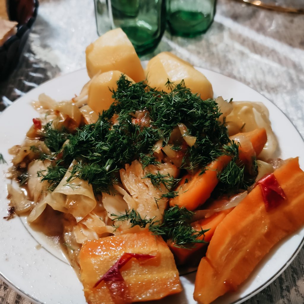 Zum Abendessen gibt es heute Tomaten-Gurken-Salat, Brot und eine Art Eintopf mit Möhre, Weißkohl, Kartoffeln und Dill.