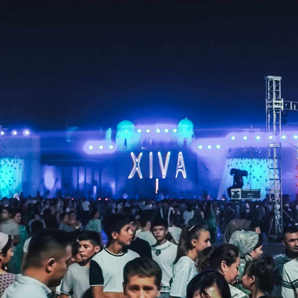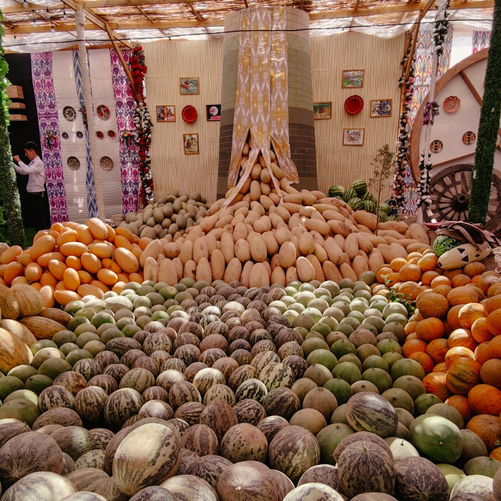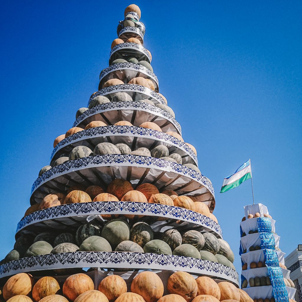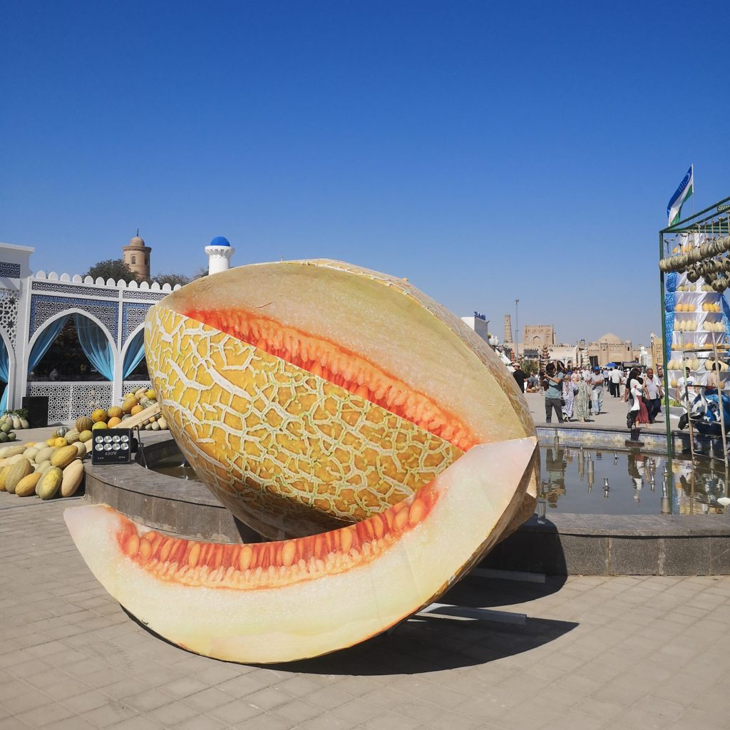 Heute wollen wir uns mal anschauen, was das berühmt berüchtigte Melonenfestival in Xiva so kann. Nach dem Frühstück spazieren wir zum Osttor der Altstadt. Uns klappt schnell die Kinnlade herunter. Unsere Vorstellung sah ungefähr so aus: Eine kleine Bühne mit etwas Programm, ein kleiner Melonenturm (wie wir es schon auf Bildern gesehen haben) und vielleicht ein paar Getränkestände a la Kirmes in Deutschland. Aber nichts da. Eine riesige Bühne und zwei LED Leinwände wurden aufgebaut, daneben stehen mit Schleifen verhangene Autos, zur Verlosung. Überall stehen überdimensionale Pyramiden mit zahlreichen Melonen. In großen Zelten sind geschnitzte Melonen-Kunstwerke ausgestellt. Melonen, Melonen und überall noch mehr Melonen. So viele Melonen haben wir noch nie zu vor an einem Ort gesehen. Caros Highlight sind die als Melonen verkleideten Kinder, die weniger begeistert über die Gesamtsituation in einem Zelt sitzen. Wahnsinn, was hier aufgebaut und aufgefahren wird. Erste Tanzgruppen treten in der Mittagshitze auf, ansonsten ist noch nicht sooo viel los, zum Teil wird noch aufgebaut. Die Zelte erinnern uns ans Oktoberfest (mit Tee statt Bier) und die Dekoration an herbstliche Erntedankfeste in Deutschland. Dies ist übrigens auch die Idee des Melonenfestivals. Die Einheimischen ehren die Melone und feiern den Ernteertrag. Wir beschließen auf jeden Fall am Abend nochmal wieder zu kommen.
