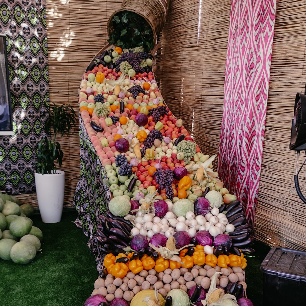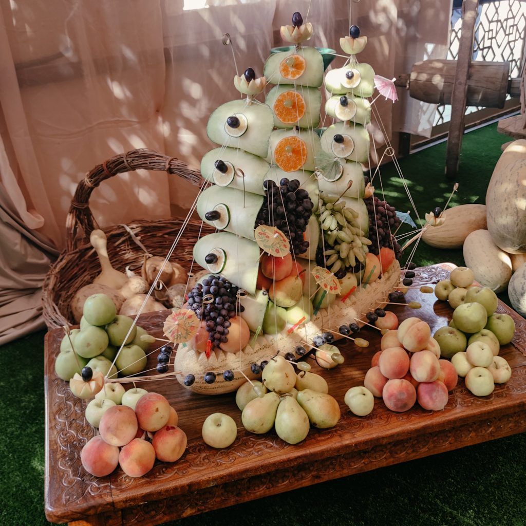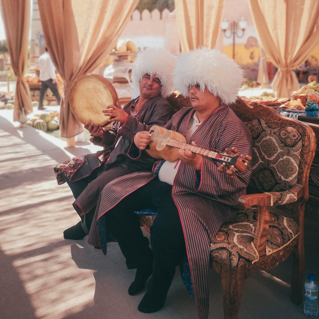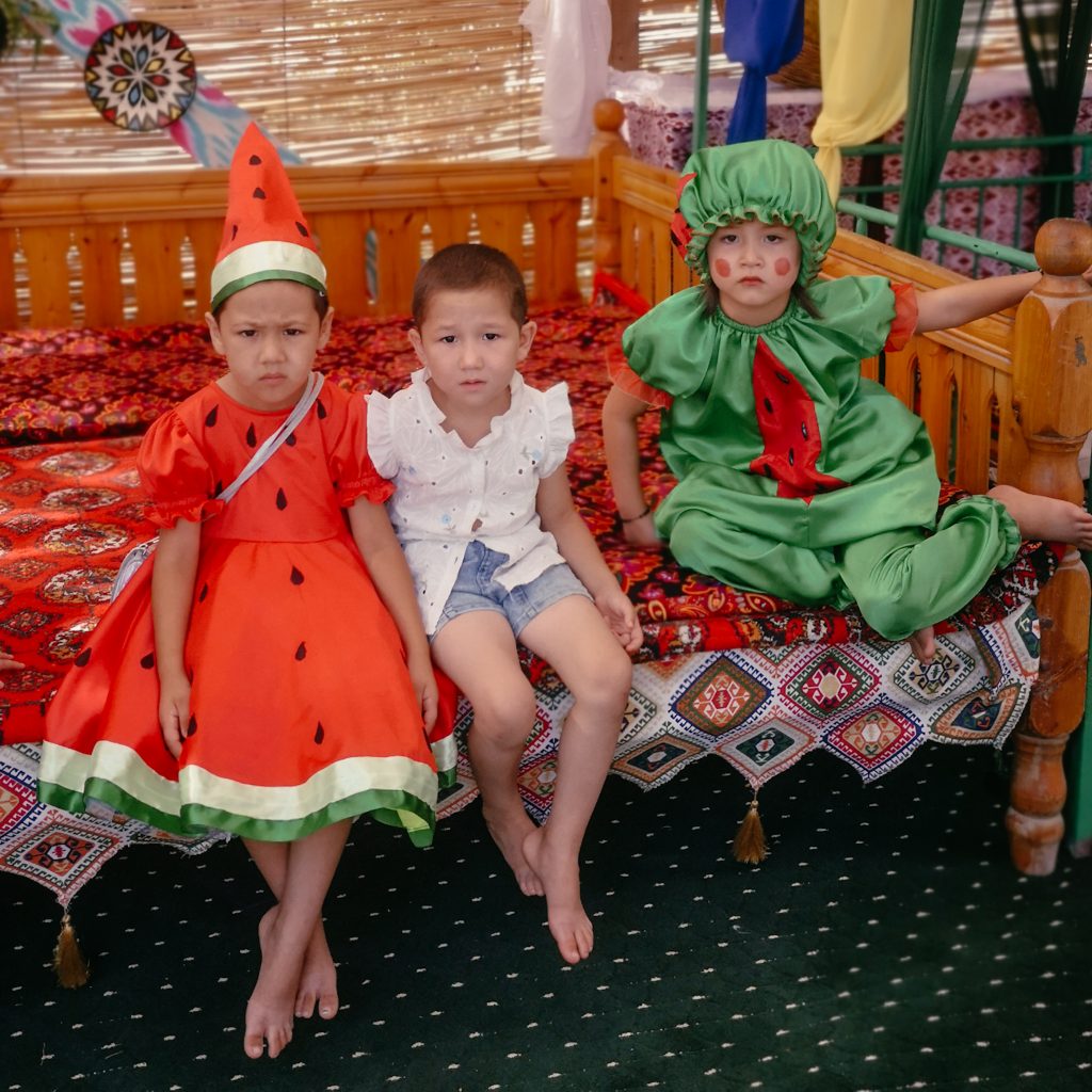 Heute wollen wir uns mal anschauen, was das berühmt berüchtigte Melonenfestival in Xiva so kann. Nach dem Frühstück spazieren wir zum Osttor der Altstadt. Uns klappt schnell die Kinnlade herunter. Unsere Vorstellung sah ungefähr so aus: Eine kleine Bühne mit etwas Programm, ein kleiner Melonenturm (wie wir es schon auf Bildern gesehen haben) und vielleicht ein paar Getränkestände a la Kirmes in Deutschland. Aber nichts da. Eine riesige Bühne und zwei LED Leinwände wurden aufgebaut, daneben stehen mit Schleifen verhangene Autos, zur Verlosung. Überall stehen überdimensionale Pyramiden mit zahlreichen Melonen. In großen Zelten sind geschnitzte Melonen-Kunstwerke ausgestellt. Melonen, Melonen und überall noch mehr Melonen. So viele Melonen haben wir noch nie zu vor an einem Ort gesehen. Caros Highlight sind die als Melonen verkleideten Kinder, die weniger begeistert über die Gesamtsituation in einem Zelt sitzen. Wahnsinn, was hier aufgebaut und aufgefahren wird. Erste Tanzgruppen treten in der Mittagshitze auf, ansonsten ist noch nicht sooo viel los, zum Teil wird noch aufgebaut. Die Zelte erinnern uns ans Oktoberfest (mit Tee statt Bier) und die Dekoration an herbstliche Erntedankfeste in Deutschland. Dies ist übrigens auch die Idee des Melonenfestivals. Die Einheimischen ehren die Melone und feiern den Ernteertrag. Wir beschließen auf jeden Fall am Abend nochmal wieder zu kommen.