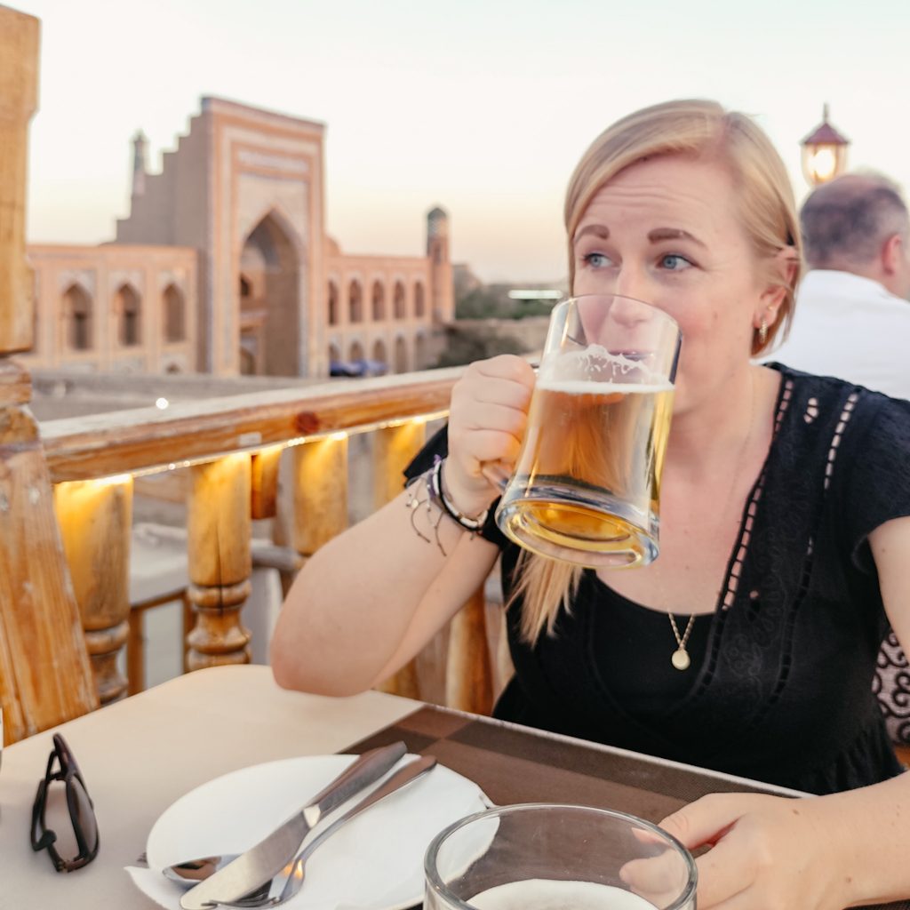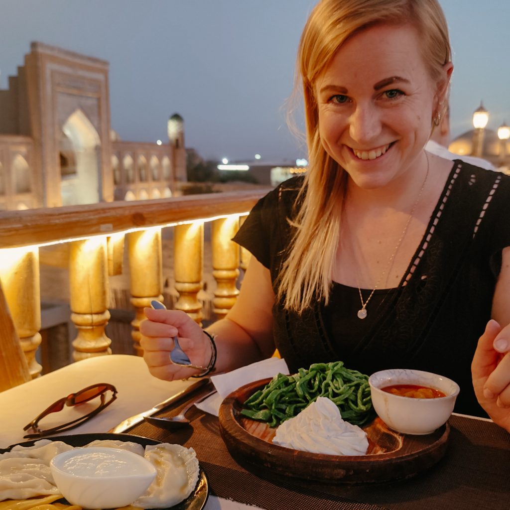 Um kurz vor 8 Uhr (pünktlich wie wir Deutschen sind) nehmen wir unsere Plätze im Restaurant ein. Vielleicht hat uns auch der Hunger zu dieser Pünktlichkeit getrieben. Das Restaurant zählt definitiv zur Kategorie „Touri-Schuppen“, wir erfreuen uns trotzdem über den schönen Ausblick von der Dachterrasse und auf die Auswahl der Speisen. Es gibt nämlich vegetarische, traditionelle Gerichte, die wir natürlich testen. Es gibt verschieden gefüllte Ravioli – mit Ei und Kürbis, dazu ein bisschen Joghurt. Außerdem testen wir heute die typischen grünen Dill-Nudeln mit einer roten Gemüsesoße. Beides schmeckt sehr gut und ist eine willkommene Abwechslung zu unserem Salat. Salz und Pfeffer fehlt natürlich wie immer, aber damit ist natürlich jedes gute Touri-Restaurant ausgestattet. Etwas ungewohnt ist dabei die begleitende Musik eines Klarinettenspielers, der direkt neben uns ein bisschen Ed Sheeran Lieder in die Abendstimmung hinaustönt. Nicht ganz authentisch usbekisch. Wir haben einen sehr schönen Abend, genießen das Essen, die Stimmung und testen passend zum Essen auch noch einen usbekischen Weißwein. Dieser ist, wie zu erwarten war, nicht das beste Tröpfchen. Etwas sauer, obwohl hier die Trauben eigentlich sehr gut reifen müssten, oder? Auf dem Heimweg treffen wir dann noch eine richtige Schmusekatze, der krönende Abschluss eines schönen Abends.