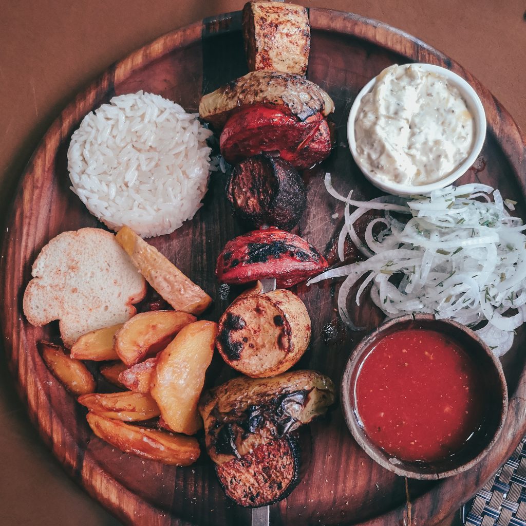 Nach ein paar Stündchen Schlaf machen wir uns fertig und gehen auf Erkundungstour. Als erstes möchten wir die Frühstücksmöglichkeiten und den Kaffee in Xiva erkunden. Den haben wir dringend nötig. Ein Café mit Frühstück finden wir zwar nicht, aber dafür ein Restaurant mit gutem Kaffee und Mittagessen. Letzteres passt sowieso viel besser zur Uhrzeit und wir genießen einen gegrillten Gemüsespieß, einen Salat und ein paar Pommes. Die Auswahl an vegetarischen Speisen überrascht uns, hier werden wir ggf. nicht das letzte Mal sein.
