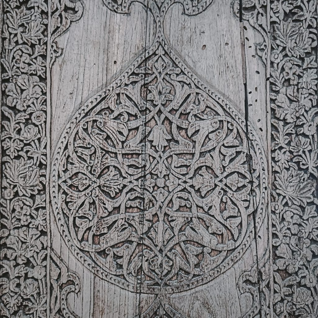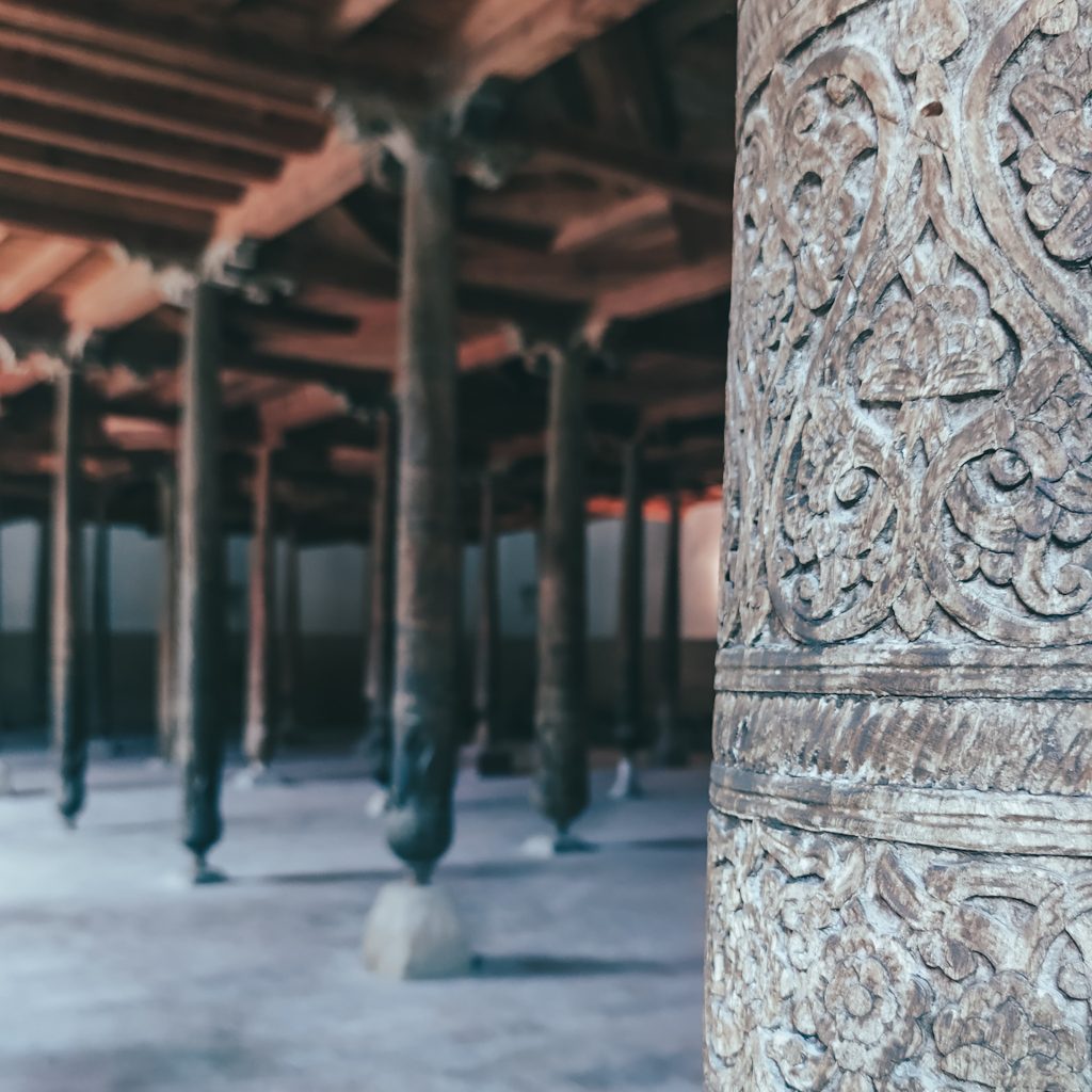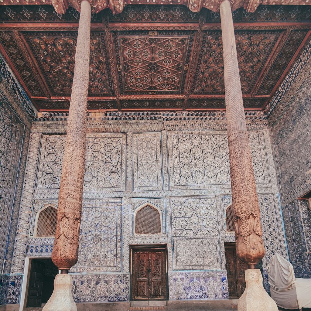 Die Holzpfeiler stammen alle aus verschiedenen Epochen. Sie wurden von zerstörten Bauwerken vergangener Siedlungen wiederverwendet oder während Eroberungen nach Xiva gebracht. Nur ein Teil ist für den Zweck des Erbaus dieser Moschee gefällt und bearbeitet worden. Das lässt sich insbesondere an den vielen Mustern und Inschriften erkennen. Anders als in anderen Moscheen sind die Vorgaben für die Besichtigung nicht ganz so streng. Caro muss kein Kopftuch tragen und auch die Schuhe dürfen wir anlassen. Der Bereich zum Beten ist etwas abgeschirmt.