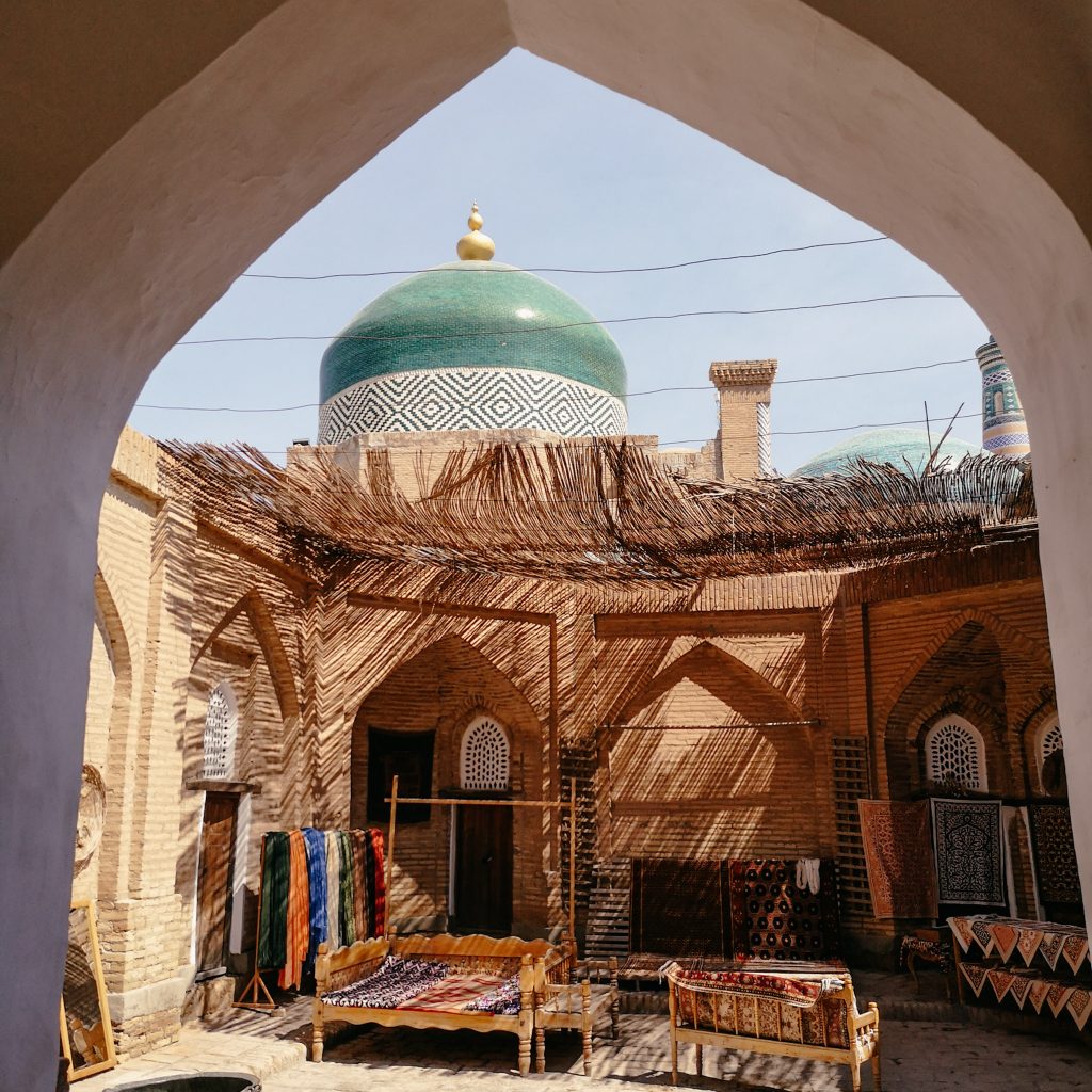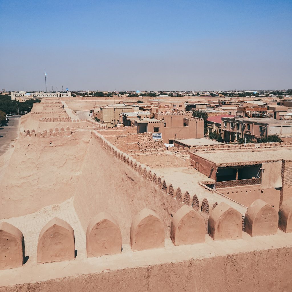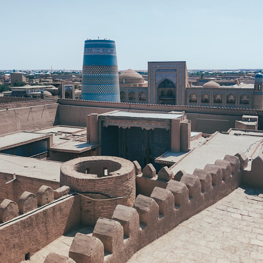 Die Altstadt ist von einer Festung mit vier Eingangstoren umgeben. An jedem Tor können sich die vielen Tourist:innen Eintrittstickets kaufen. Mit denen lassen sich die 3Ms erkunden. In diesen befinden sich nämlich in Xiva zahlreiche Ausstellungen. Heute umgehen wir den Kauf des Tickets. In unsere ersten Sights kommen wir nämlich einfach so rein. Wir schlendern durch die Bauten, besichtigen die Stadtmauer und genießen die Aussicht über die Stadt.