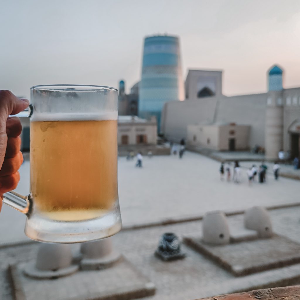 Zurück in Xiva machen wir direkt einen Abstecher zum Supermarkt und decken uns mit kaltem Wasser und den Zutaten für das Abendessen ein. Im Vorbereitung auf das Melonenfestival beschließen wir nun endlich auch mal eine Melone zu kaufen. So oft haben wir schon darüber nachgedacht, aber die Lagerung einer Wassermelone und auch das Verspeisen einer ganzen Melone könnte zu einer Herausforderung werden. Wird es auch noch. Wir tragen den 6 kg Melonenfindling zurück ins Hotel. Wir legen im klimatisierten Zimmer eine Pause ein und schneiden unser Melönchen an. Das ganze machen wir übrigens im unserem Badezimmer-Waschbecken, zur Zwischenlagerung dient die Dusche. Nach der Melonenpause fragen wir beim Hotelpersonal, ob sie unsere Melone im Kühlschrank einlagern können. Etwas verdutzt schaut uns der junge Mann an, aber freundlich wie er ist, nimmt er die Melone entgegen und verfrachtet sie in den Kühlschrank. Gegen Abend machen wir einen Spaziergang in die Stadt. Bei schönem Abendlicht gönnen wir uns ein Bier auf der Terrasse des Restaurants. Dann gehen wir zurück ins Hostel und machen uns einen gemütlichen Abend.