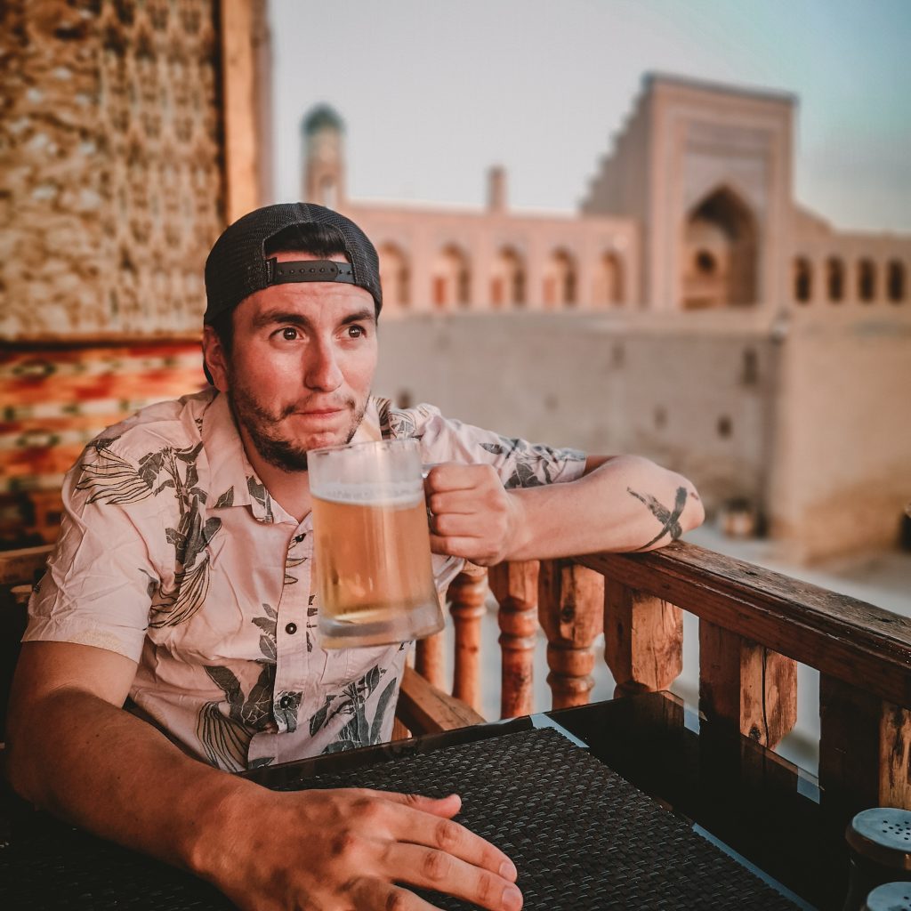 Für heute Abend verzichten wir schweren Herzens auf unseren Tupperdosen-Salat und haben uns einen Tisch auf der Dachterrasse „unseres“ Restaurants reserviert. Davor spazieren wir noch etwas durch die Stadt, das Licht ist abends einfach besonders schön. Wir gönnen uns schonmal ein erstes Bier, die Kaffeezeit haben wir leider verpasst. Vom Straßencafé beobachten wir die Menschen – lieben wir! Es gibt nämlich tatsächlich Tourist:innen, die sich an den Straßenständen mit Souvenirs eindecken. Faszinierend verfolgen wir, wie die Menschen sich bei über 30 Grad Fellmützen, Magneten und Plastik-Kinderspielzeug eindecken. Aber auch andere Cafébesucher:innen/Tourist:innen sind durchaus interessant zu beobachten.