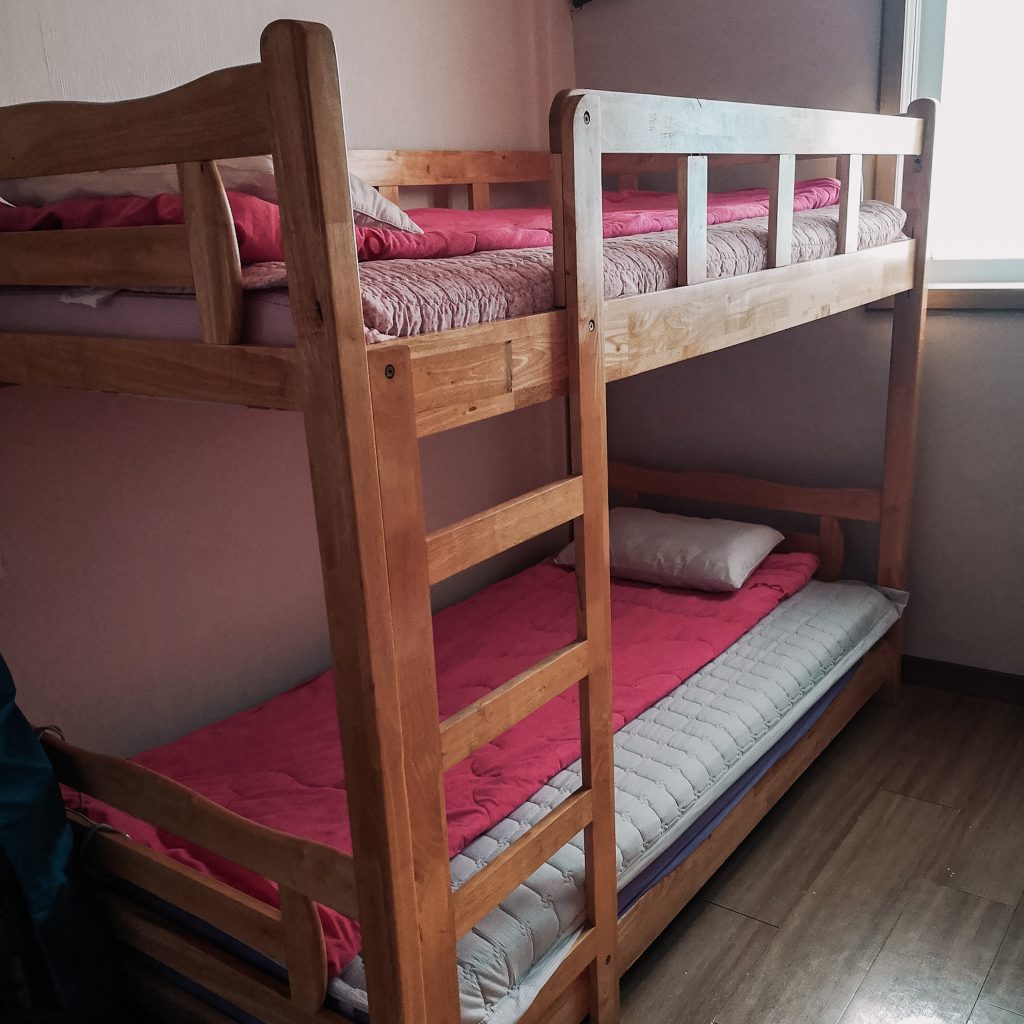 Wir haben ja bereits erwähnt, dass die Suche nach günstigen Unterkünften nicht ganz einfach war. Wir sind mittlerweile ja auch schon Dorms in Hostels mit mehreren Leuten gewöhnt. Aber das hier ist irgendwie nochmal „next level“. Es gibt hier ausschließlich geschlechtergetrennte Mehrbettzimmer. Konsti übernachtet im Erdgeschoss und Caros Vierbettzimmer ist im 1. OG. Es sieht einfach 1:1 aus wie in der Jugendherberge oder im Ferienlager. Holzdoppelstockbetten, pinke Bettwäsche, ein Tisch und ein kleiner abschließbarer Spind, das wars. Keine Vorhänge, keine Privatsphäre. Die hat man übrigens auch nicht beim Duschen, denn auch die sehen aus, wie in einer alten Jugendherberge. Eine schöne Gemeinschaftsdusche, keine Kabinen.