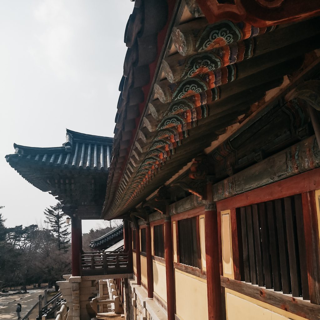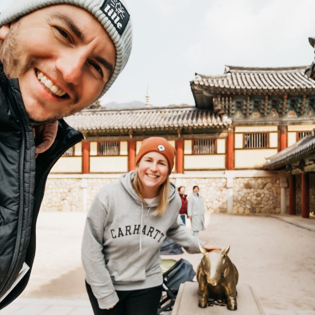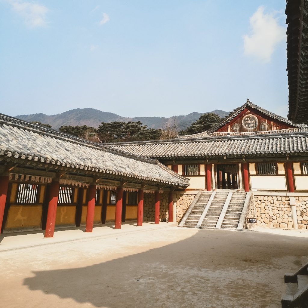 Wir beschließen direkt mit dem Kulturprogramm loszulegen. Schließlich sind wir ja nur zwei Nächte hier. Mit dem Bus geht es zum Bulguksa Tempel. Dieser gilt als Meisterwerk der buddhistischen Kunst im Silla-Königreich. Er beheimatet sieben Nationalschätze Südkoreas: zwei Stein-Pagoden, zwei Treppenanlagen (aha, das lesen wir gerade zum ersten Mal, aber Treppen?!), zwei Buddha-Statuen und einen Reliquienbehälter. Selbstverständlich gehört die Anlage zum UNESCO Weltkulturerbe (tbh damit lockt man uns jetzt auch nicht mehr). Die Anlage ist sehr weitläufig und es gibt verschiedene Pagoden mit großzügigen Innenhöfen. Die Dabotap-Pagode zählt angeblich zu den bedeutendsten buddhistischen Kunstwerken der Welt und hat es damit sogar auf die 10-Won-Münze geschafft.