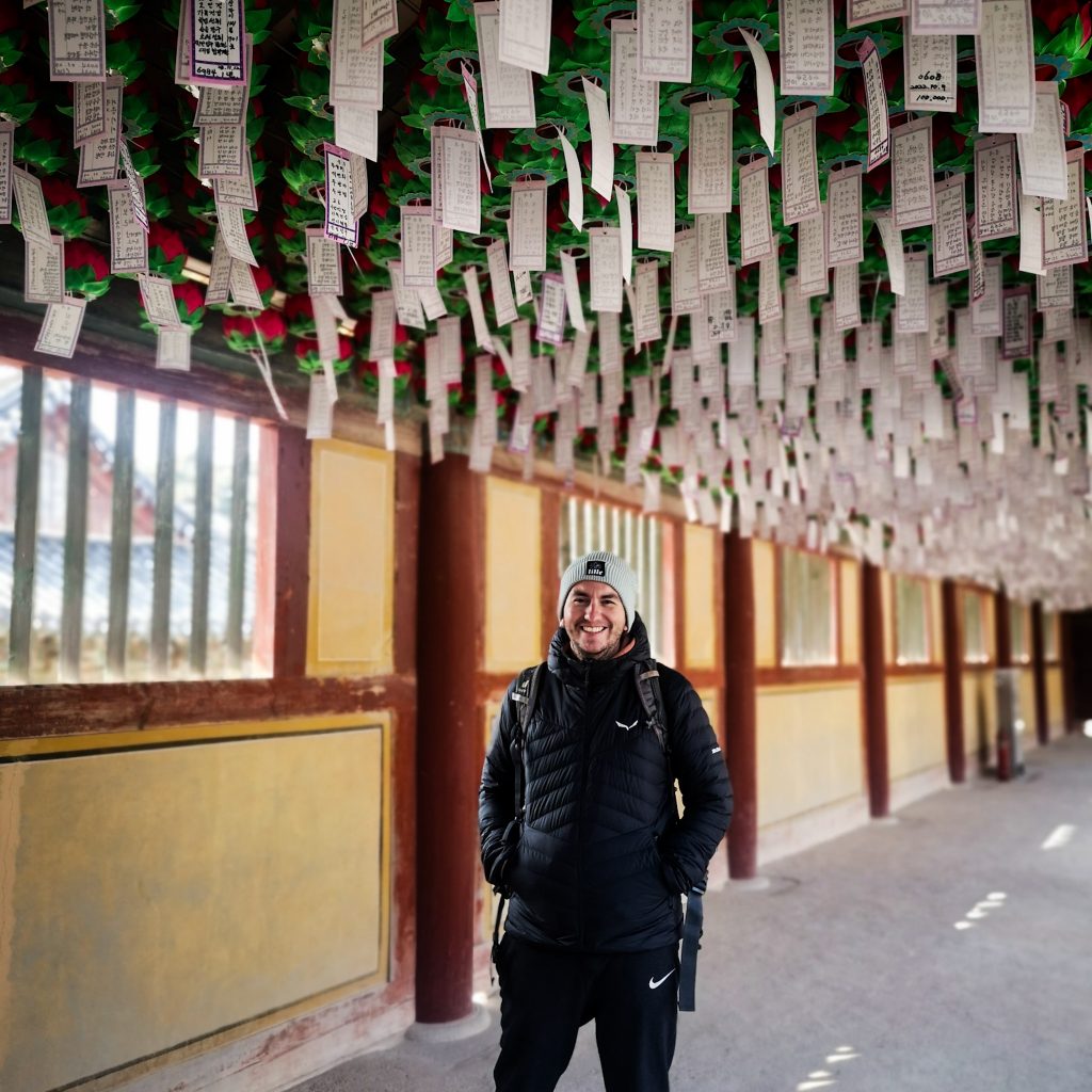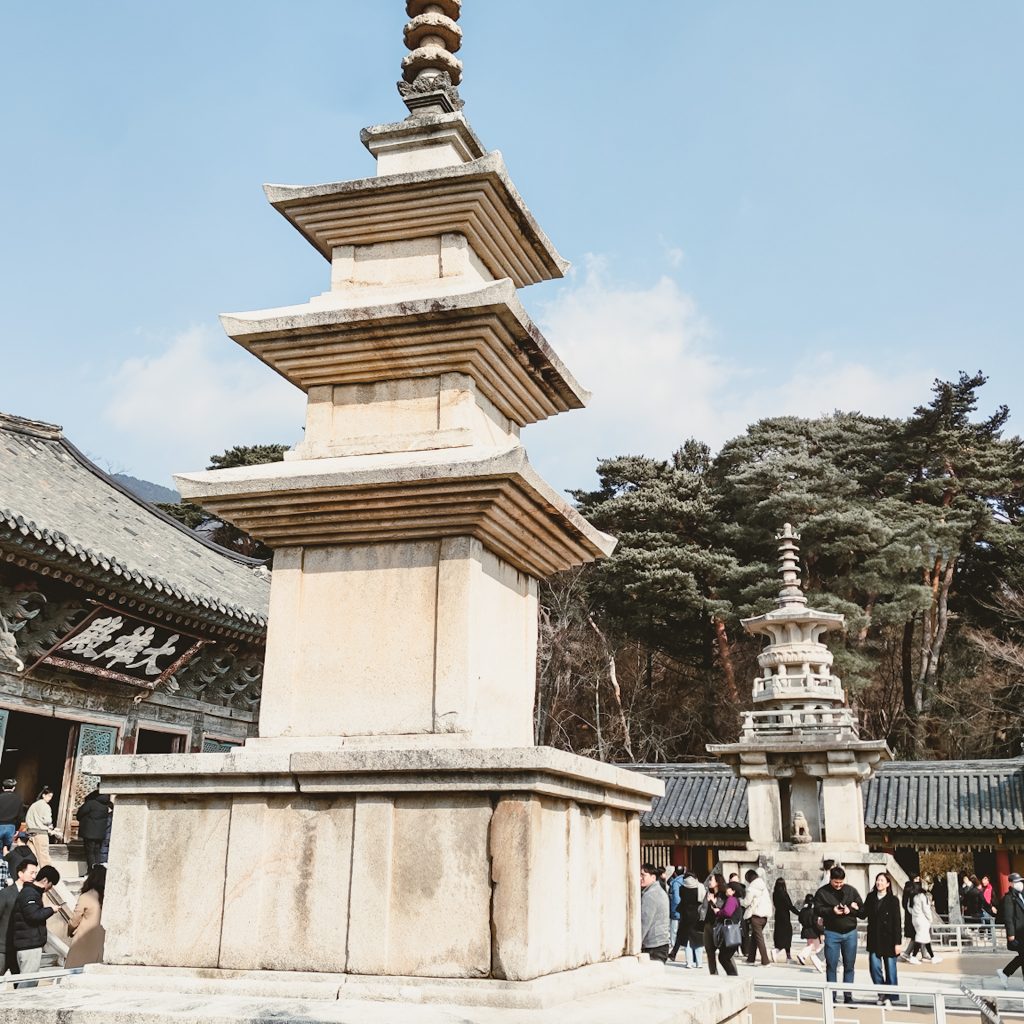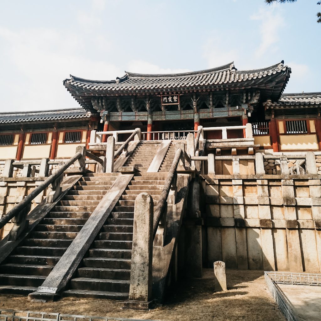 Wir beschließen direkt mit dem Kulturprogramm loszulegen. Schließlich sind wir ja nur zwei Nächte hier. Mit dem Bus geht es zum Bulguksa Tempel. Dieser gilt als Meisterwerk der buddhistischen Kunst im Silla-Königreich. Er beheimatet sieben Nationalschätze Südkoreas: zwei Stein-Pagoden, zwei Treppenanlagen (aha, das lesen wir gerade zum ersten Mal, aber Treppen?!), zwei Buddha-Statuen und einen Reliquienbehälter. Selbstverständlich gehört die Anlage zum UNESCO Weltkulturerbe (tbh damit lockt man uns jetzt auch nicht mehr). Die Anlage ist sehr weitläufig und es gibt verschiedene Pagoden mit großzügigen Innenhöfen. Die Dabotap-Pagode zählt angeblich zu den bedeutendsten buddhistischen Kunstwerken der Welt und hat es damit sogar auf die 10-Won-Münze geschafft.