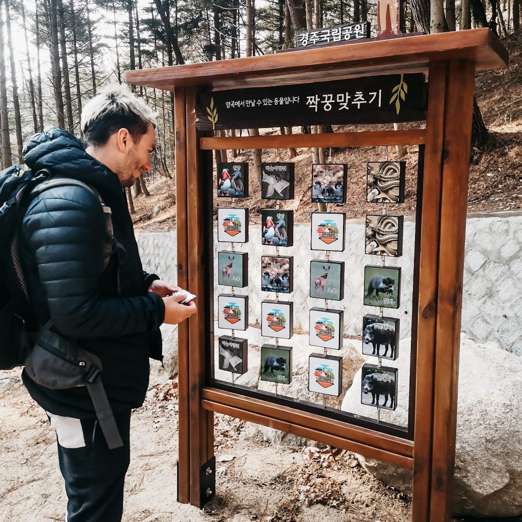 Wir gehen immer weiter, es ist wirklich schön hier. Erst kommen wir an eine Art Kinderspielplatz mit Memory-Spiel und kleinen Lernstationen, an der ein älteres Ehepaar uns aus dem Wald hinausgehend noch ein paar Kekse schenkt. Schließlich kommen wir an eine Kreuzung. Von hier ist der Weg zur Seokguram Grotto ausgezeichnet.