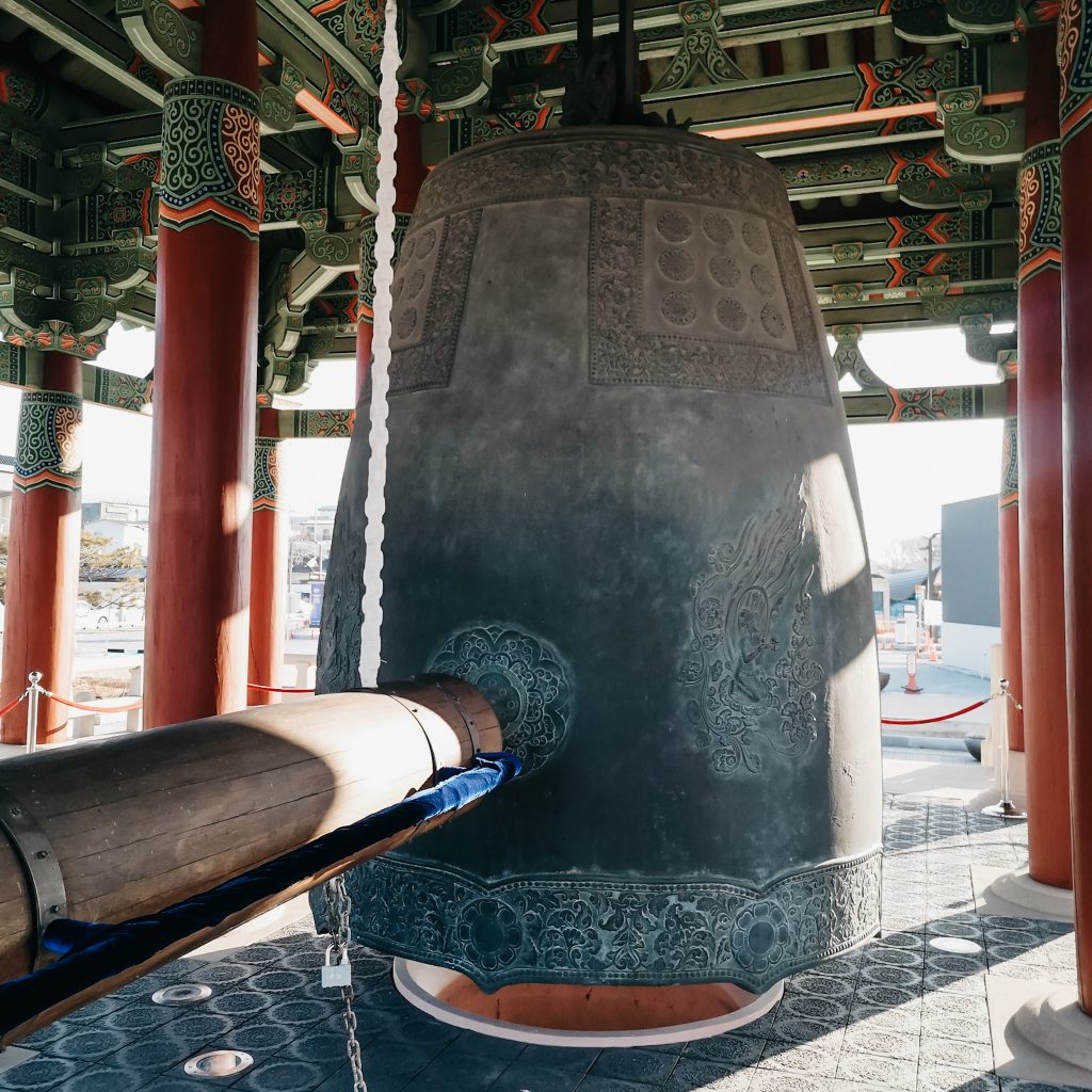 Moment, das haben wir doch schonmal gehört? Neben dem Info-Flyer für den Bulguksa Tempel haben wir an der Tourist Information noch einen zweiten Flyer erhalten. Den haben wir uns gar nicht so richtig angeschaut, aber langsam setzt sich das Puzzle Stück für Stück zusammen. Die Seokguram Grotte ist eine Außenanlage des Bulguksa-Tempels, die auf einem Berg liegt. Genau auf dem, den wir anscheinend gerade hochgehen. Wenn wir schonmal hier sind, dann können wir auch weitergehen denken wir uns. Natürlich geht es immer weiter bergauf und wird anstrengender als wir dachten. Oben angekommen sehen wir eine große Glocke, die von Besucher:innen angeschlagen werden kann. Hier ist plötzlich wieder viel los, kein Wunder, man kommt auch problemlos mit Auto und Bus hier hoch. Von hier müssen wir noch einen weiteren Weg hinunter laufen.