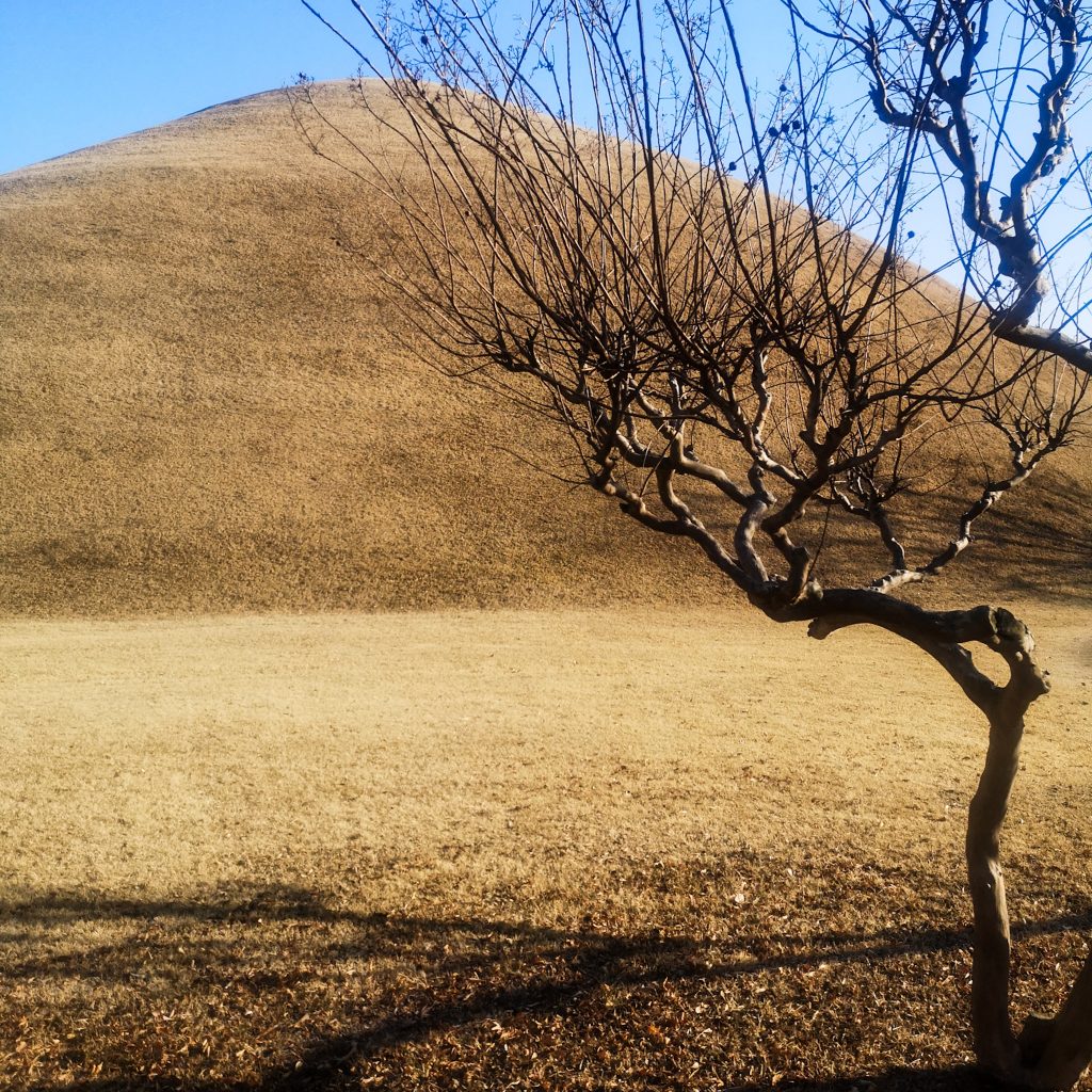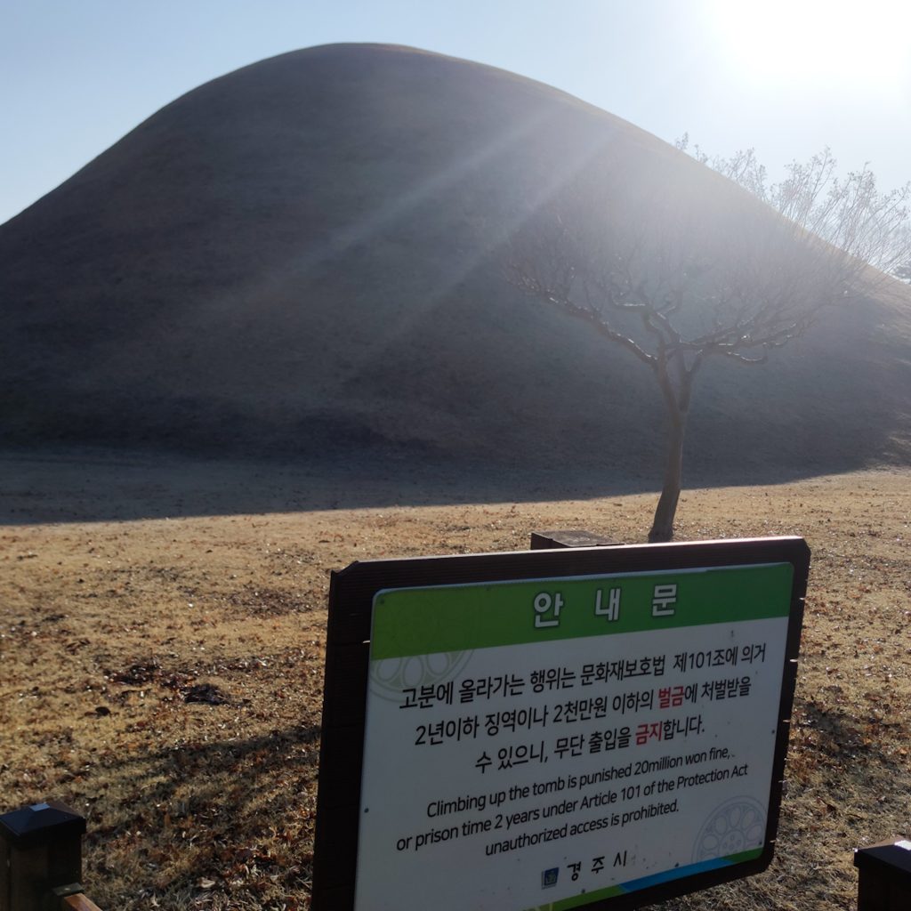 In und um Gyeongju gibt es zahlreiche, bis zu 25 m hohe Rasenkuppen, die lange für natürliche Erhebungen gehalten wurden, tatsächlich aber Hügelgräber der Könige und Aristokraten Sillas sind. Genau diese werden wir uns in den nächsten Stunden anschauen. Aber Obacht: Betreten ist strengstens verboten und wird mit einer Gefängnis- bzw. einer sehr hohen Geldstrafe geahndet. Nüchtern betrachtet sehen die meisten Gräber auch wirklich nur wie irgendwelche Grashügel aus. Zur Abwechslung gibt es dann zwischendurch noch einen Steinturm anzuschauen. Dabei handelt es sich um das Cheomseongdae-Observatorium, das älteste erhaltene Observatorium in Ostasien. Es diente der Beobachtung der Sterne, um Wettervorhersagen zu treffen. Für uns ist es eher schwer vorstellbar, dass dieser alte Steinturm eine sehr besondere Bedeutung für manche Menschen hat.