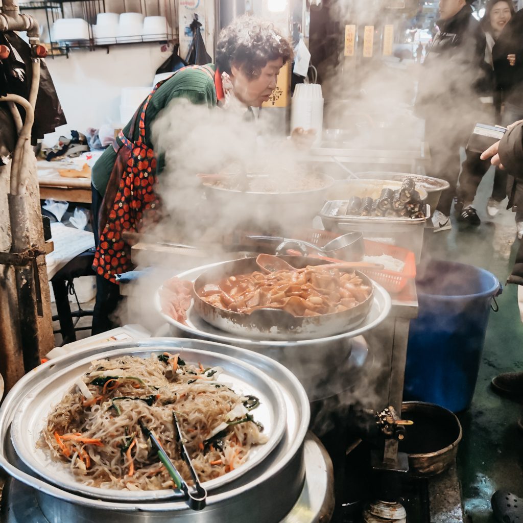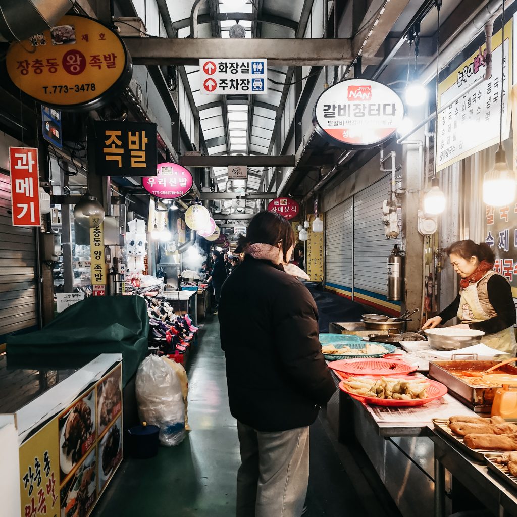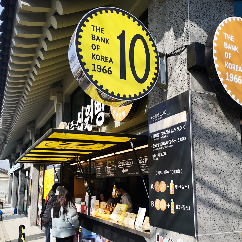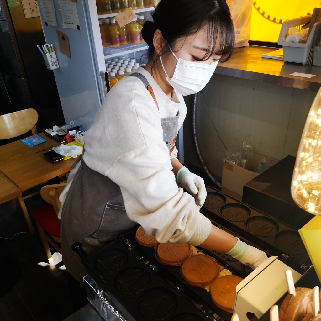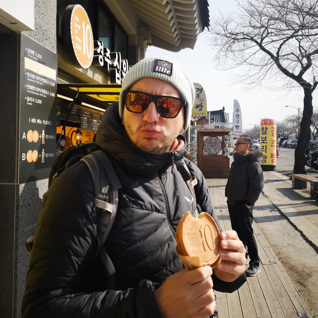 Wir machen uns langsam wieder auf dem Heimweg. Auf dem Rückweg nehmen wir aber noch einen kleinen Snack auf die Hand mit. Überall hier haben wir schon diese Läden gesehen. Sie bieten eine Art Pfannkuchen in Form eines Talers an, der mit Käse gefüllt ist. Und allgemein bekannt ist ja: Alles mit Käse ist erstmal nicht verkehrt. Wir bestellen uns einen Taler und sind begeistert. Es schmeckt tatsächlich wie ein süßer Pfannkuchen, der mit heißem, geschmolzenem Käse gefüllt ist. Das wäre dann auch unser erster koreanischer Snack. Aber keine Sorge, es wird nicht der letzte sein.