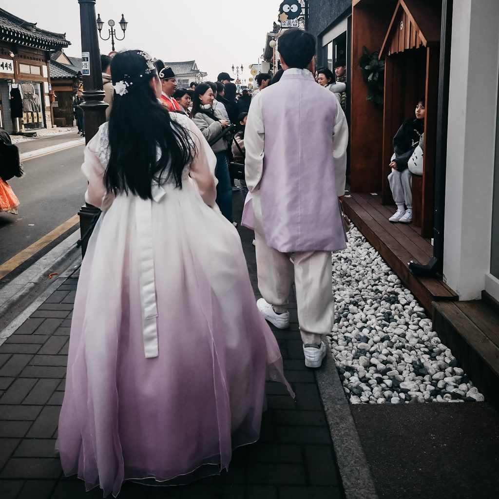 Hier ist natürlich kein verspäteter Karneval ausgebrochen (schade eigentlich!). In Südkorea ist es sehr üblich, dass man sich beim Besuch anderer Städte insbesondere an kulturellen Orten einen Hanbok ausleiht. Das ist der Name der traditionellen Kleidung. Grundsätzlich besteht der Hanbok bei Frauen aus einem Rock (Chima), einem Unterrock (Sokchima) und einem dazugehörigen Oberteil (Jeogori). Der Rock reicht von oberhalb der Brust bis zum Boden und hat eine Form, die im oberen Bereich enger am Körper anliegt und sich nach unten hin weitet. Das Oberteil der Frauen ist vergleichsweise kurz und wird mit einer Schleife zugebunden. Männer tragen eine Hose (Baji) und ebenfalls ein Oberteil. Darüber kann eine Robe (Po – hihi) getragen werden. Sowohl Hose als auch Oberteil und Robe sind beim Mann weit geschnitten, allerdings erhält die Robe aber durch ein um die Taille gebundenes Band mehr „Shape“. Im Alltag wird das Outfit fast gar nicht mehr getragen, daher freuen sich die Leute, ihn an besonderen Orten oder zu Feiertagen/Festlichkeiten zu tragen. Selbstverständlich kann man auch noch ein entsprechendes Styling dazu buchen und das ein oder andere Fotoshooting ist vorprogrammiert. Im manchen Tempeln bekommt man in traditioneller Kleidung übrigens freien Eintritt. Verleihe von Hanboks gibt es an jeder Straßenecke und wir sind verwundert, dass es mit Preisen ab 10 Euro gar nicht mal so teuer zu sein scheint. Natürlich ist das Ausleihen und „Verkleiden“ auch bei einigen Touris beliebt, heute sehen wir aber hauptsächlich junge Paare, die gemeinsam durch die Straßen von Gyeongju laufen.