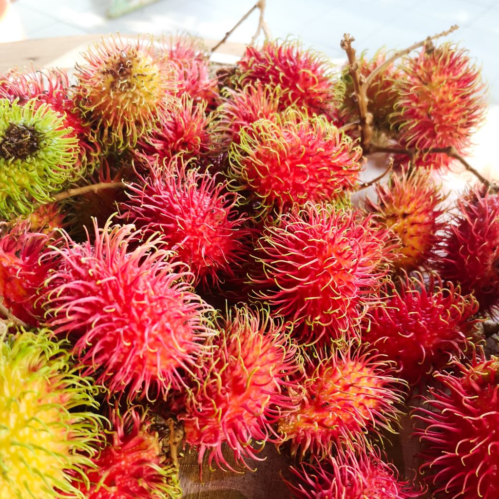 Wie schon beschrieben, sind wir etwas außerhalb der Stadt. Zur nächsten Metrostation läuft man ca. 15 Minuten, aber von dort ist man in weiteren 15 Minuten direkt im Zentrum von Kuala Lumpur. Der Bungalow von Anushia und Daniel liegt in einer uns besser erscheinenden Wohngegend. In der Nachbarschaft stehen nette Häuschen, welche von höheren Zäunen umgeben sind. Die Gärten (auch andere Straße) sind alle bestens in Schuss und auch Anushia und Daniel haben einen Gärtner, der einmal in der Woche kommt. Beim Spaziergang sichten wir noch ein paar richtige Villen, von denen man mit Sicherheit einen wahnsinnigen Ausblick auf die Stadt hat. Hinter großen Toren warten hier und da auch richtig teure Autos. Man kennt sich hier. Schon beim Kennenlernen erzählen uns die beiden, wer hier rechts uns links wohnt. Alle wissen Bescheid, dass wir zum Housesitting hier sind. Nicht, dass irgendwer noch misstrauisch wird. Daniel erzählt uns auch von zwei Deutschen aus der Nachbarschaft. „Wenn Ingo aus Frankfurt an seinem roten Bistro Tisch an der Straße sitzt, könnt ihr ihm gerne Hallo sagen.“ Leider lässt sich Ingo aus Frankfurt nicht blicken, auf den Smalltalk und die Chance auf einen Äppler hätten wir uns gerne eingelassen. Außerdem begegnet uns tagtäglich ein Securitymann, der auf seinem Motorrad seine Runden hier dreht. Zwischen den ganzen schicken Häusern sind überall Palmen und tropische Pflanzen, hier ist es wirklich schön und entschleunigend. Auf dem Rückweg machen wir noch einen Abstecher zum kleinen Supermarkt um die Ecke. Vor dem Abendessen haben wir noch eine kleine Mission in der Küche geplant. Als kleinen Snack gibt es übrigens Rambutans, die hat der Gärtner aus dem Garten geerntet und bereitgelegt.