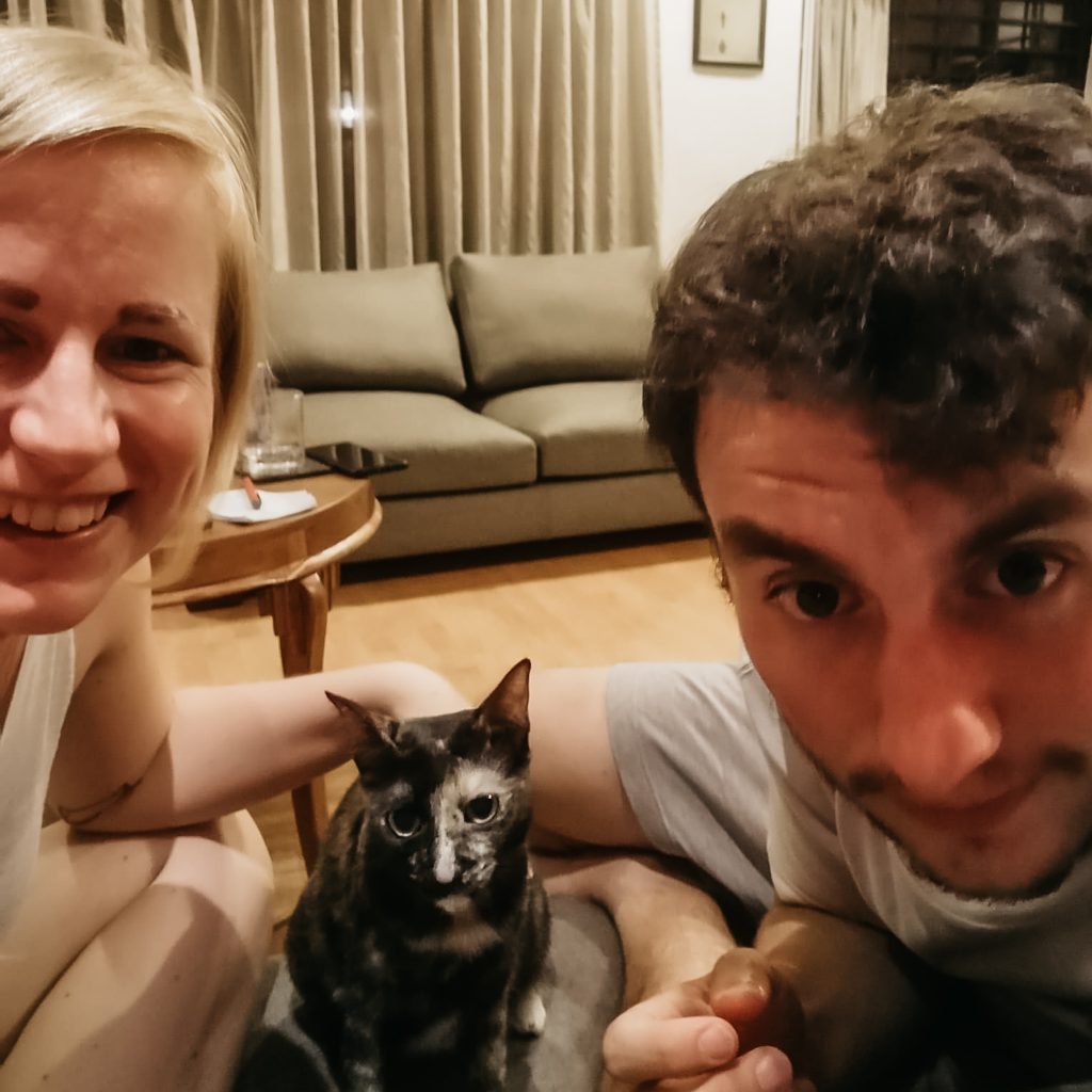 Nach unserer Zusage vereinbaren wir mit Anushia und Daniel ein Kennenlernen am Vortag. Die beiden fliegen morgen sehr früh, deshalb schauen wir heute schon vorbei, um Tora kennenzulernen und uns alle Aufgaben und die Gegebenheiten zeigen zu lassen. Wir haben uns für die Vorübernachtung eine Unterkunft in der Nähe gesucht und haben es nicht weit. Zugegebenermaßen sind wir beide etwas aufgeregt. Warum? Keine Ahnung, aber wahrscheinlich hoffen wir beide insgeheim, dass Tora uns mag und wir damit Anushia und Daniel ein gutes Gefühl geben können. Die beiden sind geschätzt Anfang/Mitte 40. Anushia kommt aus Malaysia, während Daniel gebürtiger Deutscher ist. Nach einem Praktikum vor 20 Jahren, haben die beiden sich kennengelernt und er ist geblieben. Mittlerweile ist er Architekt und Anushia arbeitet für eine Unternehmensberatung. Die beiden sind 2008 von Deutschland auf dem Landweg nach Malaysia gereist, auch mit dem Backpack und einem Reiseblog. Jetzt wohnen die beiden seit mehreren Jahren in ihrem schönen und sehr gemütlichen Bungalow in einer sehr guten Wohngegend. Wir werden von den beiden sehr herzlich begrüßt. Tora schläft auf der Couch, wir gehen direkt in die Kontaktaufnahme. Sie schnuppert an unserer Hand, lässt sich streicheln und schleckt Caros Finger ab. Puh, Glück gehabt, das ging schonmal gut. Dass Tora keine klassische Schmusekatze ist und dass wir, sagen wir mal „etwas Glück“ beim ersten Eindruck hatten, merken wir erst später.