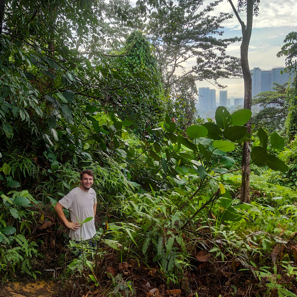 Wie schon so oft beschrieben, schwitzen wir ja eigentlich schon, ohne uns überhaupt zu bewegen. Die hohe Luftfeuchtigkeit kann so einiges. Wir laufen etwas durch das Wohngebiet und kommen dann zum Eingang, den Daniel uns gezeigt hat. Wir biegen direkt ab und befinden uns einfach gefühlt mitten im Dschungel. Wir laufen einen kleinen Trampelpfad entlang, dann geht es Treppen steil berghoch. Da hören wir erstmal auf mit dem „Laufen“ und gehen die Treppenstufen über Stock, Stein und Wurzeln bergauf. Um uns herum ist alles zugewachsen und grün. Den passenden Sound gibt’s natürlich auch gratis dazu. Was für ein Dschungel-Erlebnis am Morgen. Oben angekommen laufen wir weiter den Weg entlang, zwischendurch haben wir eine tolle Aussicht uns es sieht so aus als wenn wir aus einem tiefen Dschungel auf Kuala Lumpur blicken. Dabei ist die nächste Wohngegend ja direkt um die Ecke. Es macht wirklich Spaß und endlich können wir unsere Trailrunning mal für ihre eigentlich gedachte Funktion testen. Konsti muss sich zugegebenermaßen im Tempo etwas drosseln, damit Caro nicht den Anschluss verliert.