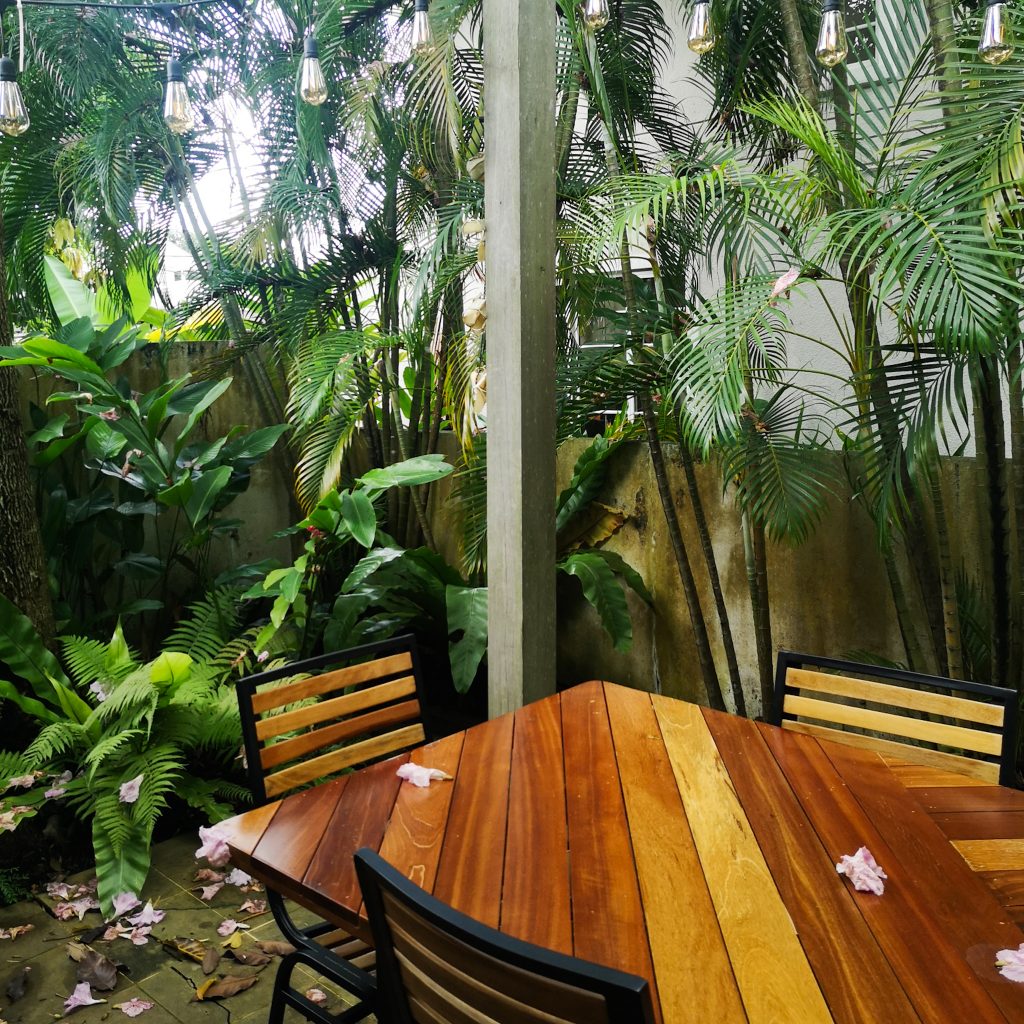 Daniel zeigt uns alle Zimmer, wir schlafen in einem Gästezimmer mit eigenem Bad, der Wohnbereich ist groß und gemütlich eingerichtet. Er bietet uns sogar an, sein Büro zu nutzen. Die Küche ist groß und schon vorab haben wir gelesen, dass es sowohl einen Ofen als aus auch einen Mixer gibt. Mehrfach betonen die beiden, dass wir uns ganz wie zuhause fühlen sollen. Wir können alles benutzen, Öl, Gewürze, Sachen im Kühlschrank, Obst, Eier.. Das Haus verfügt über eine große Terrasse, die zum Teil überdacht ist, ein Traum! Überall sind tolle und große Pflanzen, eine Bananenstaude, ein Baum mit Jackfruits, ein weiterer mit Rambutans.