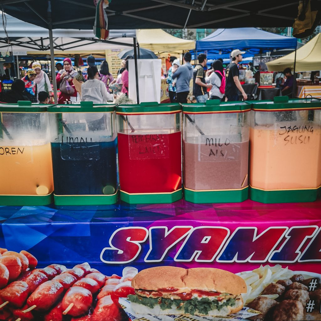 Wir schlendern etwas durch die Menge, ergattern eine Flagge und schauen uns dann auf einer Art Streetfood-Markt um, auf dem allerlei Speisen und Getränke angeboten werden. Was übrigens sehr typisch hier ist, sind große, transparente Plastikbottiche, aus denen farbenfrohe Getränke und Eis ausgeschenkt werden. Da trauen wir uns nicht ran, alleine schon wegen des Eis, aber auch die bunten künstlichen Farben schrecken uns ab.