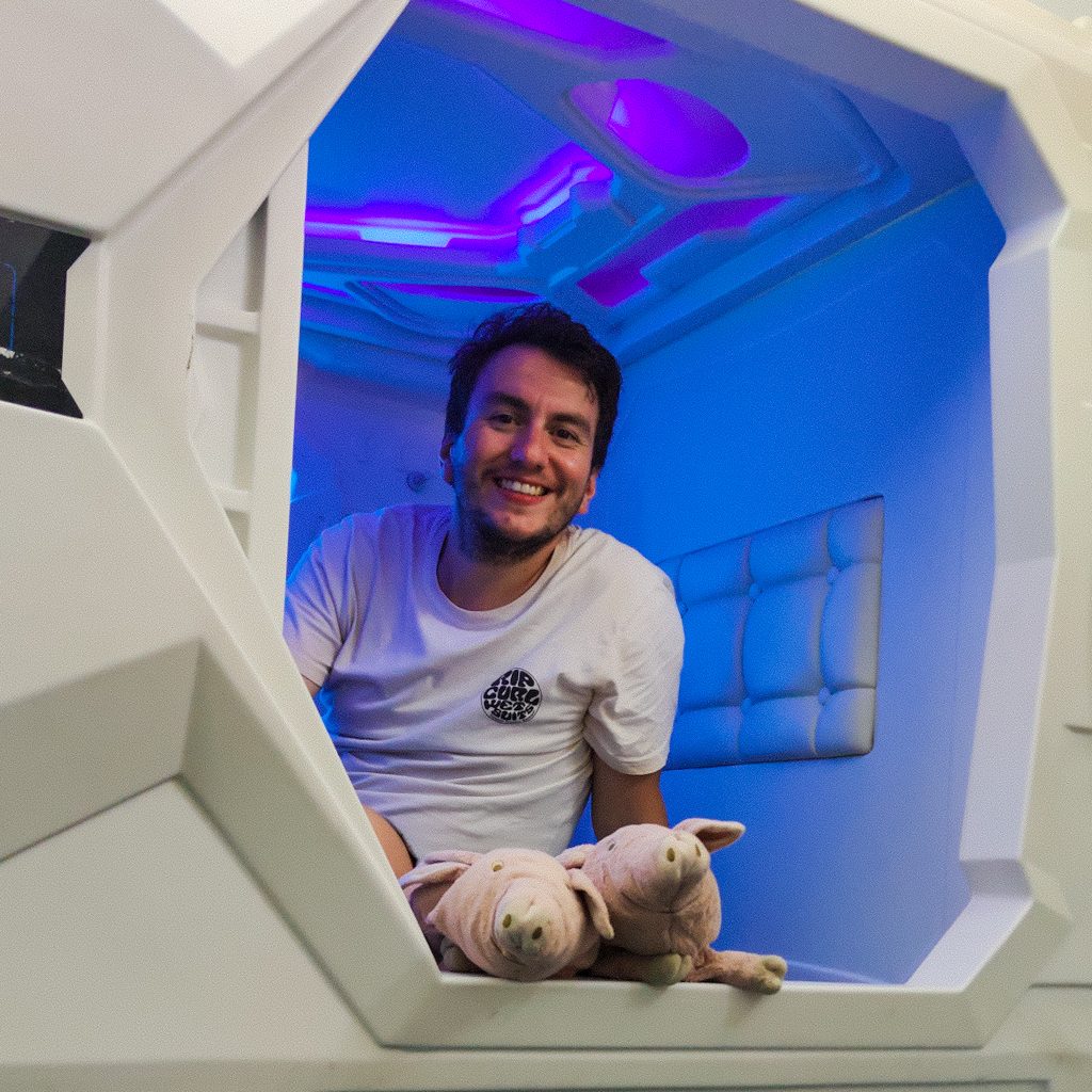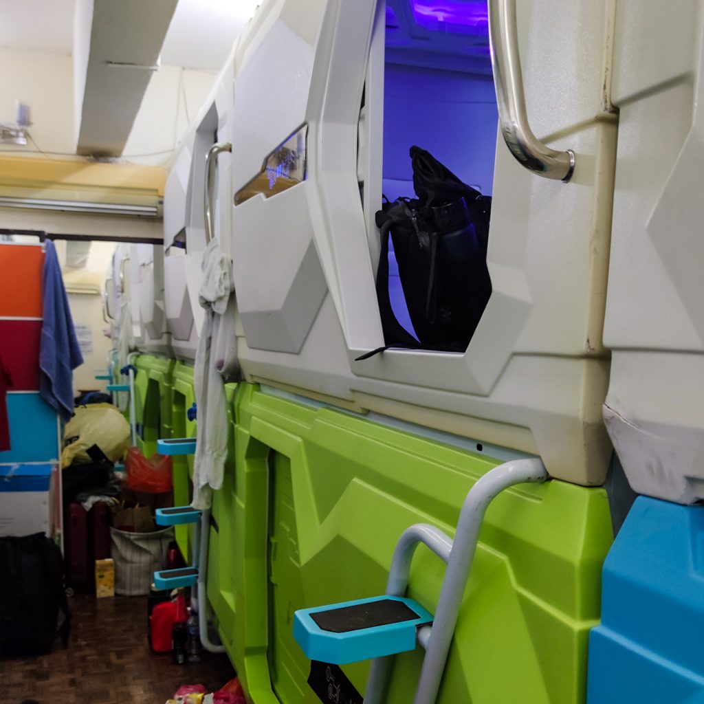 Um Kosten zu sparen, entscheiden wir uns für einen kurzen Zwischenstopp in Johor Bahru. Die Stadt liegt direkt an der Grenze zu Singapur und nur eine kleine Wasserstraße trennt hier Malaysia von Singapur. Dennoch liegen Welten zwischen den Preisen hier. Wir übernachten hier in einem Capsule Hostel, was umgerechnet nur 16 Euro für beide Betten kostet. Oder wie wir in diesem Fall sagen sollten: Space Shuttles. Die Kapseln bestehen aus kleinen, abschließbaren Kunststoff-Höhlen, die an kleine Space Shuttles erinnern. Im Inneren gibt es USB Ladeanschlüsse, einen ausklappbaren Tisch, Spiegel und nicht zu vergessen: Ambiente-Beleuchtung in allen möglichen Farben und einen Mini-Feuerlöscher. Was uns etwas beruhigt – die Türen lassen sich von innen auch manuell öffnen. Ansonsten ist das Hostel übrigens alles andere als modern und sauber, was uns schnell dazu veranlasst, doch nicht selbst zu kochen und auch nicht so viel Zeit dort zu verbringen.