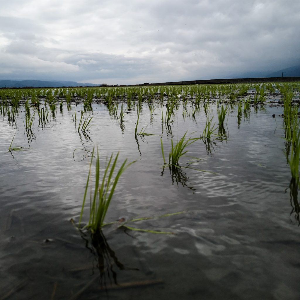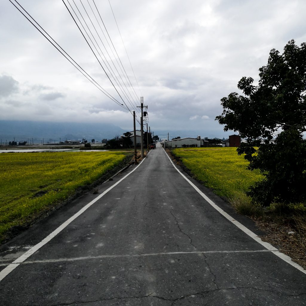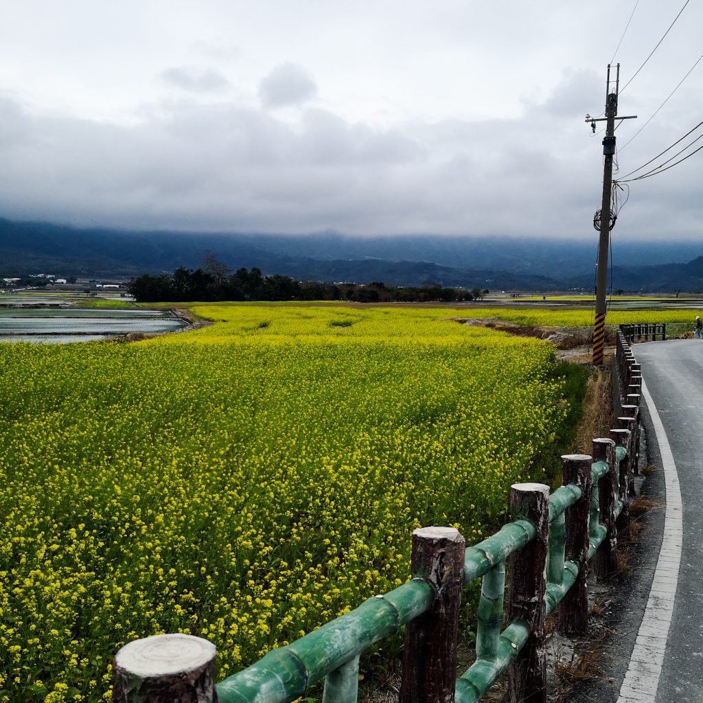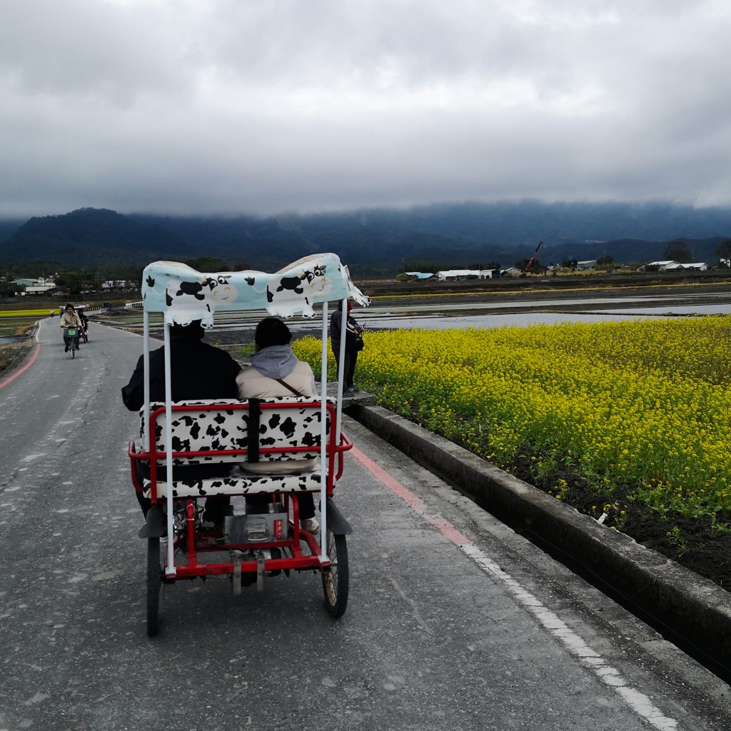 Jetzt wird es aber Zeit für eine Stärkung: Beim 7eleven gibt’s Kaffee, ein Sandwich und eine heiße Süßkartoffel. Das tut wirklich gut. Nachdem draußen alles in Wolken und Nebel verhangen ist, sind die Temperaturen entsprechend frisch. Hinzu kommt noch der Gegenwind. Als Zwischenstopp auf der Strecke ist die Mr. Brown Straße empfohlen. Nicht weit entfernt von der eigentlichen Route geht es auf eine Straße, die zwischen Reisfeldern liegt und aufgrund der landschaftlich schönen Szenerie in der Vergangenheit als Hintergrund für einen Mr. Brown Werbespot diente. Die Kaffeemarke kennt hier so ziemlich jeder. Da gibt es aktuell nur ein paar kleine Haken: Der Reis ist nicht in seiner schönen Blütezeit und das Wetter ist grau in grau. Dem Namen „green road of paradise“ kommt es auch mit großer fantasievoller Vorstellungskraft nicht nach. Einen Abstecher macht Caro dick eingepackt in ihrer Regenjacke aber dann doch und ist tatsächlich überrascht. Allerdings weniger von der schönen Natur-Szenerie als von den Besucher:innen, die sich wie aus dem Nichts plötzlich hier tummeln. Es ist bei weitem nicht überfüllt oder überlaufen, aber es erscheint doch irgendwie verwunderlich. Die Menschen sind auf elektrischen kleinen Fahrzeugen hier unterwegs. Kein Wunder, dass denen der Gegenwind nicht viel auszumachen scheint. Caro klemmt sich hinter ein mit Kuhflecken getarntes Gefährt und folgt dem Ehepaar unbemerkt im Windschatten bis zur nächsten Anhöhe. Statt dem hellgrün leuchtenden Reispflanzen blühen aber kleine gelbe Blüten. Wo wir schon bei Ostsee-Heimatgefühlen waren, ist das wohl das Adäquat zur Rapsblüte. Nur in kleiner und mit Bergen im Hintergrund. Nach einem kurzen Umweg (es wäre auch auffällig, wenn Caro sich am heutigen Tag nicht mindestens einmal verfahren hätte), geht es weiter auf der Tagesroute.