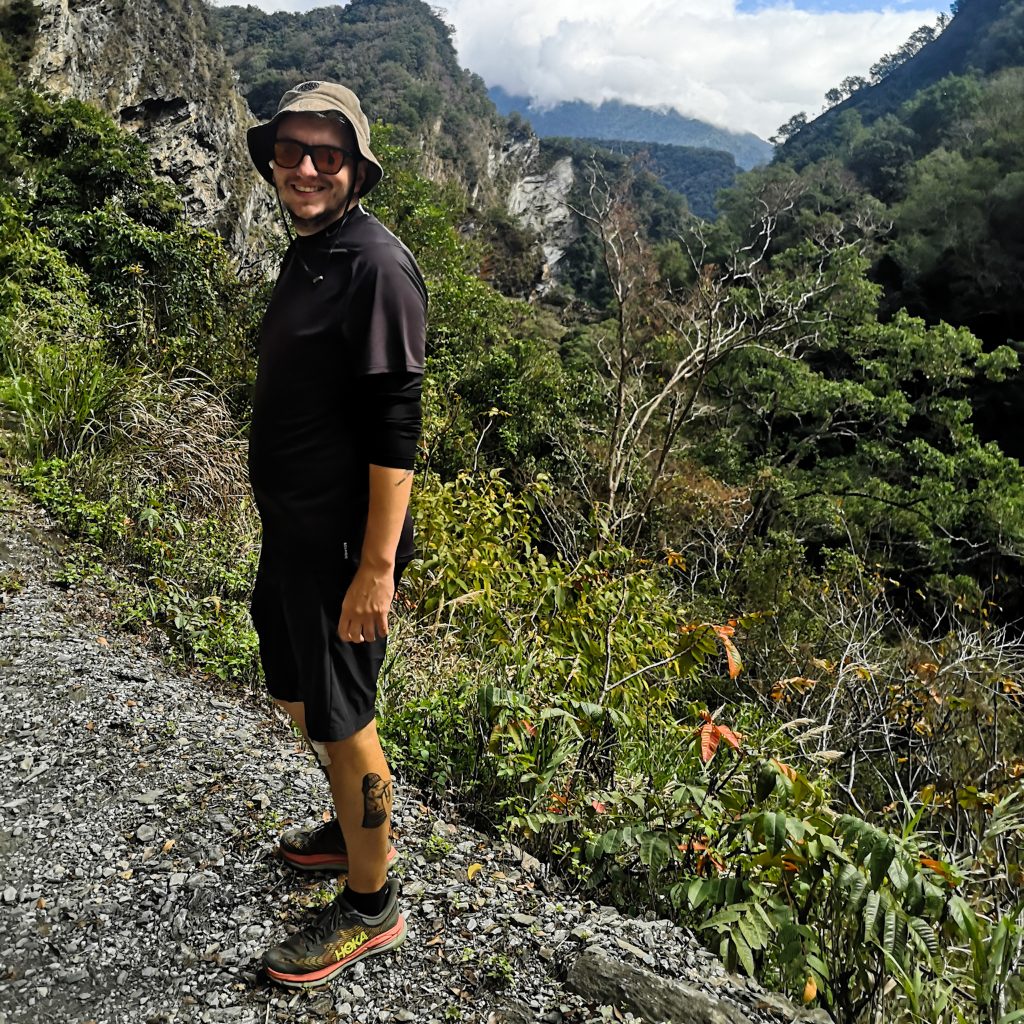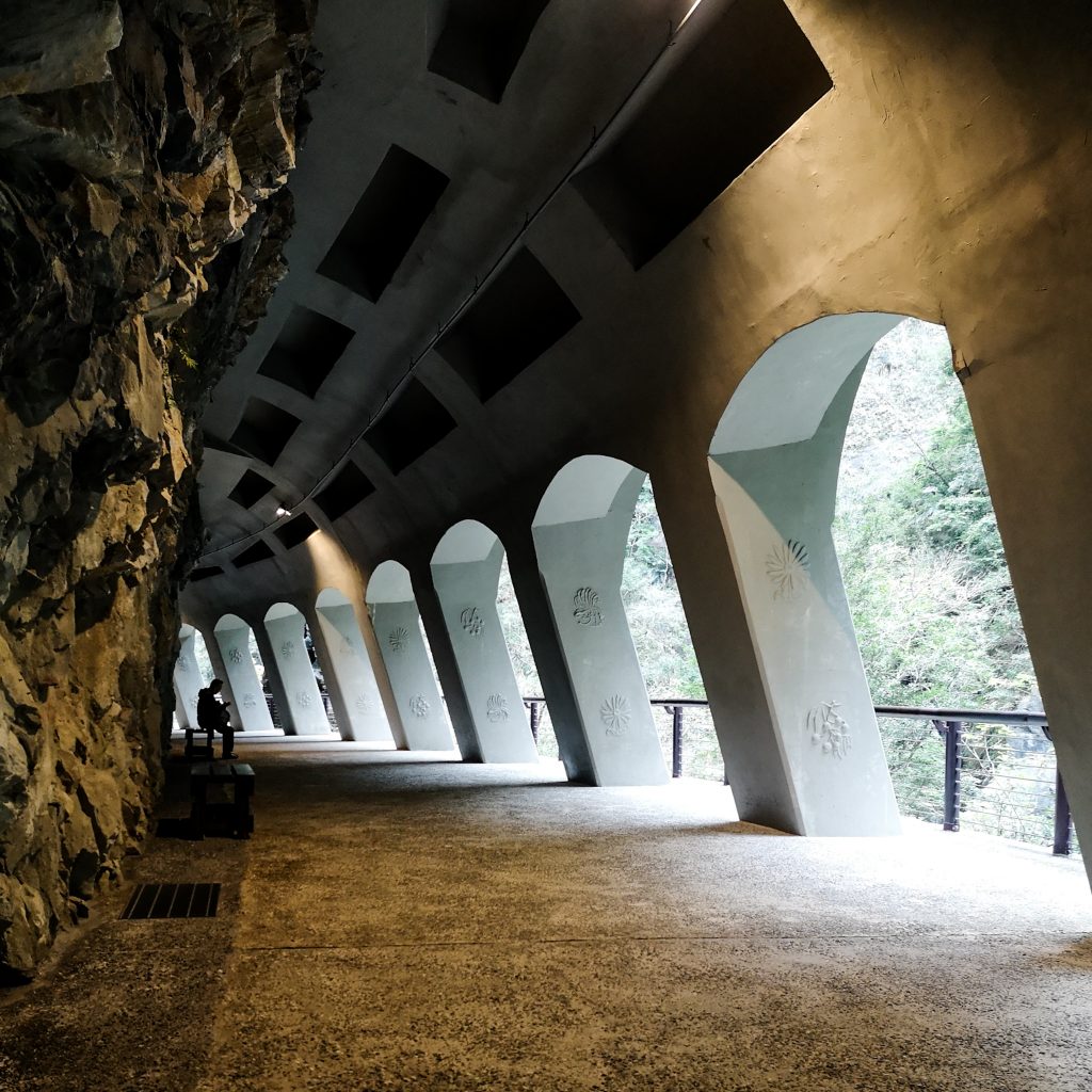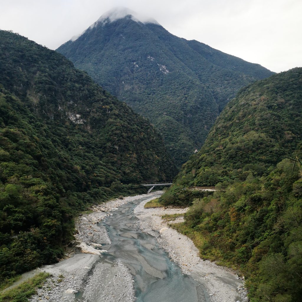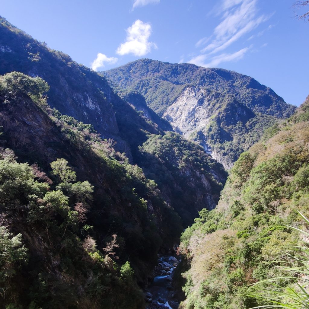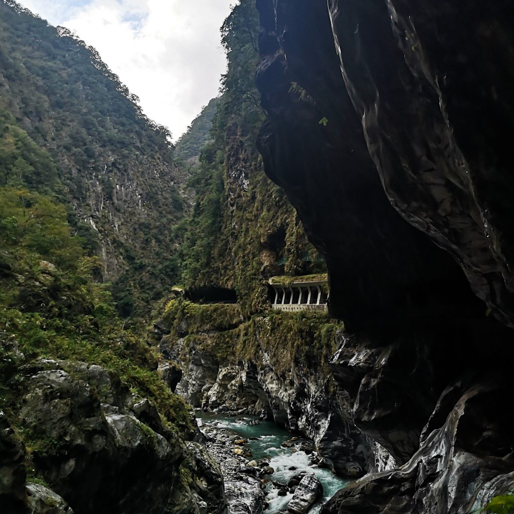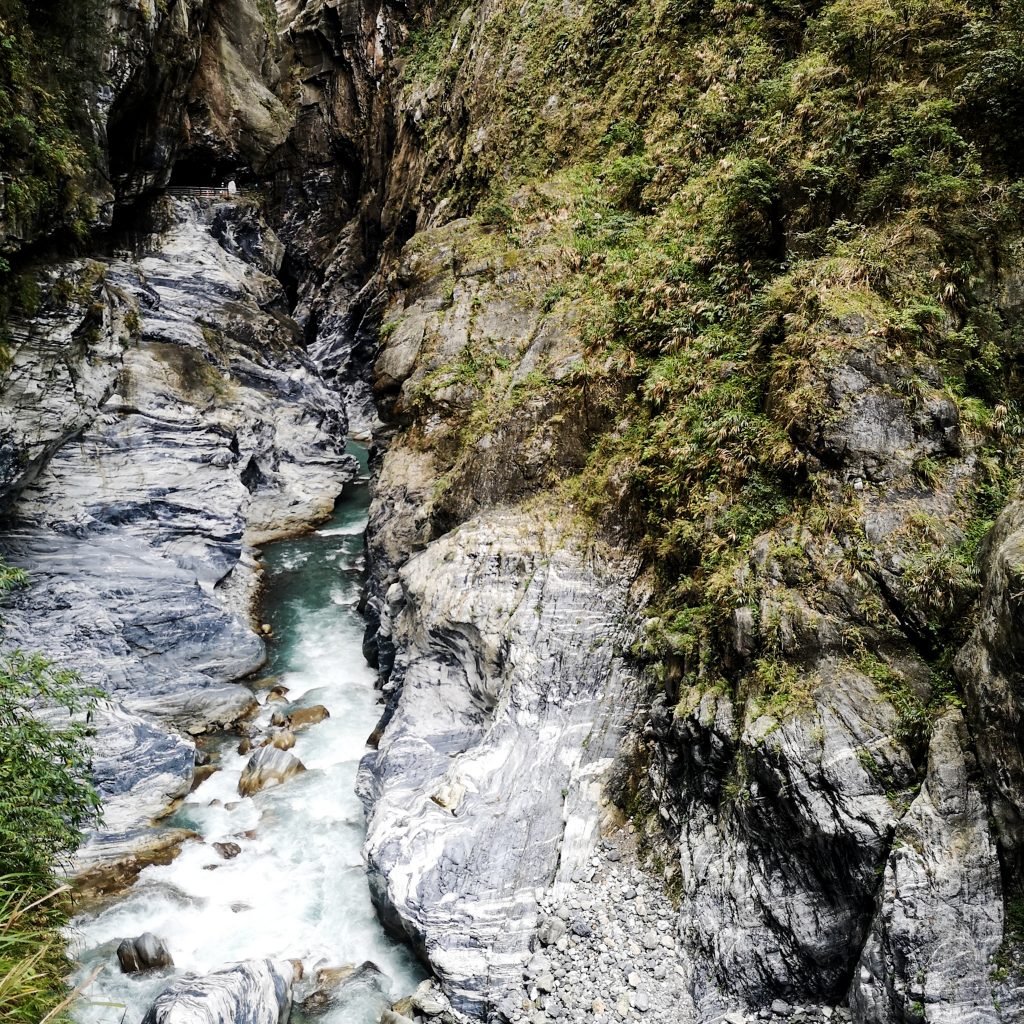Der Taroko Nationalpark ist einer von insgesamt neun Nationalparks in Taiwan. Wie oben schon geteasert, hat er seinen Namen von der Taroko Schlucht, die ihrerseits ihren Namen nach den Truku-Ureinwohner:innen erhalten hat. Er ist der älteste Nationalpark Taiwans und wurde 1937 während der japanischen Kolonialzeit eröffnet. Was uns besonders „ungewöhnlich“ erschien: Durch den Park führt eine Provinzstraße, die den Westen mit dem Osten Taiwans verbindet. Von dieser (in unseren Augen nicht wenig befahrenen) Straße starten die meisten Trails. Es gibt eine Art Shuttlebus, mit dem man von einem zum nächsten Einstieg fahren kann. Die Straße führt entlang der Schlucht, sodass man sagen kann, dass die Besucher:innen von der Straße aus fast die schönsten Aussichten, aber natürlich nicht die schönste Umgebung hat. Immer wieder sind Pagoden, Schreine und Hängebrücken zu entdecken, die sich durch die Berghänge ziehen. Der Fluss, der hier hindurch fließt heißt „Liwu“ was so viel bedeutet wie „großartig und schön“. Und dann gibt es noch etwas zu entdecken: Marmor. Der Marmor, der heute in der Schlucht zu sehen ist, begann sich vor 200 Millionen Jahren als Sedimentablagerungen aus dem Boden des Meeres zu bilden. So entstand Kalkstein. Der Druck der zwischen der philippinischen und der eurasischen Erdplatten, drückten über 100 Millionen Jahre den Kalkstein zu Marmor, der dann aufgefaltet wurde. Noch heute wird die Region jedes Jahr um 0,5 cm angehoben, wodurch es gelegentlich zu Erdbeben und Steinschlägen kommt – genau wie heute Nacht. Lustigerweise hat uns heute morgen ein netter, älterer Herr (Nadja und Lukas erzählten uns, dass er sich Henry nennt) gewarnt: Nach einem Erdbeben sollen wir unbedingt ganz besonders vorsichtig sein, da sich auch nach dem Beben noch größere Steine lösen und herunterstürzen können. Das macht Sinn. Tatsächlich sehen wir auch immer wieder Warnschilder und Hinweise, dass es zu Steinschlägen kommen kann und dass man in gewissen Bereichen besonders vorsichtig sein soll. Für unsere Mamas: Wir sind ja immer vorsichtig, also keine Sorge.
