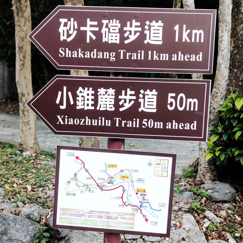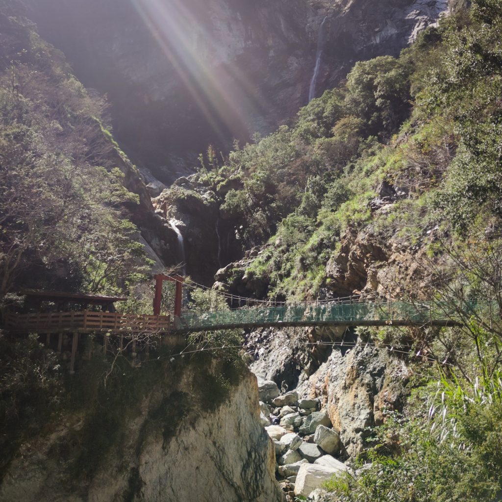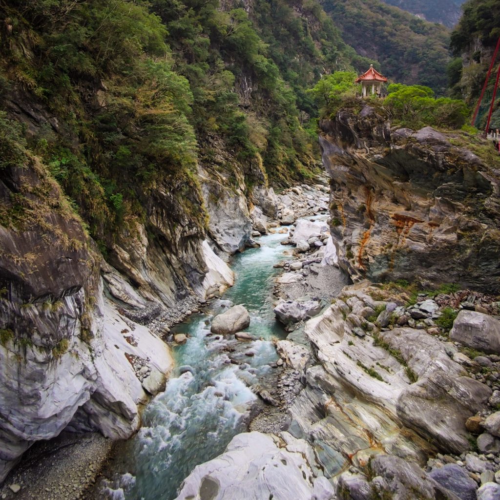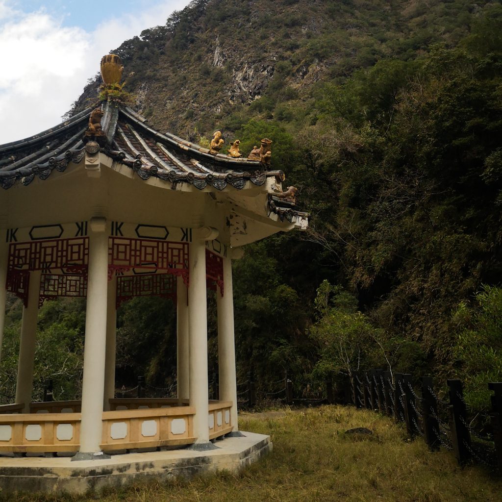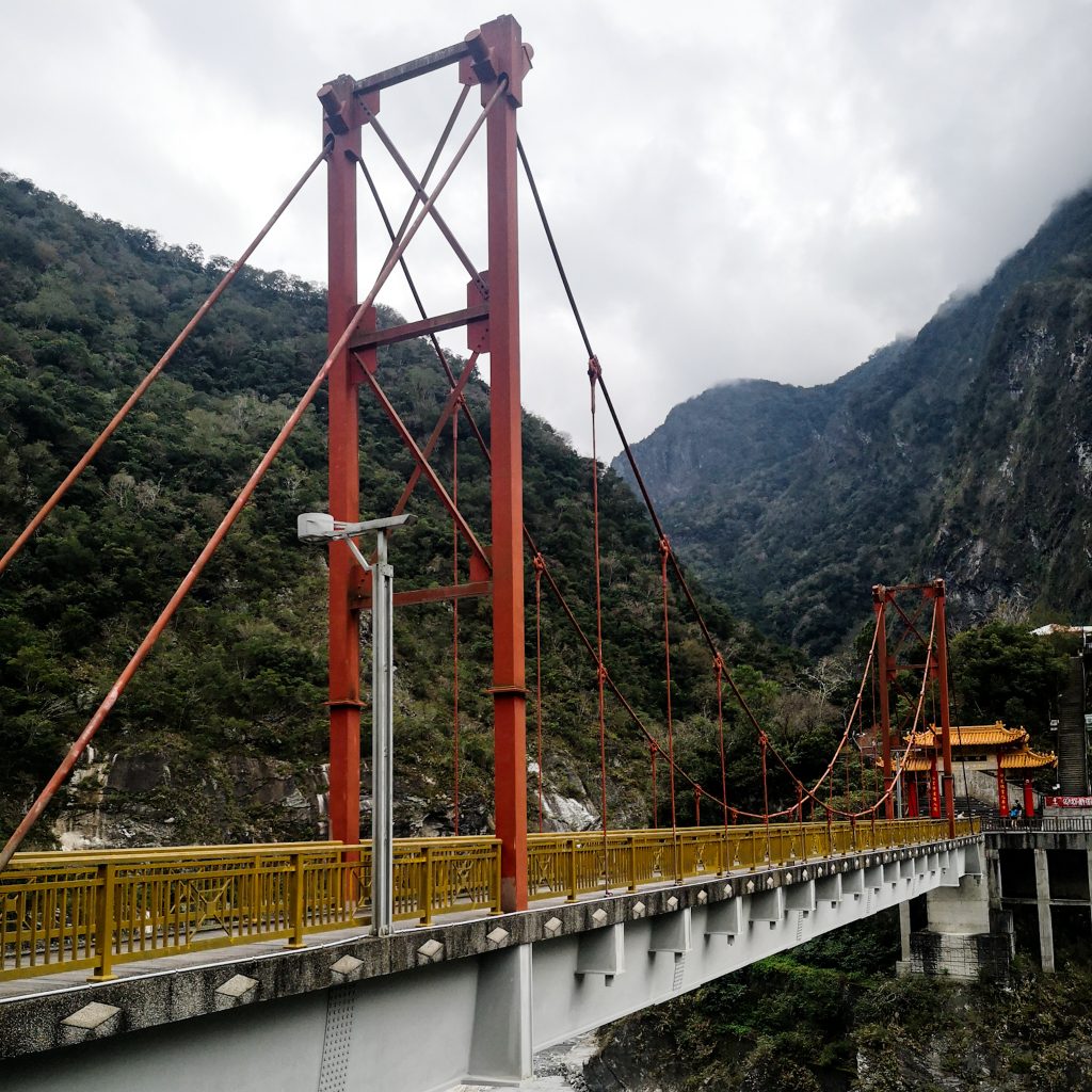 Der Taroko Nationalpark ist einer von insgesamt neun Nationalparks in Taiwan. Wie oben schon geteasert, hat er seinen Namen von der Taroko Schlucht, die ihrerseits ihren Namen nach den Truku-Ureinwohner:innen erhalten hat. Er ist der älteste Nationalpark Taiwans und wurde 1937 während der japanischen Kolonialzeit eröffnet. Was uns besonders „ungewöhnlich“ erschien: Durch den Park führt eine Provinzstraße, die den Westen mit dem Osten Taiwans verbindet. Von dieser (in unseren Augen nicht wenig befahrenen) Straße starten die meisten Trails. Es gibt eine Art Shuttlebus, mit dem man von einem zum nächsten Einstieg fahren kann. Die Straße führt entlang der Schlucht, sodass man sagen kann, dass die Besucher:innen von der Straße aus fast die schönsten Aussichten, aber natürlich nicht die schönste Umgebung hat. Immer wieder sind Pagoden, Schreine und Hängebrücken zu entdecken, die sich durch die Berghänge ziehen. Der Fluss, der hier hindurch fließt heißt „Liwu“ was so viel bedeutet wie „großartig und schön“. Und dann gibt es noch etwas zu entdecken: Marmor. Der Marmor, der heute in der Schlucht zu sehen ist, begann sich vor 200 Millionen Jahren als Sedimentablagerungen aus dem Boden des Meeres zu bilden. So entstand Kalkstein. Der Druck der zwischen der philippinischen und der eurasischen Erdplatten, drückten über 100 Millionen Jahre den Kalkstein zu Marmor, der dann aufgefaltet wurde. Noch heute wird die Region jedes Jahr um 0,5 cm angehoben, wodurch es gelegentlich zu Erdbeben und Steinschlägen kommt – genau wie heute Nacht. Lustigerweise hat uns heute morgen ein netter, älterer Herr (Nadja und Lukas erzählten uns, dass er sich Henry nennt) gewarnt: Nach einem Erdbeben sollen wir unbedingt ganz besonders vorsichtig sein, da sich auch nach dem Beben noch größere Steine lösen und herunterstürzen können. Das macht Sinn. Tatsächlich sehen wir auch immer wieder Warnschilder und Hinweise, dass es zu Steinschlägen kommen kann und dass man in gewissen Bereichen besonders vorsichtig sein soll. Für unsere Mamas: Wir sind ja immer vorsichtig, also keine Sorge.