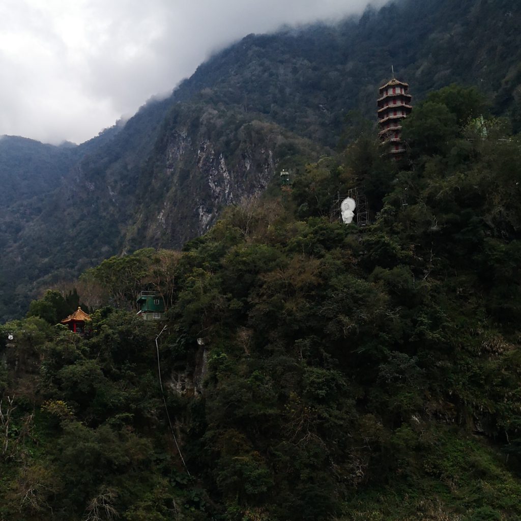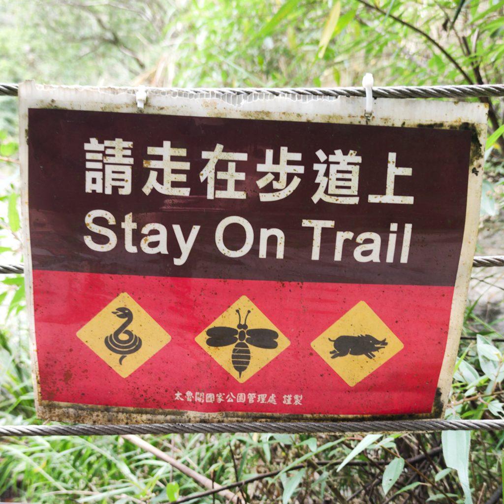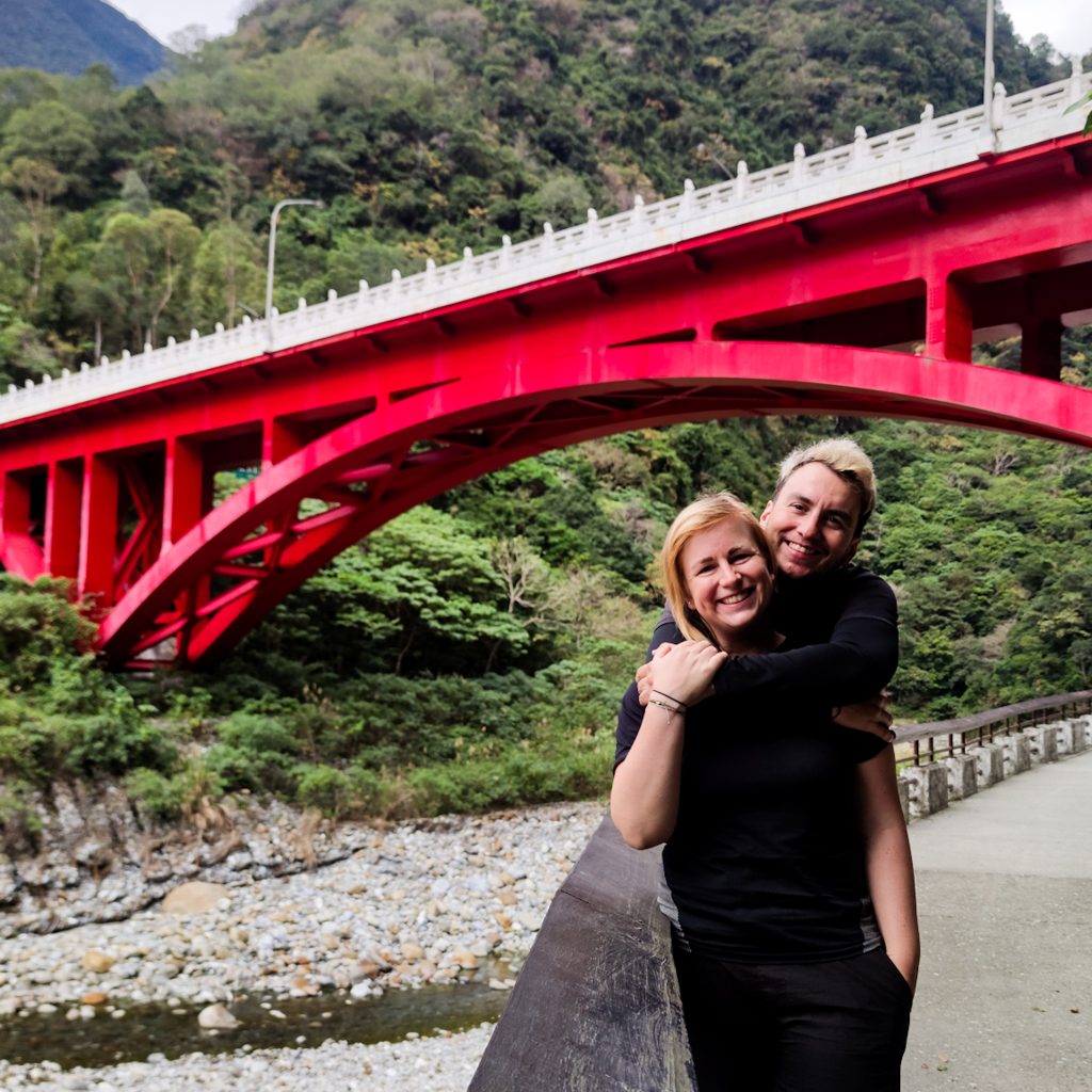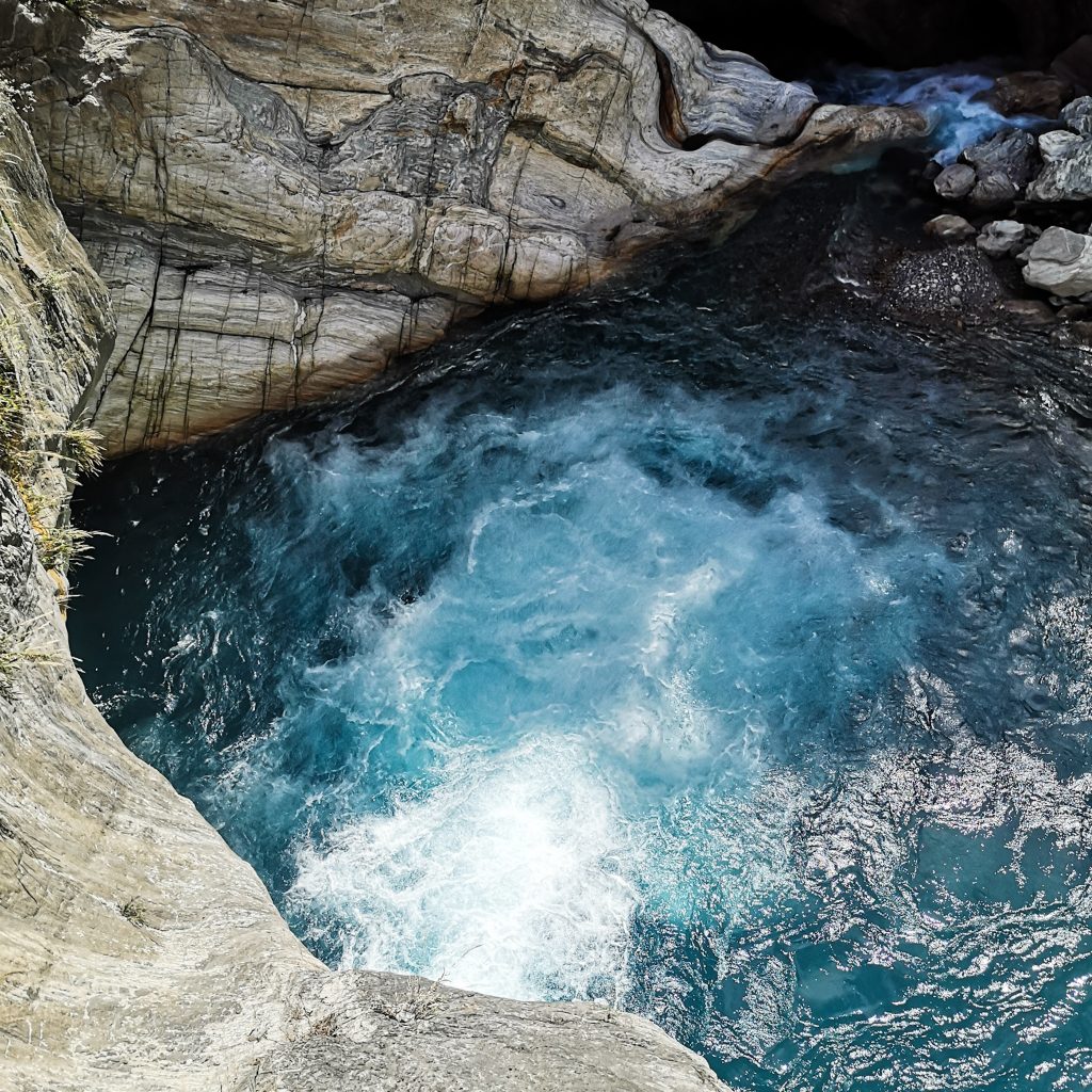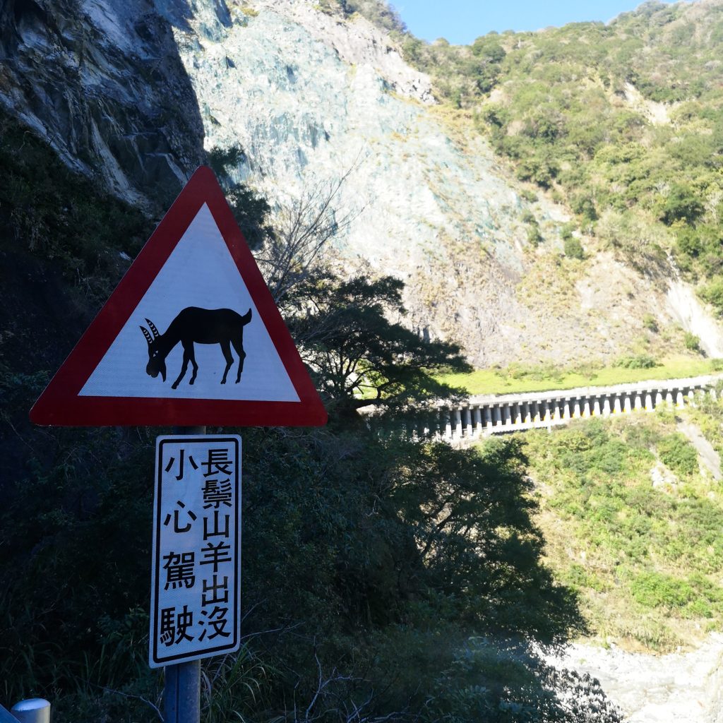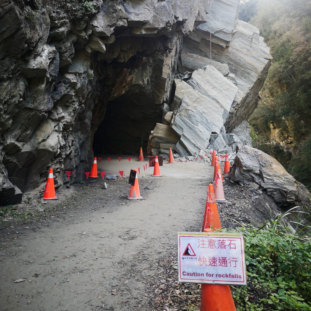 Der Taroko Nationalpark ist einer von insgesamt neun Nationalparks in Taiwan. Wie oben schon geteasert, hat er seinen Namen von der Taroko Schlucht, die ihrerseits ihren Namen nach den Truku-Ureinwohner:innen erhalten hat. Er ist der älteste Nationalpark Taiwans und wurde 1937 während der japanischen Kolonialzeit eröffnet. Was uns besonders „ungewöhnlich“ erschien: Durch den Park führt eine Provinzstraße, die den Westen mit dem Osten Taiwans verbindet. Von dieser (in unseren Augen nicht wenig befahrenen) Straße starten die meisten Trails. Es gibt eine Art Shuttlebus, mit dem man von einem zum nächsten Einstieg fahren kann. Die Straße führt entlang der Schlucht, sodass man sagen kann, dass die Besucher:innen von der Straße aus fast die schönsten Aussichten, aber natürlich nicht die schönste Umgebung hat. Immer wieder sind Pagoden, Schreine und Hängebrücken zu entdecken, die sich durch die Berghänge ziehen. Der Fluss, der hier hindurch fließt heißt „Liwu“ was so viel bedeutet wie „großartig und schön“. Und dann gibt es noch etwas zu entdecken: Marmor. Der Marmor, der heute in der Schlucht zu sehen ist, begann sich vor 200 Millionen Jahren als Sedimentablagerungen aus dem Boden des Meeres zu bilden. So entstand Kalkstein. Der Druck der zwischen der philippinischen und der eurasischen Erdplatten, drückten über 100 Millionen Jahre den Kalkstein zu Marmor, der dann aufgefaltet wurde. Noch heute wird die Region jedes Jahr um 0,5 cm angehoben, wodurch es gelegentlich zu Erdbeben und Steinschlägen kommt – genau wie heute Nacht. Lustigerweise hat uns heute morgen ein netter, älterer Herr (Nadja und Lukas erzählten uns, dass er sich Henry nennt) gewarnt: Nach einem Erdbeben sollen wir unbedingt ganz besonders vorsichtig sein, da sich auch nach dem Beben noch größere Steine lösen und herunterstürzen können. Das macht Sinn. Tatsächlich sehen wir auch immer wieder Warnschilder und Hinweise, dass es zu Steinschlägen kommen kann und dass man in gewissen Bereichen besonders vorsichtig sein soll. Für unsere Mamas: Wir sind ja immer vorsichtig, also keine Sorge.