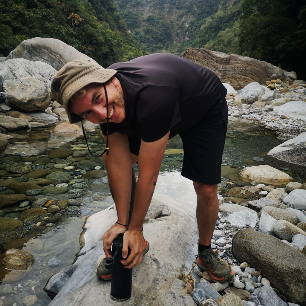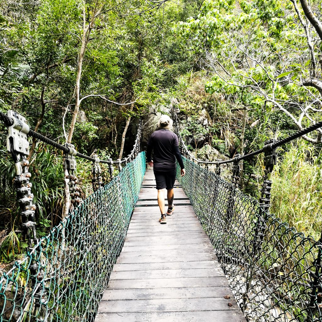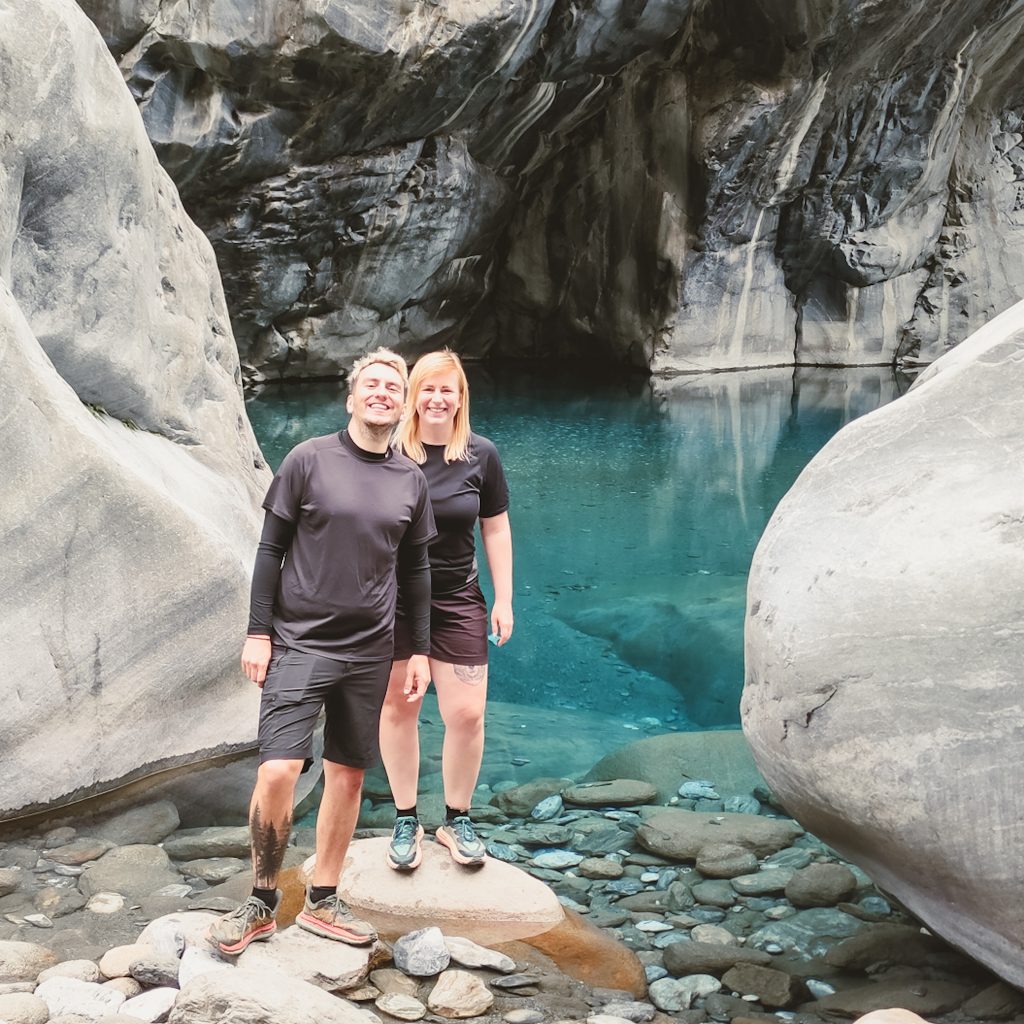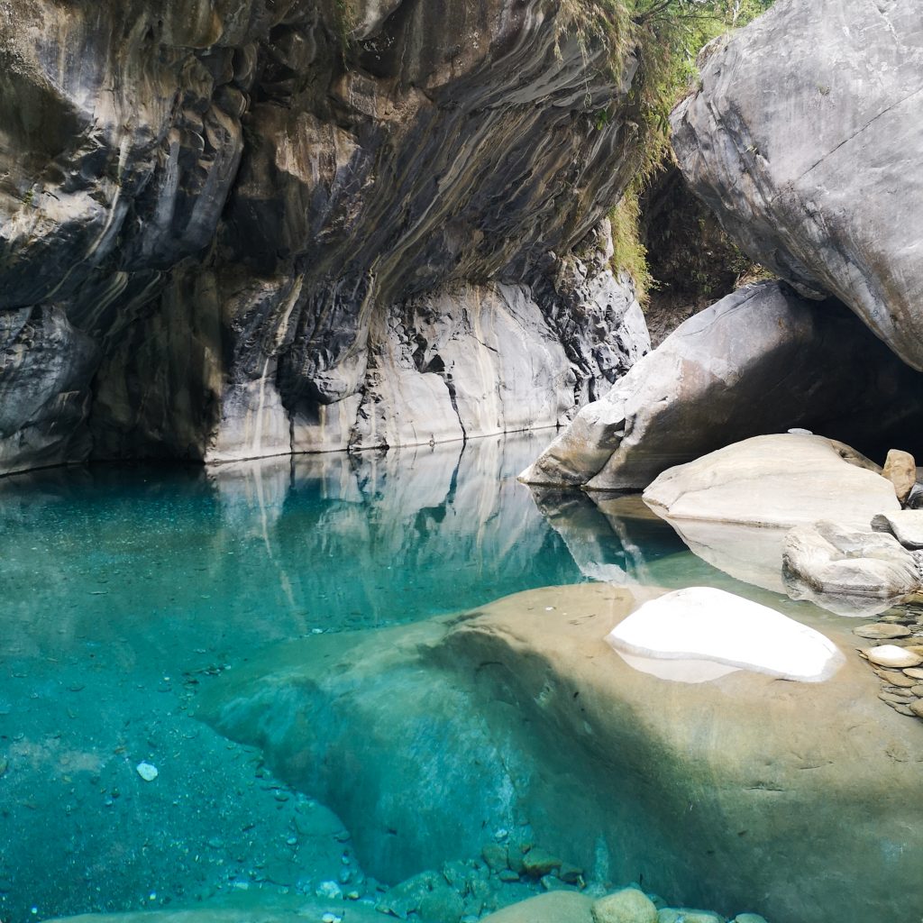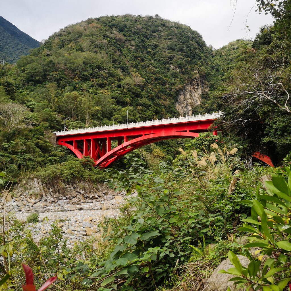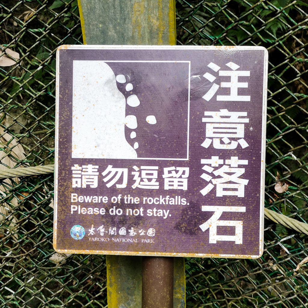 Der Taroko Nationalpark ist einer von insgesamt neun Nationalparks in Taiwan. Wie oben schon geteasert, hat er seinen Namen von der Taroko Schlucht, die ihrerseits ihren Namen nach den Truku-Ureinwohner:innen erhalten hat. Er ist der älteste Nationalpark Taiwans und wurde 1937 während der japanischen Kolonialzeit eröffnet. Was uns besonders „ungewöhnlich“ erschien: Durch den Park führt eine Provinzstraße, die den Westen mit dem Osten Taiwans verbindet. Von dieser (in unseren Augen nicht wenig befahrenen) Straße starten die meisten Trails. Es gibt eine Art Shuttlebus, mit dem man von einem zum nächsten Einstieg fahren kann. Die Straße führt entlang der Schlucht, sodass man sagen kann, dass die Besucher:innen von der Straße aus fast die schönsten Aussichten, aber natürlich nicht die schönste Umgebung hat. Immer wieder sind Pagoden, Schreine und Hängebrücken zu entdecken, die sich durch die Berghänge ziehen. Der Fluss, der hier hindurch fließt heißt „Liwu“ was so viel bedeutet wie „großartig und schön“. Und dann gibt es noch etwas zu entdecken: Marmor. Der Marmor, der heute in der Schlucht zu sehen ist, begann sich vor 200 Millionen Jahren als Sedimentablagerungen aus dem Boden des Meeres zu bilden. So entstand Kalkstein. Der Druck der zwischen der philippinischen und der eurasischen Erdplatten, drückten über 100 Millionen Jahre den Kalkstein zu Marmor, der dann aufgefaltet wurde. Noch heute wird die Region jedes Jahr um 0,5 cm angehoben, wodurch es gelegentlich zu Erdbeben und Steinschlägen kommt – genau wie heute Nacht. Lustigerweise hat uns heute morgen ein netter, älterer Herr (Nadja und Lukas erzählten uns, dass er sich Henry nennt) gewarnt: Nach einem Erdbeben sollen wir unbedingt ganz besonders vorsichtig sein, da sich auch nach dem Beben noch größere Steine lösen und herunterstürzen können. Das macht Sinn. Tatsächlich sehen wir auch immer wieder Warnschilder und Hinweise, dass es zu Steinschlägen kommen kann und dass man in gewissen Bereichen besonders vorsichtig sein soll. Für unsere Mamas: Wir sind ja immer vorsichtig, also keine Sorge.