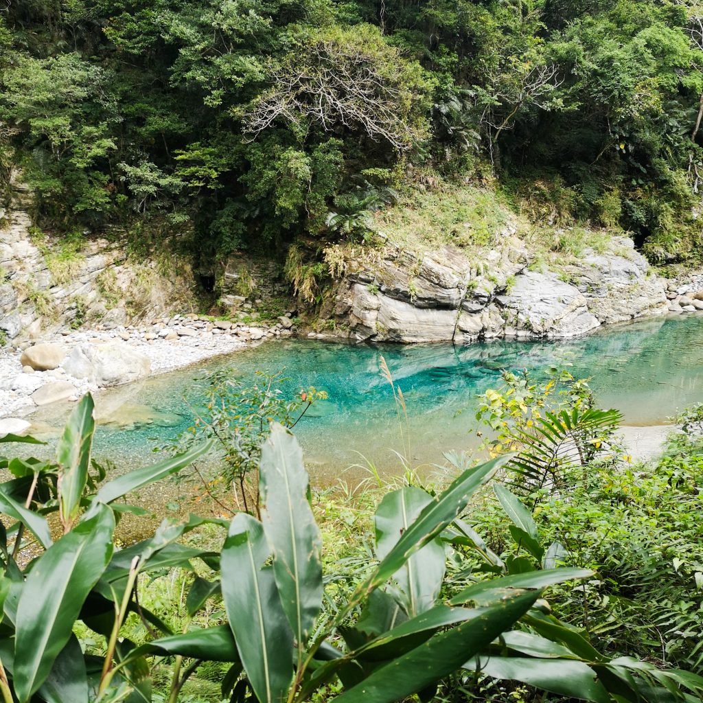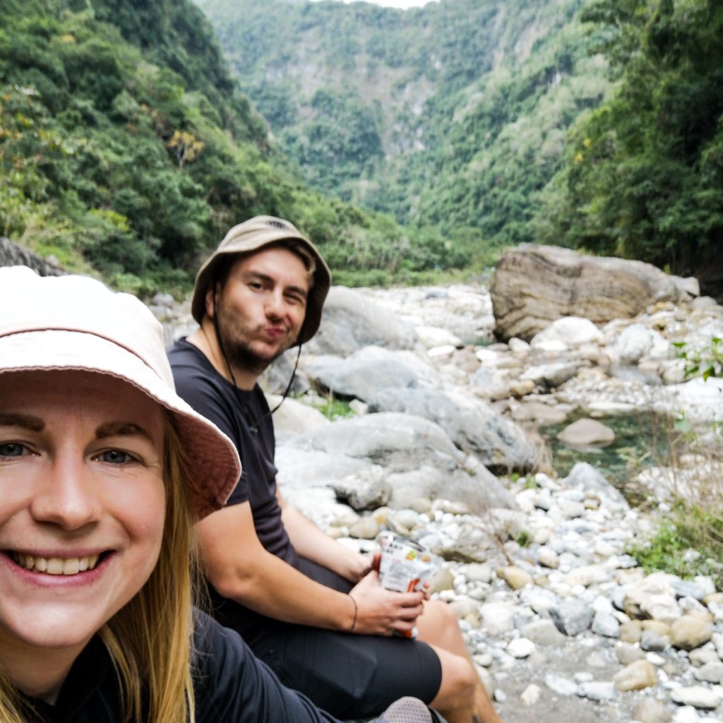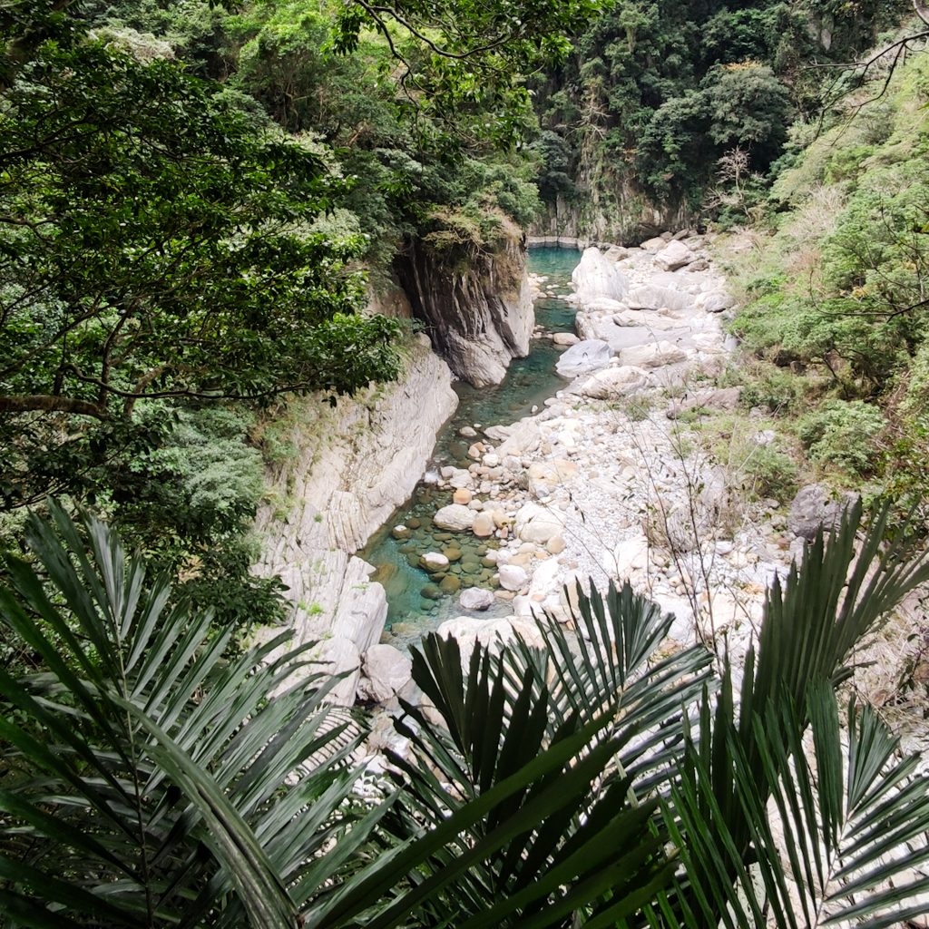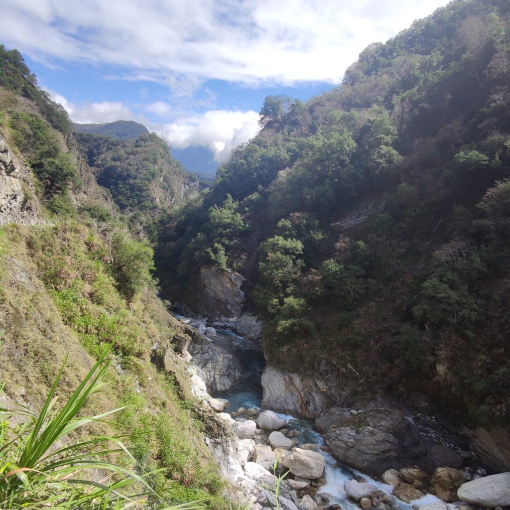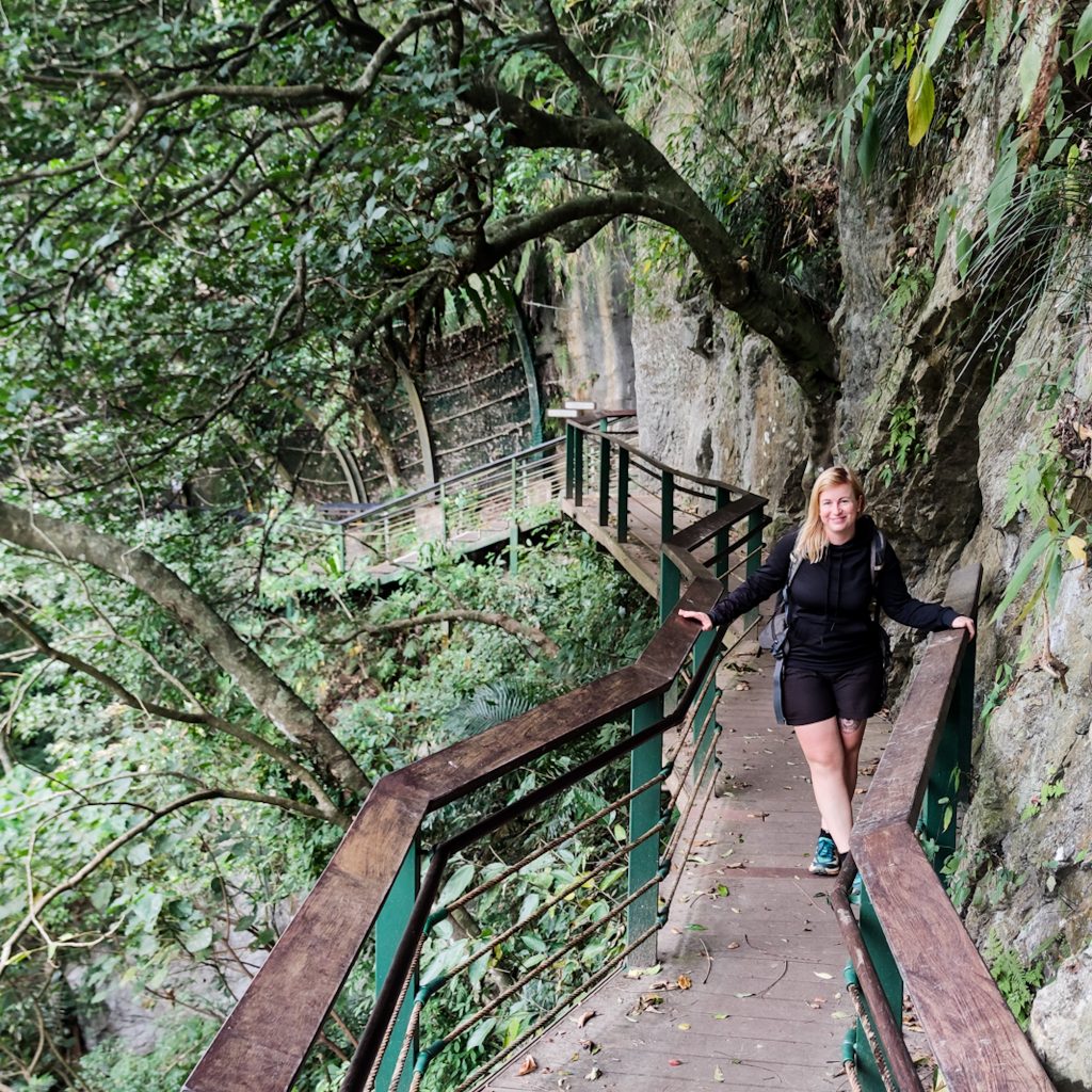 Die beiden Wege sind gut ausgeschildert und wir starten direkt die erste kurze Runde. Der Xiaozhuilu Trail ist nur knapp über einen Kilometer lang. Der einzige Haken sind zahlreiche Treppen, die wir herauf und wieder runter müssen. Genau das richtige für Konstis angeschlagenes Knie. Aber wir haben ja Zeit und gehen ausnahmsweise mal ganz besonders entspannt die Routen an. Tatsächlich legen wir sonst einen guten Schritt vor und stehen normalerweise immer besonders früh auf. Es tut aber gut, das ganze auch etwas entspannter zu sehen, sich viel Zeit zu nehmen und an coolen Orten auch mal länger zu verweilen. Direkt zu Beginn ist die Aussicht richtig schön. Zwischen den Bergen ist direkt ein Fluss zu sehen. Schließlich ist genau dafür auch der Taroko Nationalpark bekannt.