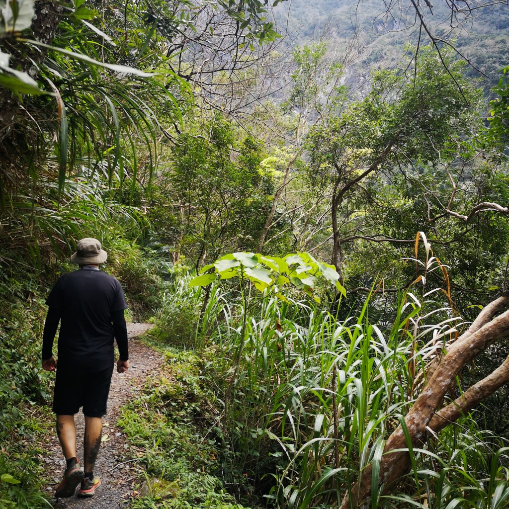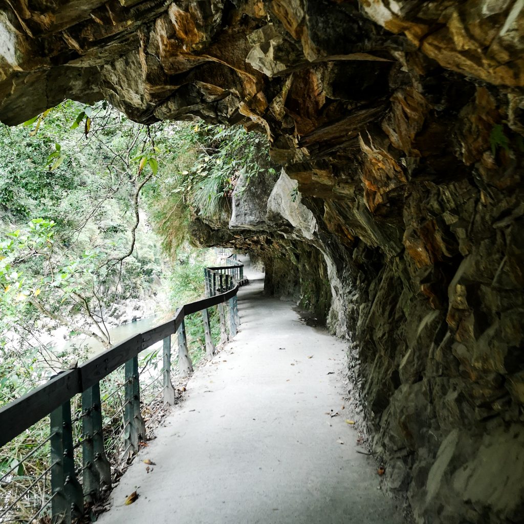 Direkt im Anschluss geht es auf den Shakadang Trail, der Weg (man geht den gleichen Weg hin und zurück) ist ebenfalls nur 4,1 also in Summe 8,2 km lang. Zu unserer Freude sind hier deutlich weniger Stufen. Dafür laufen wir entlang des Felsens, zum großen Teil unter einem angelegten Weg unter dem Felsen. Dieser wurde damals von den Japanern hier in den Fels geschlagen. Aus diesem Grund, so sagt man hier, ist die Höhe des Durchgangs nicht so hoch aus dem Felsen geschlagen worden und man muss, als durchschnittlich großer Westeuropäer, besonders auf seinen Kopf achten.