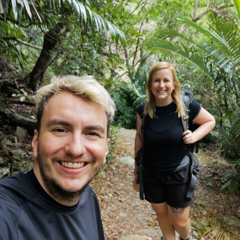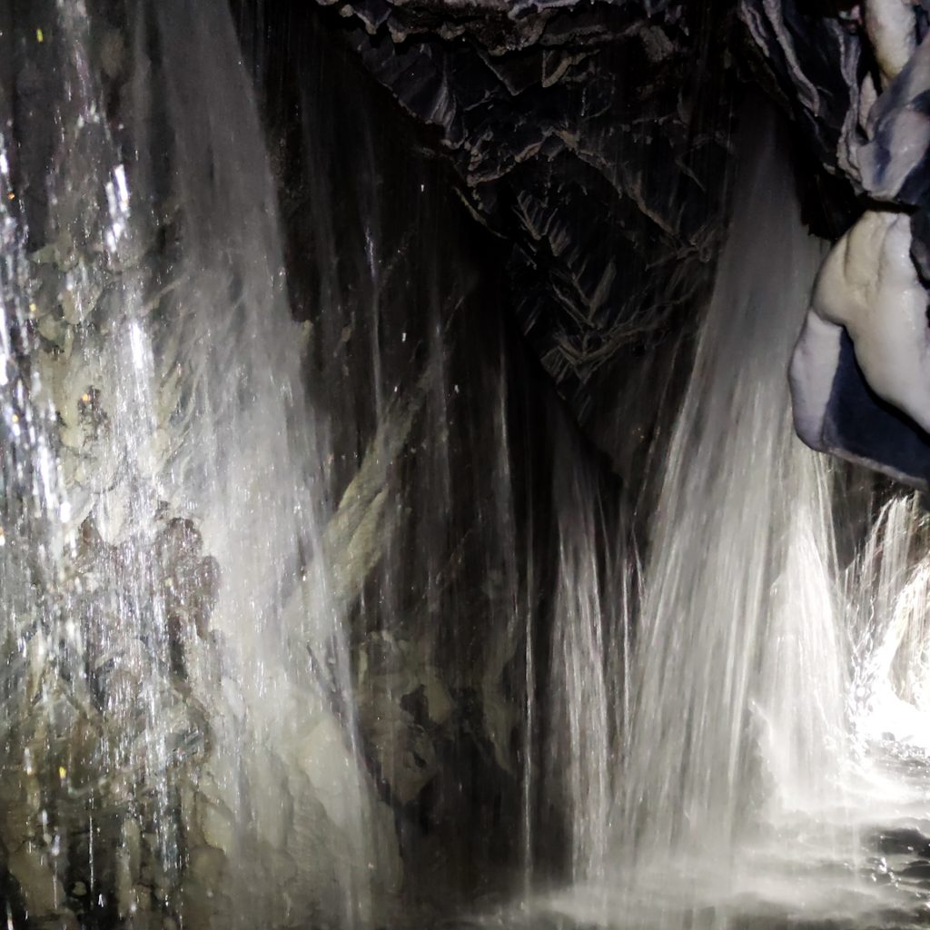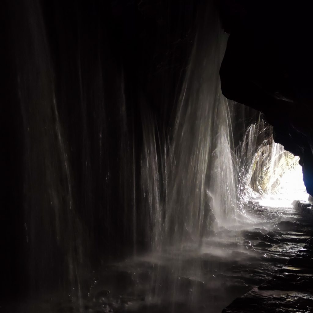 Die Wege sind wieder gut ausgebaut und verlaufen kann man sich quasi nicht. Gegen Ende erwartet uns ein unerwartetes Highlight. Wir laufen in eine Höhle, in der ein Wasserfall ist. Genauer gesagt laufen wir quasi hindurch, denn von oben plätschert richtig viel Wasser auf den schmalen Steinweg. Es sieht richtig cool aus. Wir stülpen noch schnell den Regenschutz über den Rucksack und laufen dann einmal bis zum anderen Ende der Höhle. Als wir wieder rauskommen sind wir ganz schön nass, jetzt wissen wir, warum die anderen Menschen mit Regenjacke und -schirm ausgestattet waren.