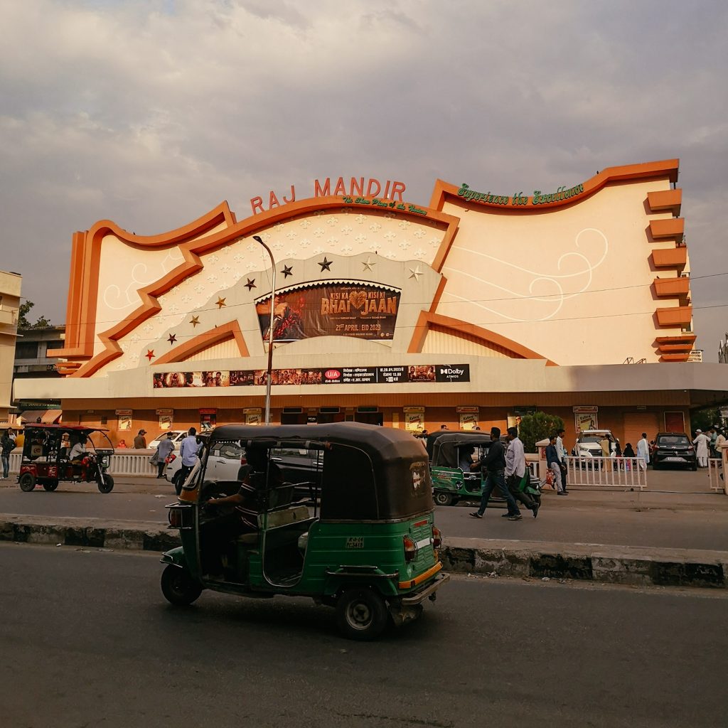Das Raj Mandir Kino ist für seine kitschigen Bollywood Filme im passenden Flair bekannt. Das rosa verzierte Innere mit verschnörkelten Wänden, Teppichboden und der passenden Beleuchtung bringt die Zuschauer:innen schon beim Betreten des Kinos in Stimmung.