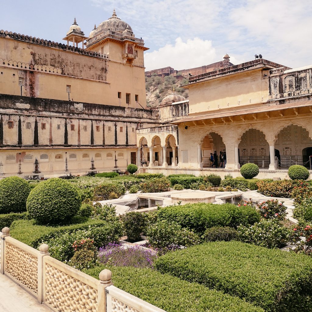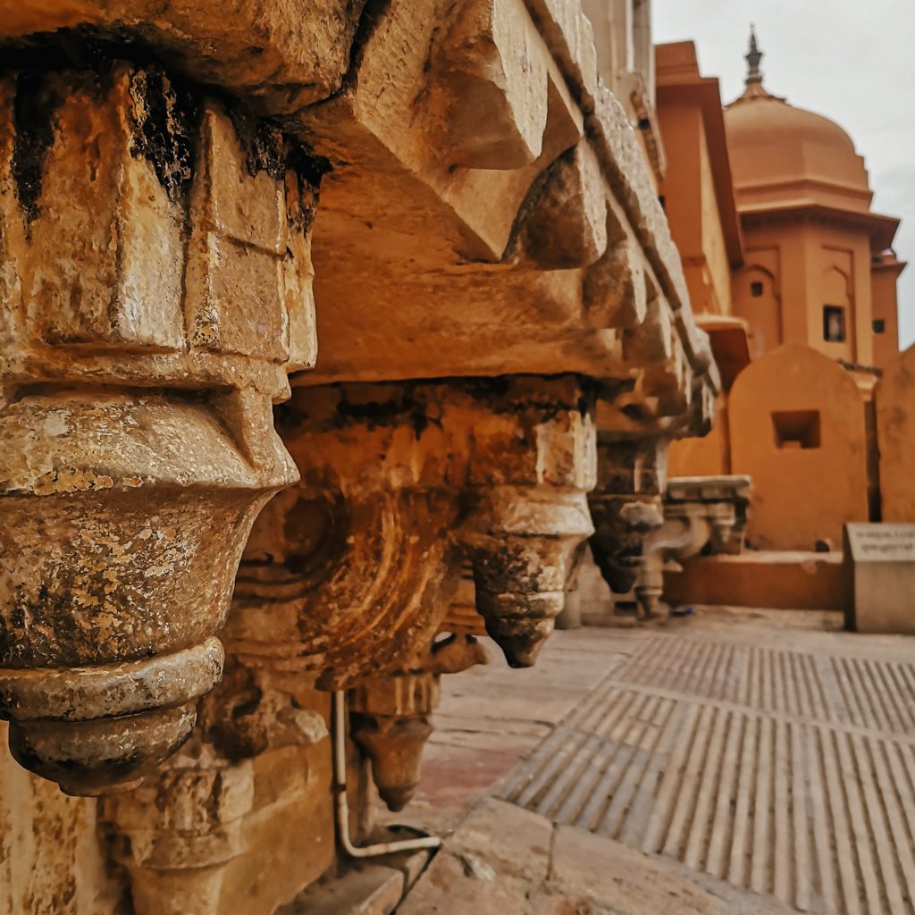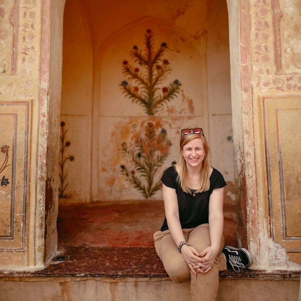 Heute fahren wir nochmal Public Bus. Der nette Typ vom Hostel gibt uns die Nummer des Busses und sagt, dass wir ihn an der Straße einfach anhalten sollen. Gesagt getan. Das war einfacher als gedacht. Das Amber Fort liegt nämlich ca. 11 km außerhalb der Stadt. Der opulente Palast wurde aus Sandstein und Marmor gebaut und erstreckt sich auf vier Etagen. Kein Wunder, Raja Man Singh hatte 12 Königinnen, jede von ihnen hatte ihr eigenes Zimmer. Da braucht man schon ein bisschen Platz. Wir verlieren uns in den verschiedenen Gängen und kommen mehr als einmal wieder an der gleichen Stelle heraus. Im Innenhof befinden sich schön angelegte Gärten und ein Spiegelsaal, in dem zahlreiche Mosaike und kleine Spiegel verbaut sind. Wo man auch hinschaut, befinden sich schöne Malereien, Säulen und wunderschöne Torbögen. Ein kleiner Instagram- und Foto-Hotspot.