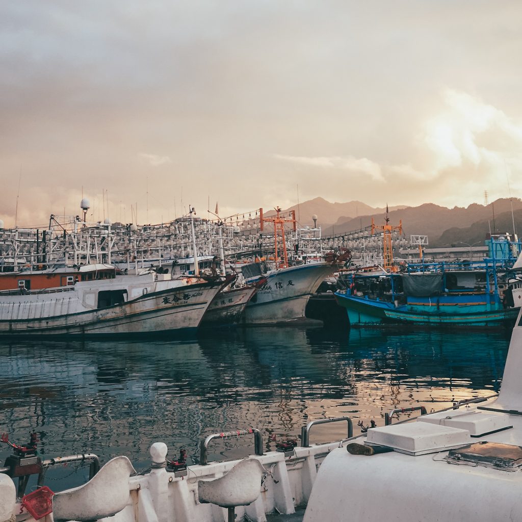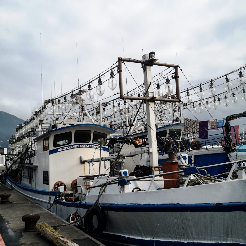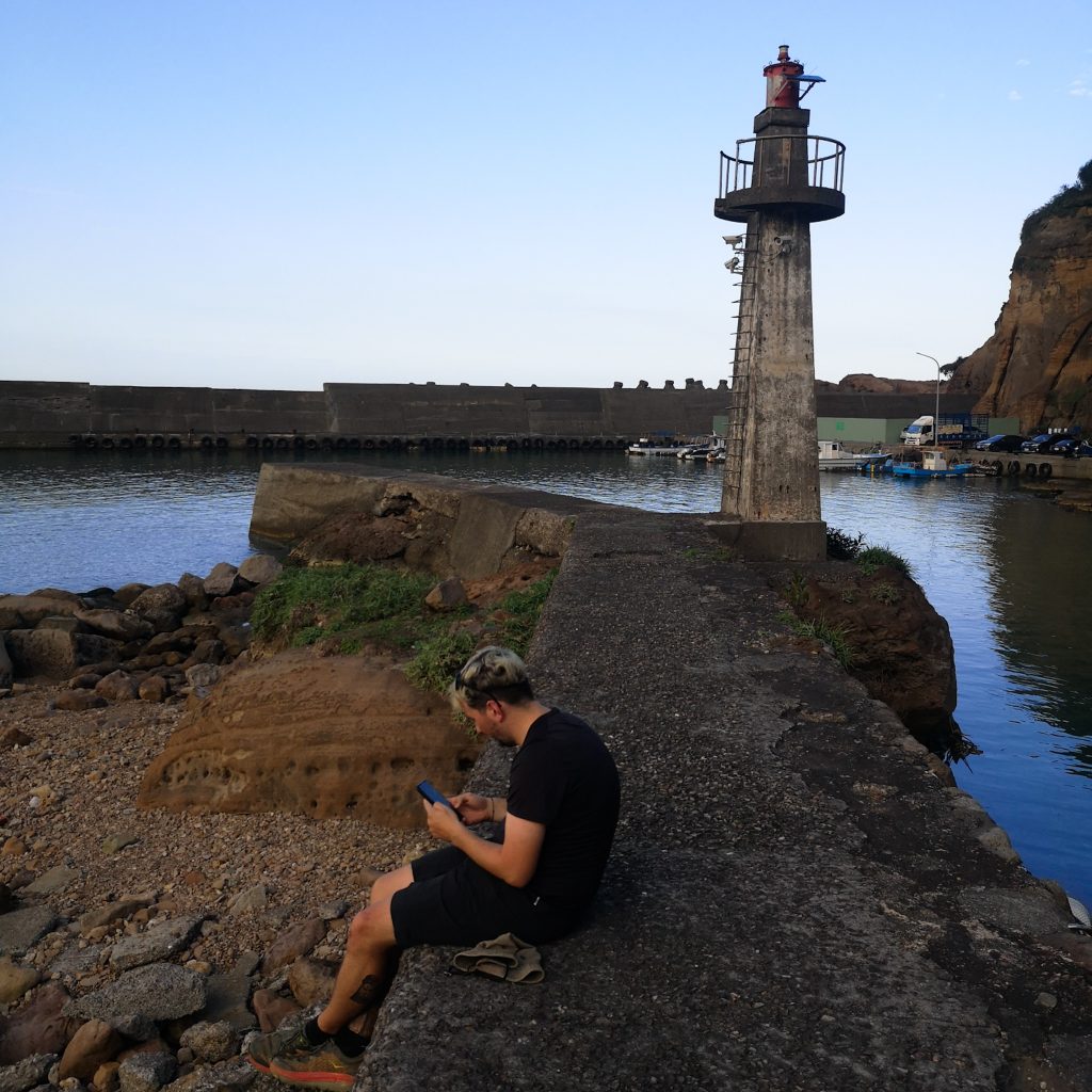 Den ersten kleinen Anstieg meistern sie scheinbar federleicht und danach geht es das meiste Stück bergab (blöd nur, dass wir das nachher wieder hochfahren müssen..). Wir fahren entlang der Küste bis zu einem kleinen Hafen. Irgendwie ist es hier ganz süß. Ein paar kleine Läden, kaum Menschen und schon gar keine Tourist:innen. Die Fischerboote liegen alle bereits wieder im Hafen. Es sieht so aus als würden große Glühbirnen-Lichterketten an ihnen hängen. Richtig schön.