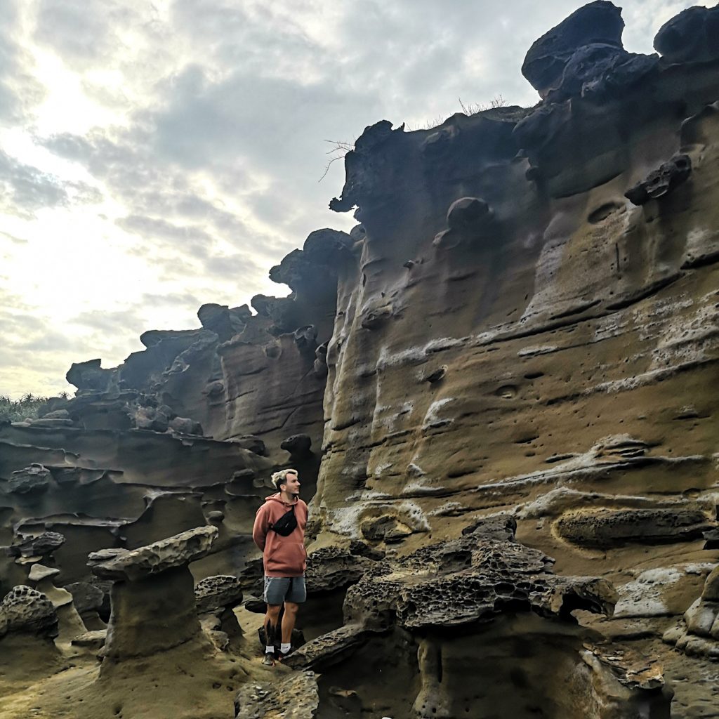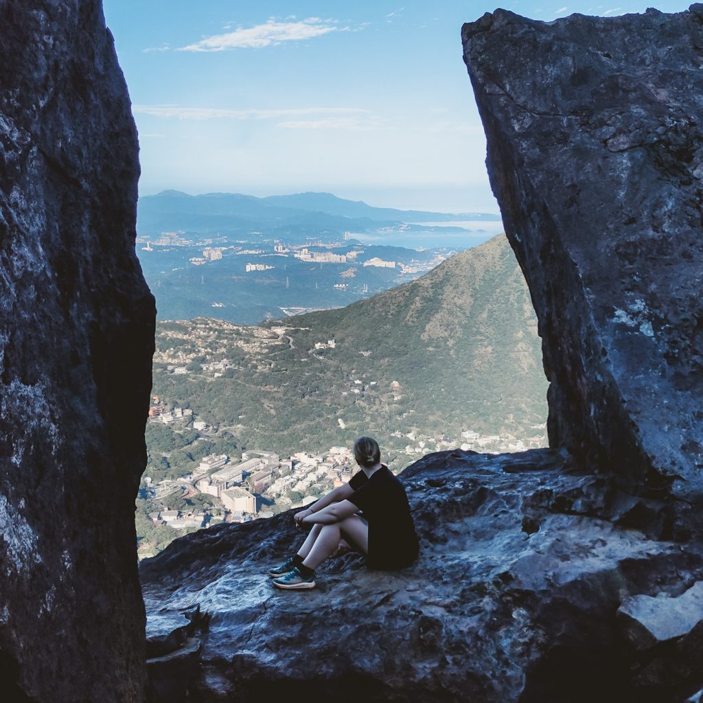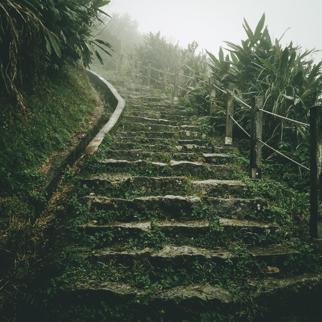 Wir wussten es ja bereits, aber wir können nochmal bestätigen: Die Wettervorhersage hält, was sie verspricht. Schon am frühen Morgen, als wir uns wieder auf den Weg zum Bus machen, ist es grau und regnerisch. Das wird sich heute auch nicht mehr ändern. Wir starten heute mit einer sehr kurzen Wanderung auf einen kleinen Berg direkt oberhalb von Jiufen. Es geht wieder Stufe für Stufe bergauf. Heute allerdings ohne eine traumhafte Aussicht auf die umliegenden Berge und das Meer. Alles, was wir sehen, ist Nebel, die nächsten Stufen vor uns und ein bisschen grünes Gewächs am Rand.