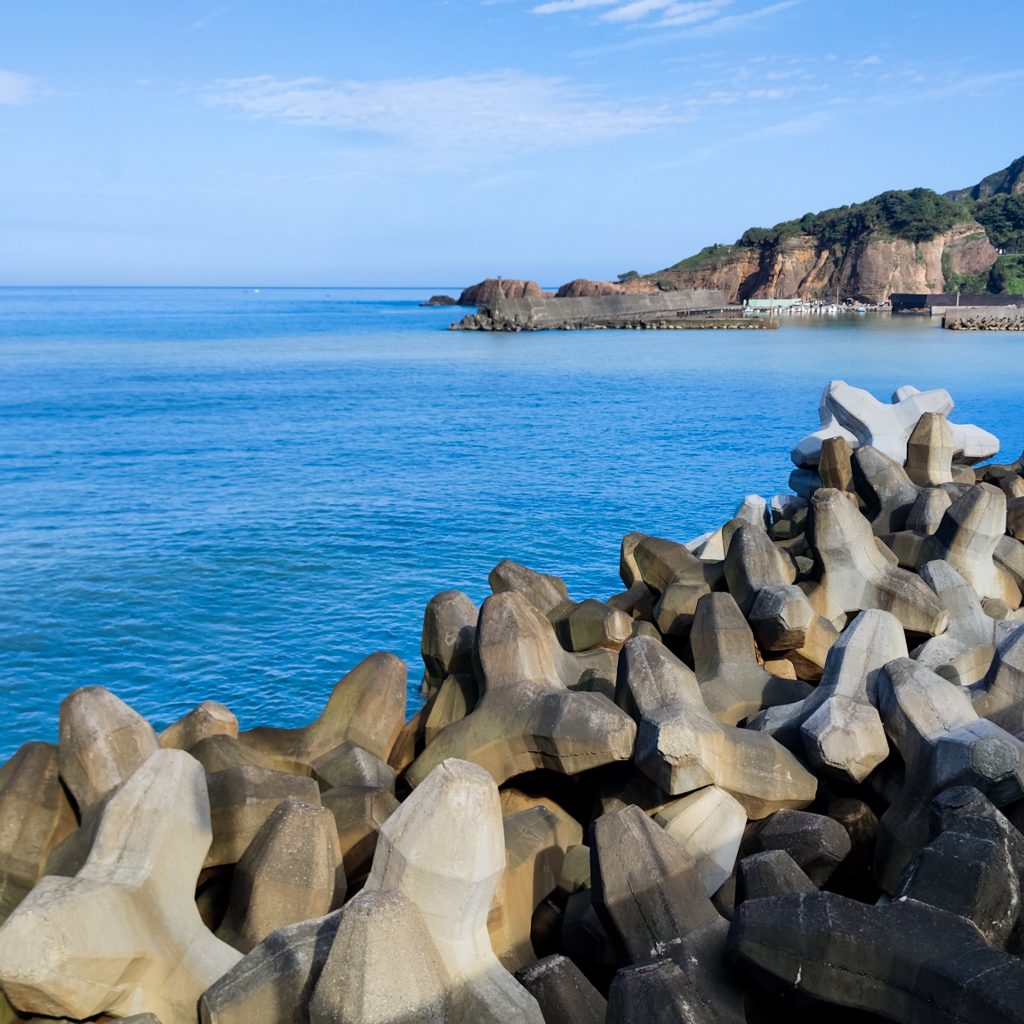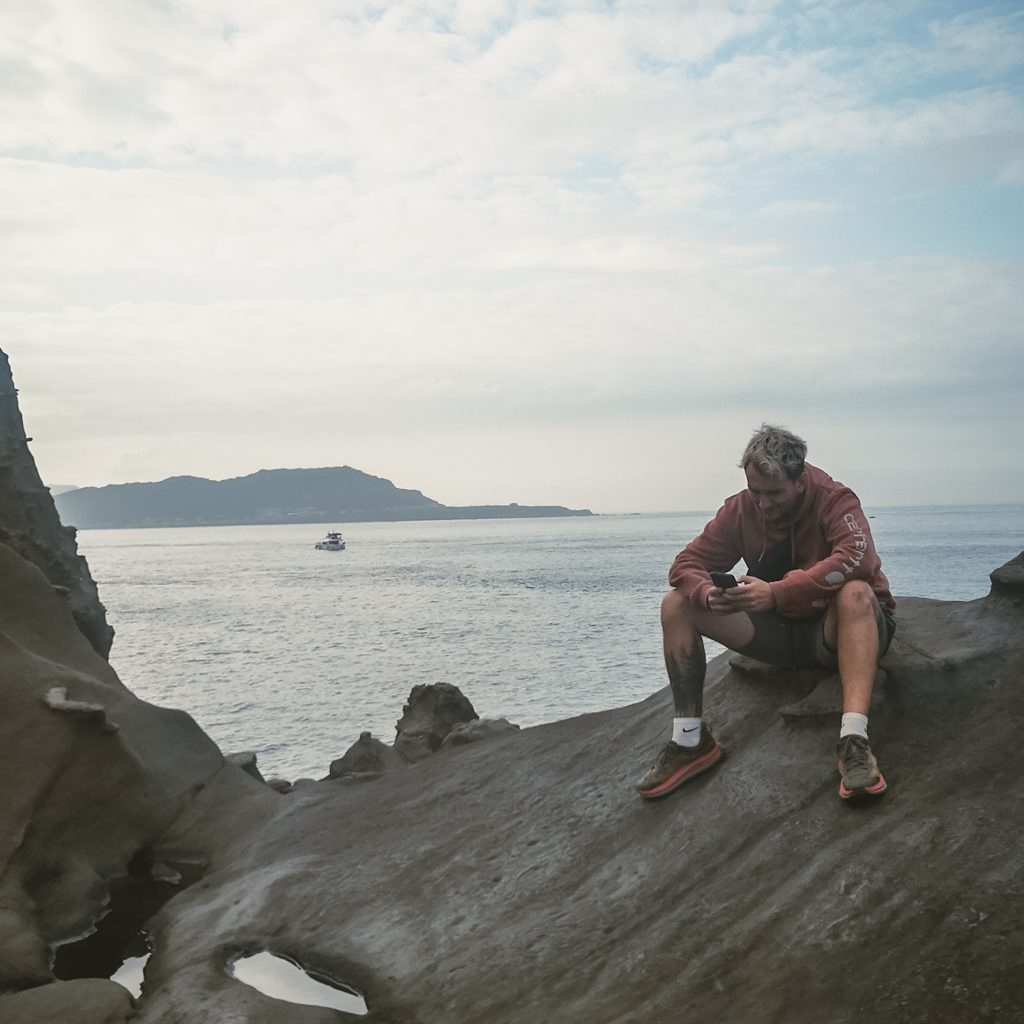 Wir fahren bis zum Ende des Hafens und stellen die Räder ab. Entlang der Küste laufen wir auf großen Steinen, neben uns ein Angler, der mitsamt seiner Ausrüstung nach einem gemütlichen Angelspot Ausschau hält. Die Felsen ähneln irgendwann eher kleinen Pancake-Türmchen, die aus dem Boden zu wachsen scheinen. Direkt am Wasser wachsen leuchtend grüne Algen. An der Spitze der kleinen Halbinsel klatschen die Wellen an die Klippen und das Wasser schäumt hellblau in den Zwischenräumen der rauen Felsen. Wir klettern noch ein bisschen weiter und entdecken ein Pärchen, das es sich mit zwei Campingstühlen oben auf dem Felsen gemütlich gemacht hat. Ein schönes Plätzchen für ein Date zum Sonnenuntergang. Lediglich eine Frage stellen wir uns dann doch noch: Wo ist der Elefant? Müssen wir von der anderen Seite der Halbinsel einen anderen Weg nehmen und den Elefanten aus der richtigen Perspektive zu sehen? Wir sind etwas ratlos und wollen es von der anderen Seite versuchen. Zurück am Parkplatz werfen wir nochmal einen Blick auf die Karte. Das kann nicht sein, es gibt keinen anderen Weg. Wir müssen ihn übersehen haben.