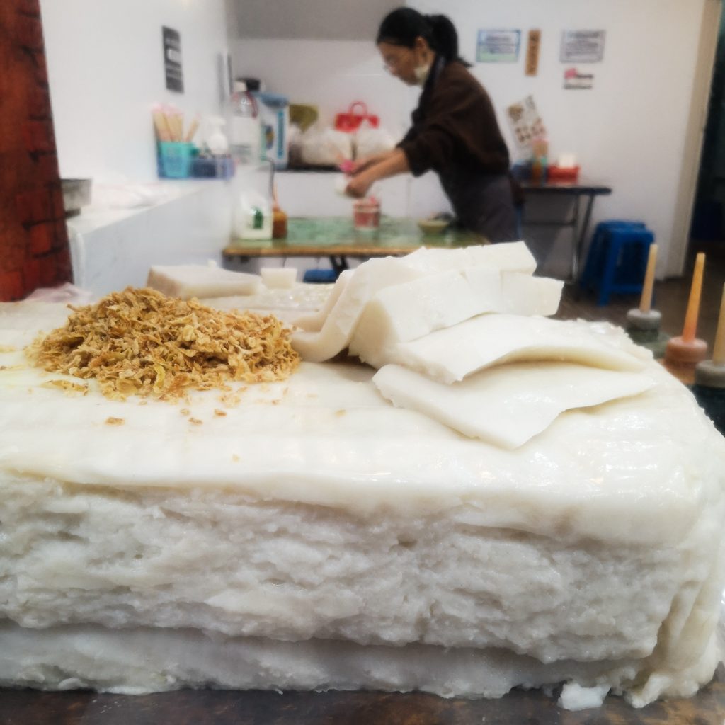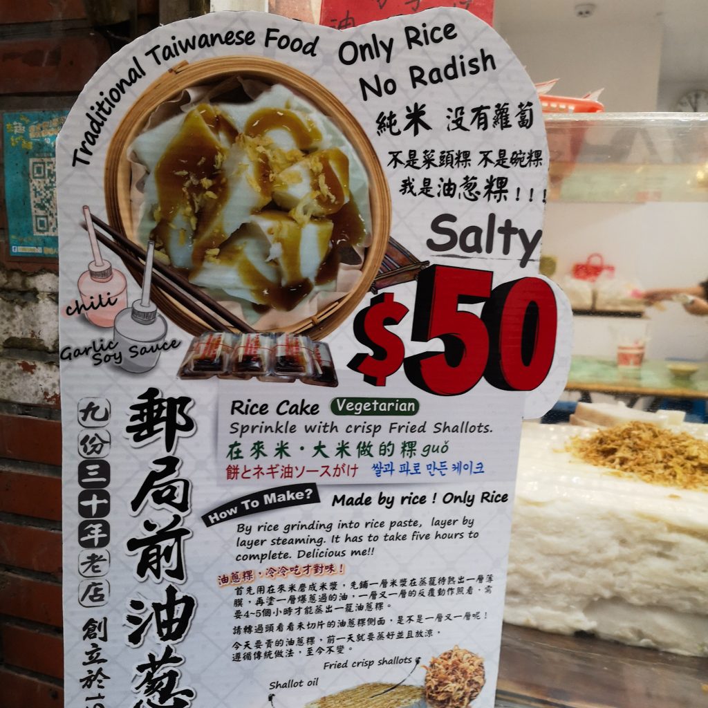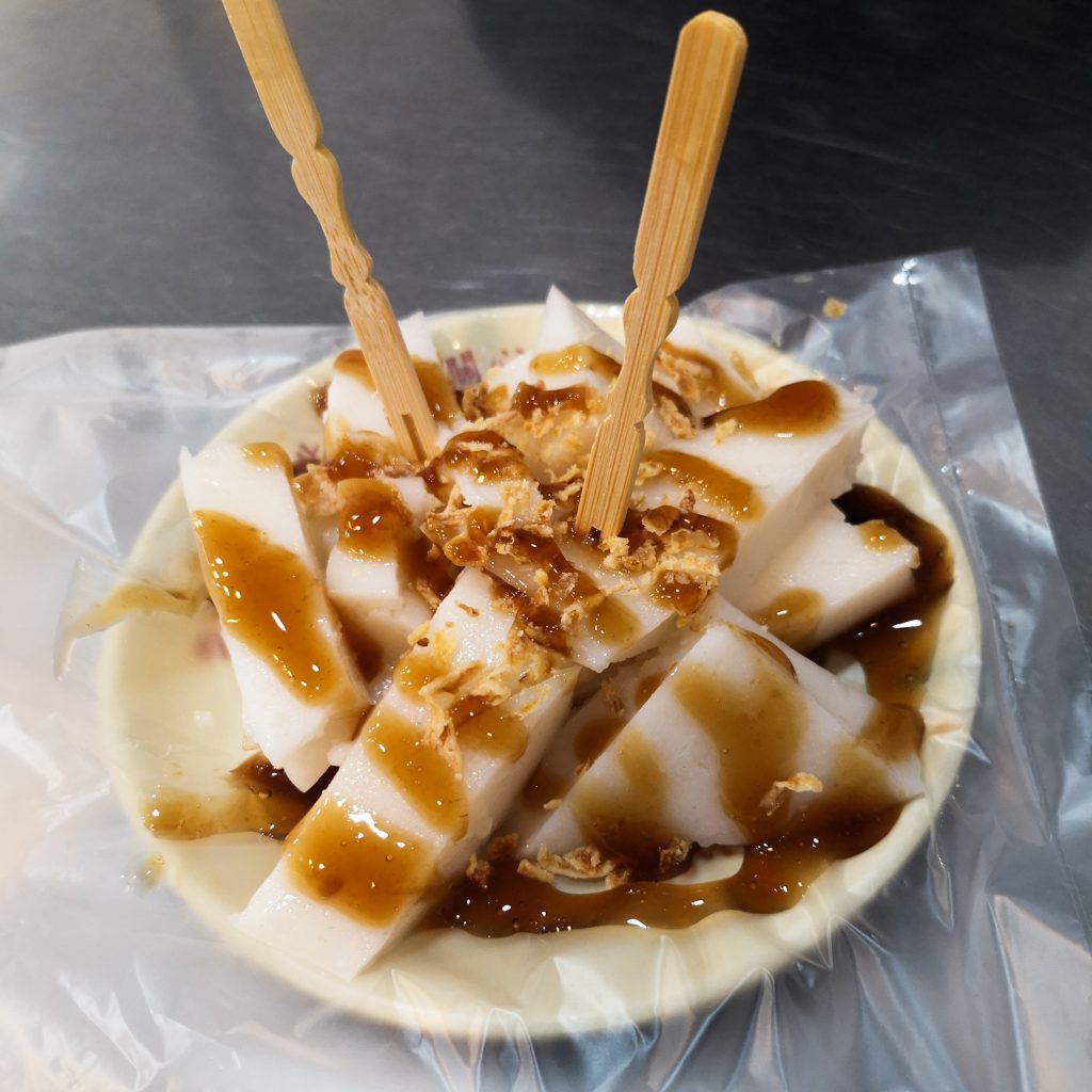 Nachdem wir wieder zurück sind, brauchen wir erstmal einen heißen Kaffee im Family Mart unseres Vertrauens. Der Regen draußen scheint auch immer stärker zu werden. Dennoch wollen wir heute ein zweites Mal über die Old Street laufen. Heute ist viel weniger los als gestern, trotzdem muss man aufmerksam bleiben, damit man keinen Regenschirm ins Auge oder gegen den Kopf gehauen bekommt. Welchen Snack können wir uns heute gönnen? Wir starten mit einer Taro Pastry, ein mit Süßkartoffel gefülltes Gebäck. Es wird für sehr gut gewertet, Caro erinnert es ein kleines bisschen an ungebackenen Keksteig – mhmmm. Da zu Konstis großem Bedauern der Cheese Milk Stick Stand noch nicht geöffnet hat, brauchen wir eine Alternative. Wir entscheiden uns für einen augenscheinlich nicht so ansprechenden Snack: Rice Cake mit gerösteten Zwiebeln. Zur Erklärung steht an der Ladentheke neben einem riesigen Block Rice Cake eine Erläuterung der Speise: By rice grinding into rice paste, layer by layer steaming. It has to take five hours to complete. Dazu gereicht werden frittierte Zwiebeln, quasi Röstzwiebeln. Dieser weiße, glibbrig aussehende Block ist eigentlich wenig verlockend, aber Konsti möchte es probieren. Eine durchaus gute Entscheidung. Die Konsistenz ist weniger glibbrig als gedacht und in Kombi mit Chili- und vor allem der Knoblauch-Sojasoße schmeckt es wirklich sehr gut. Wir teilen uns ein kleines Schälchen und machen uns dann auf den Weg zum Bus.