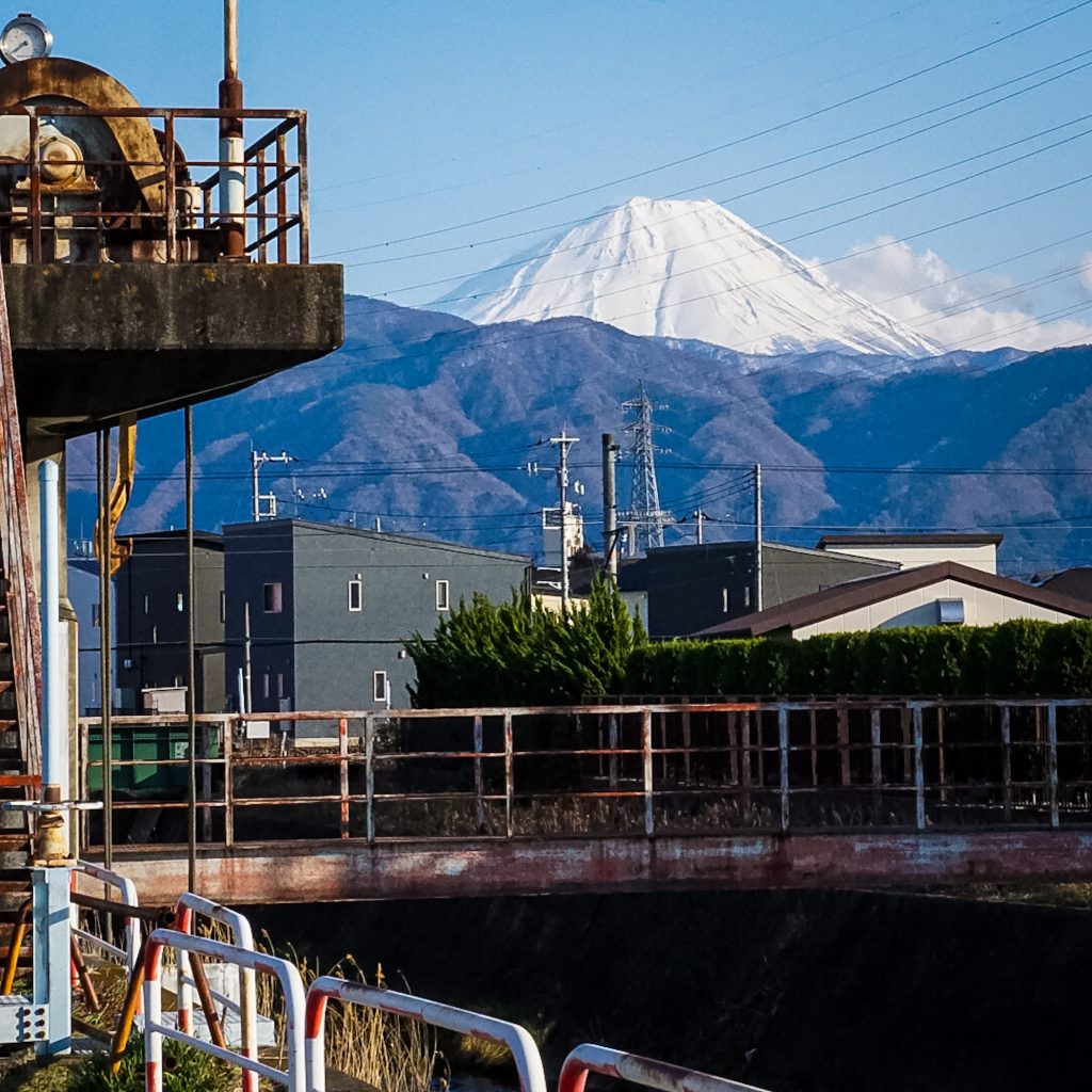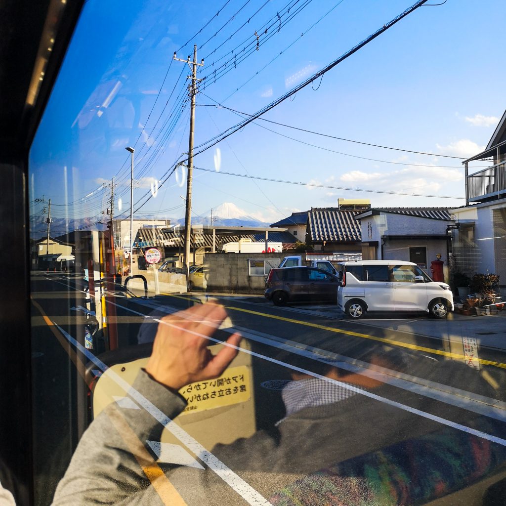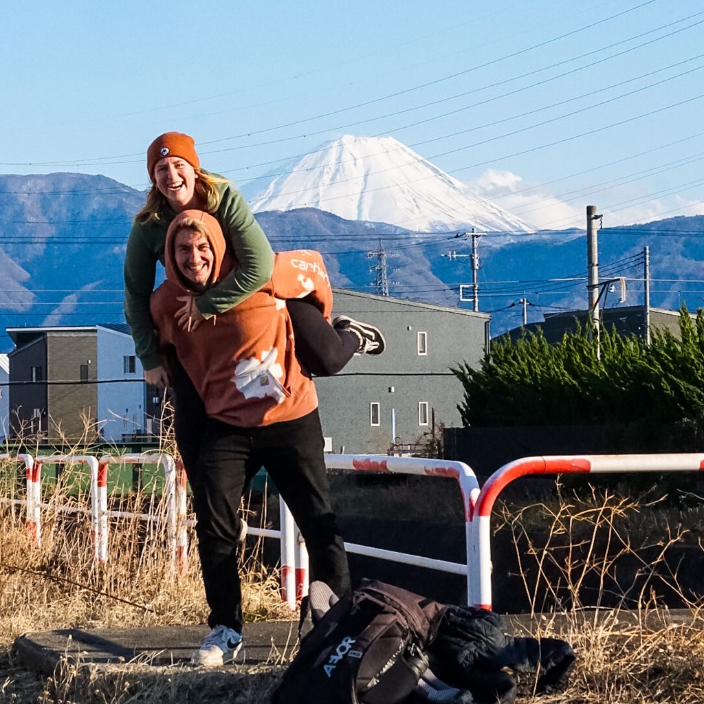 Wir schnallen uns die Rucksäcke auf und begeben uns von der Schnellstraße weg, hier wird sicher kein Bus ins Stadtzentrum kommen. Gelandet sind wir mitten im Nirgendwo, einer kleinen und beschaulichen Vorstadt von Kōfu. Dabei hat selbst Kōfu nur 200.000 Einwohner:innen. In ca. 10 Minuten sollen wir eine Bushaltestelle erreichen, aber dann erregt etwas anderes unsere Aufmerksamkeit: Der kleine weiße Zuckerhut, der plötzlich hinter der nächsten Ecke auftaucht. So nah waren wir ihm noch nie. Heute scheint die Sonne und um den Fuji ist weit uns breit keine Wolke zu sehen. Ein eher selteneres Schauspiel, zumindest ist uns das so zu Ohren gekommen. Wir sind ganz verliebt in diesen Berg, der ja eigentlich ein Vulkan ist. Er wird bei Reisenden aus Social Media gefeiert, es gibt zahlreiche typische Fotomotive und wer kennt diese Fotos nicht? Der Fuji gehört mindestens so sehr zu Japan wie Nintendo, Sushi und der Bullettrain. Trotz des Hypes sind wir tatsächlich auch ein kleines bisschen verliebt, der Fuji ist einfach schön und hat für das Land und seine Menschen eine ganz besondere Bedeutung.