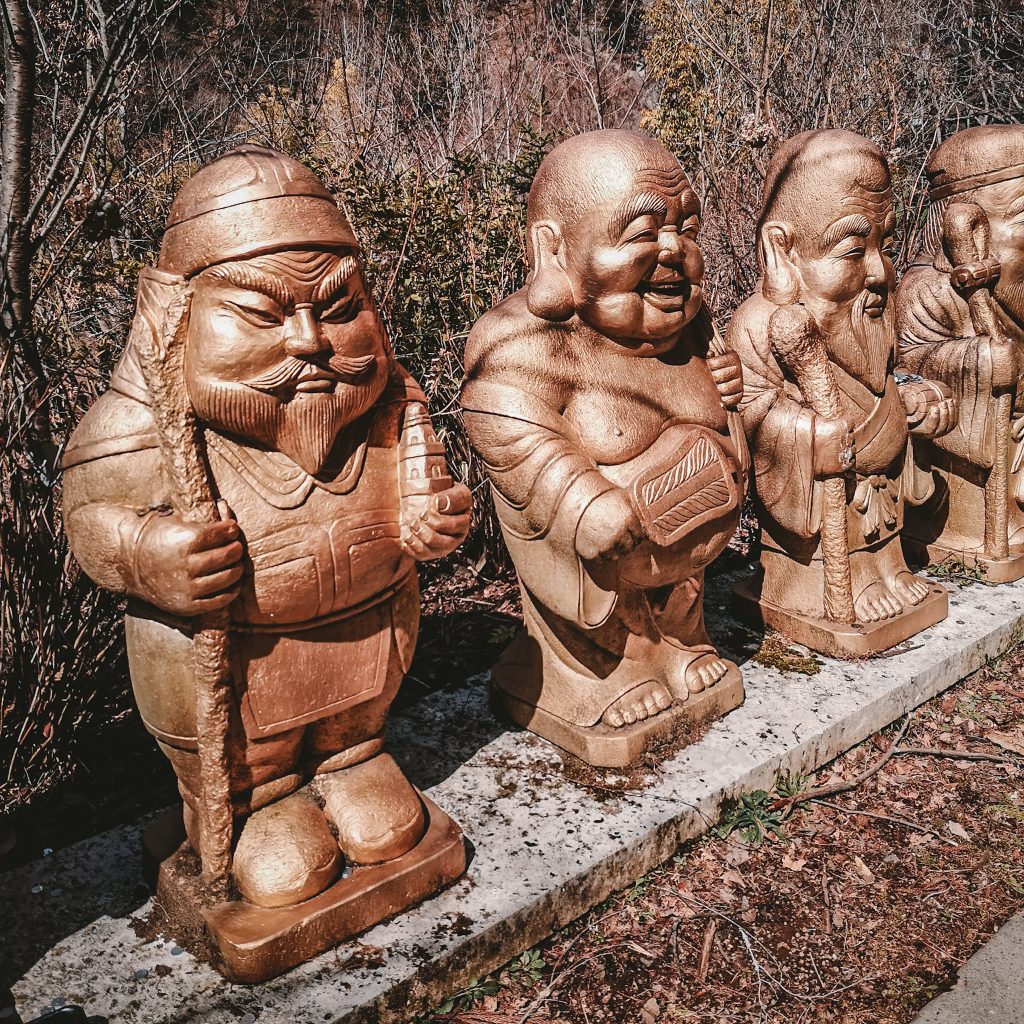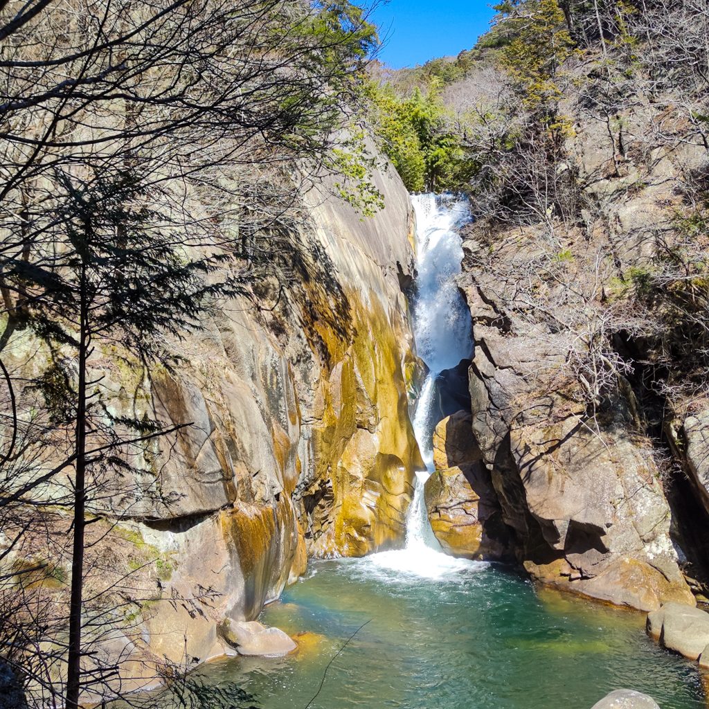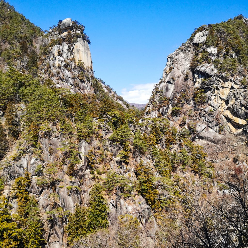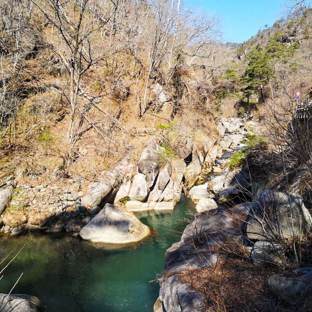 Mit dem Bus fahren wir eine halbe Stunde etwas außerhalb der Stadt. Wir haben uns eine Wanderung durch die Shosenkyo Schlucht herausgesucht. Zur Halbzeit geht es dann nochmal etwas steiler bergauf und wenn wir Glück haben, sehen wir heute noch einmal den Fuji. Mit uns im Bus sitzen übrigens nur ein paar Japaner:innen, bisher haben wir noch keine anderen Touris hier gesehen. Als wir aussteigen werden die anderen Fahrgäste von 2 Männern in Empfang genommen und ihnen wir auf einer japanischen Karte genau erklärt, wie die Wege verlaufen. Einer der beiden bemüht sich auch kurz, uns etwas zu erklären, versteht aber schnell, dass wir absolut kein Wort verstehen und belässt es dann dabei.