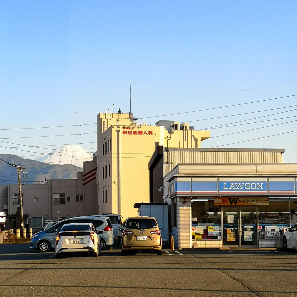 Nachdem wir das ein oder andere Foto gemacht haben, beschließen wir, doch weiter zu gehen. Natürlich haben wir nicht geschaut, wann der nächste Bus kommt und natürlich war es augenscheinlich klar, dass HIER die Busse nicht wie in Tokio alle drei Minuten kommen. Es kommt wie es kommen muss: Unser Bus fährt an uns vorbei und wir verpassen ihn um eine Minute. Auf den nächsten müssen wir eine halbe Stunde warten. Tatsächlich Glück im Unglück, denn der darauffolgende Bus wäre erst 90 Minuten später gekommen. Mit dem Blick auf den Fuji, im Vordergrund die Convenience-Kette Lawson, lässt sich die Wartezeit aber gut rumbringen.
