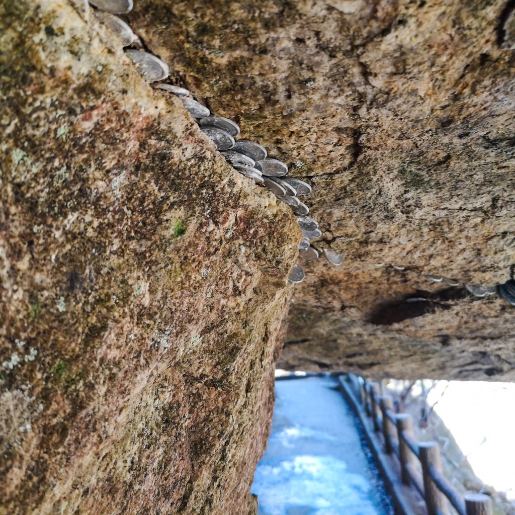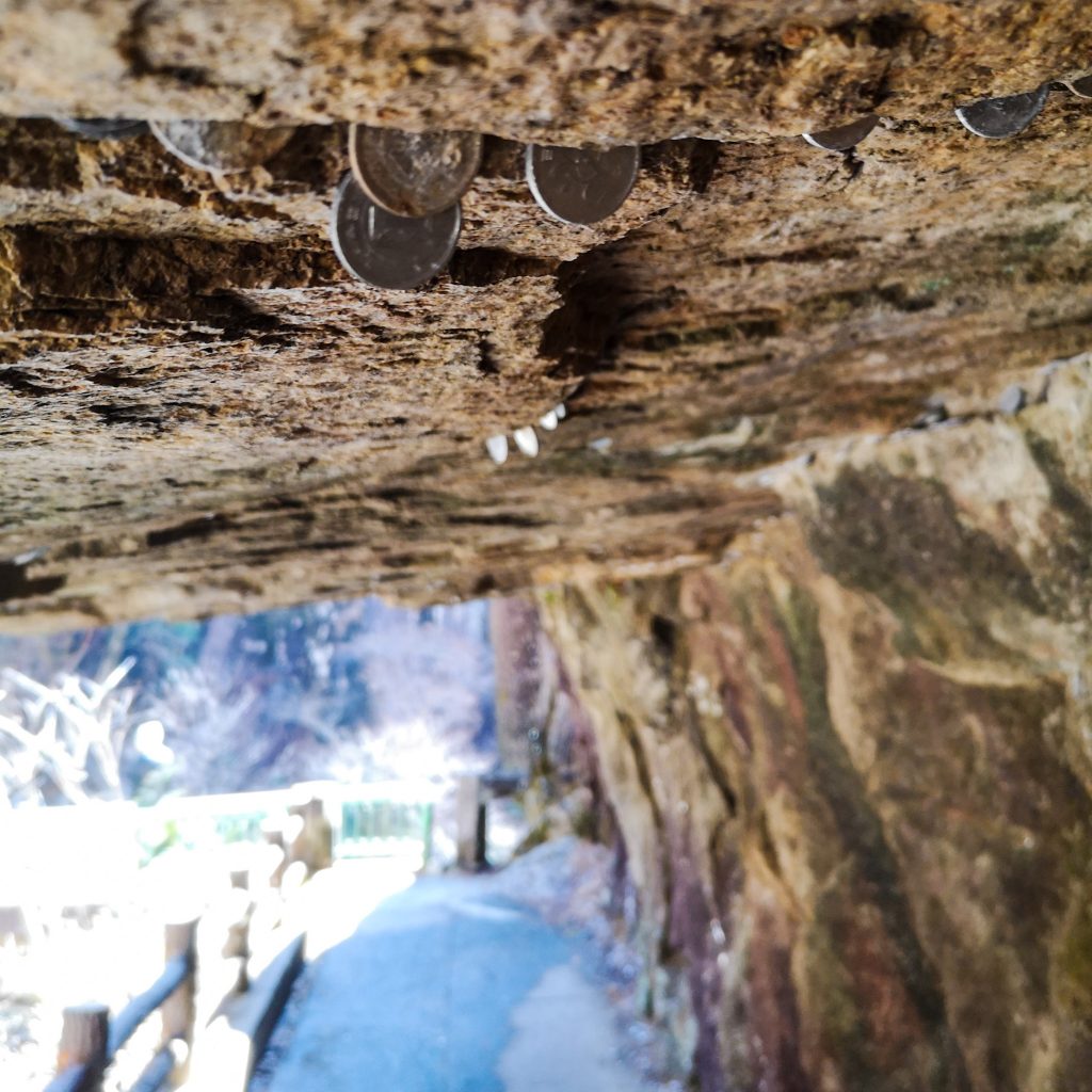 Der nächste Abstecher ist gewollt und führt uns zu einem Wasserfall. Wir wundern wir uns, warum auf dem Boden vor uns lauter 1er Münzen liegen, erst dann fällt uns auf, dass in jeder Felsspalte Münzen stecken. Ein kleiner Schatz beim Wasserfall, zumindest, wenn man alles einsammeln würde.